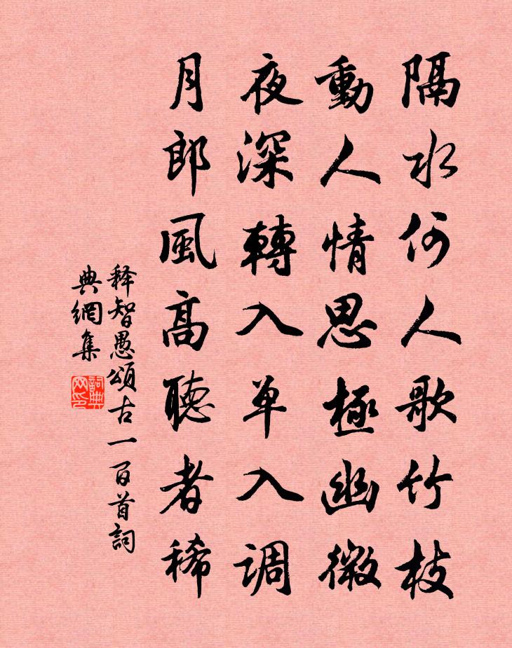 詩詞名句歷史字典書法欣賞書法字典國語詞典說文解字康熙字典古漢語字典標 題 作 者 詩 句 頌古一百首作者:釋智愚 朝代:宋代頌古一百首原文隔水何人歌竹枝,動人情思極幽微。夜深轉入單入調,月郎風高聽者稀。詩詞問答問:頌古一百首的作者是誰?答:釋智愚問:頌古一百首寫於哪個朝代?答:宋代釋智愚頌古一百首書法欣賞頌古一百首書法作品詩詞推薦家有兩瓢分貯酒藥出則使一童負之戲賦五字句陸游〔宋代〕長物消磨盡,猶存兩大瓢。藥能扶囷憊,酒可沃枯焦。童負來山店,人看度野橋。畫工殊好事,傳寫入生綃。宋州月夜感懷儲嗣宗〔唐代〕雁池衰草露沾衣,河水東流萬事微。寂寞青陵台上月,秋風滿樹鵲南飛。攤破浣溪沙/山花子佚名〔宋代〕相恨相思一個人。柳眉桃臉自然春。別離情思,寂寞向誰論。映地殘霞紅照水,斷魂芳草碧連雲。水邊樓上,回首歐陽永叔王原叔二翰林韓子華吳長文二舍人同梅堯臣〔宋代〕桔竹為門扉,不可容車騎。況如鄭廣文,無氊藉賓位。窮冬月破七,貴客聯玉轡。傳騶肅里閭,下榻呼童稚。問我山中姜特立〔宋代〕不到山中久,山寒景益奇。凍泉零雪谷,墜葉弄風絲。贈別山友張蠙〔唐代〕從容無限意,不獨為離群。年長驚黃葉,時清厭白雲。舊山回馬見,寒瀑別家聞。相與存吾道,窮通各自分。哭郎著作鄭愔〔唐代〕詩禮康成學,文章賈誼才。巳年人得夢,庚日鳥為災。書草藏天閣,琴聲入夜台。荒階羅駁蘚,虛座網浮埃。白馬天香汪元量〔宋代〕遲日侵階,和風入戶,朱弦欲奏還倦。一幅鸞箋,五雲飛下,賜予內家琴苑。音隨指動,猶彷佛、虞薰再見。妙處水龍吟 已未春三月,同柔克濟河,中流風雨王惲〔元代〕賦此花詞,且以花經事之後花,重有所花惜雲春流兩岸桃花,驚濤極目吞天去。孤舟纜解,棹歌聲沸,漁*掀舞。歐陽季默以油煙墨二丸見餉各長寸許戲作小詩蘇軾〔宋代〕書窗拾輕煤,佛帳掃余馥。辛勤破千夜,收此一寸玉。痴人畏老死,腐朽同草木。欲將東山松,涅盡南山竹。墨堅臨江仙(杜安人生日)魏了翁〔宋代〕七夕長留河漢女,重陽又屬騷人。只餘八八號佳辰。中和無與擬,摏作一家春。俗事縈人何日了,隨緣女嫁男婚。依韻和武平九月十五日夜北樓望太湖梅堯臣〔宋代〕東吳臨海若,看月上青冥。河漢微分練,星辰淡布螢。細煙沈遠水,重露裛空庭。孤坐饒清興,惟將影對形。春日過奉誠園(一作曲江,一作玉林園)暢當〔唐代〕帝里陽和日,遊人到御園。暖催新景氣,春認舊蘭蓀。詠德先臣沒,成蹊大樹存。見桐猶近井,看柳尚依門。獻地菩提寺南漪堂杜鵑花蘇軾〔宋代〕南漪杜鵑天下無,披香殿上紅氍毹。鶴林兵火真一夢,不歸閬苑歸西湖。永佑陵喻良能〔宋代〕森然一徑趨高爽,郁蔥佳氣遙相望。松聲萬壑奏笙竽,山形千疊開屏障。六言三首劉克莊〔宋代〕南塘登極數袁,平園冊後尾聯。已矣諸老絕筆,勉哉吾子著鞭。僧字止中釋智愚〔宋代〕煉實而食,擇木而棲。靈靈自晦,物物難齊。秋斂巢虛睡穩,夢破月印清溪。南歌子石孝友〔宋代〕草色裙腰展,冰容水鏡開。又還春事破寒來。一夜東風吹綻、後園梅。糯瓮篘香釀,熏爐續麝煤。休驚節物暗相催送頭陀上人赴廬山寺鄭常〔唐代〕僧家無住著,早晚出東林。得道非真相,頭陀是苦心。持齋山果熟,倚錫野雲深。溪寺誰相等,香花與梵音。續青城山四詠飛赴寺文同〔宋代〕平林露層巘,上獨置孤寺。群仙馭飛駕,往往赴於此。風高幡影亂,日落鐘聲起。誰可謂詩豪,興來吟萬紙。名句推薦柳梢聽得黃鸝語,此是春來第一聲。楊載《到京師》 舉頭望明月,低頭思故鄉。李白《靜夜思》 若到江南趕上春,千萬和春住。王觀《卜運算元·送鮑浩然之浙東》 滿羅衫是酒,香痕凝處,唾碧啼紅相半。張翥《陌上花·有懷》 野渡舟橫,楊柳綠陰濃。謝逸《江神子·杏花村館酒旗風》 欲系青春,少住春還去。朱淑真《蝶戀花·送春》 棠梨葉落胭脂色,蕎麥花開白雪香。王禹偁《村行·馬穿山徑菊初黃》 宴爾新婚,以我御窮。佚名《谷風》 胡風吹代馬,北擁魯陽關。李白《豫章行》 情知已被山遮斷,頻倚闌乾不自由。辛棄疾《鷓鴣天·晚日寒鴉一片愁》