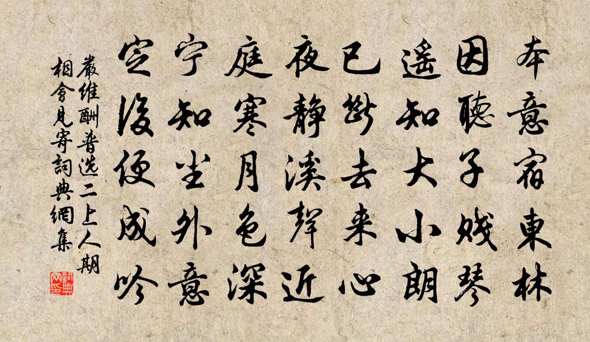 詩詞名句歷史字典書法欣賞書法字典國語詞典說文解字康熙字典古漢語字典標 題 作 者 詩 句 酬普選二上人期相會見寄作者:嚴維 朝代:唐代酬普選二上人期相會見寄原文本意宿東林,因聽子賤琴。遙知大小朗,已斷去來心。夜靜溪聲近,庭寒月色深。寧知塵外意,定後便成吟。詩詞問答問:酬普選二上人期相會見寄的作者是誰?答:嚴維問:酬普選二上人期相會見寄寫於哪個朝代?答:唐代問:酬普選二上人期相會見寄是什麼體裁?答:五律嚴維酬普選二上人期相會見寄書法欣賞酬普選二上人期相會見寄書法作品注釋全唐詩:卷263_33詩詞推薦吳門春雨高蟾〔唐代〕吳甸落花春漫漫,吳宮芳樹晚沈沈。王孫不耐如絲雨,罥斷春風一寸心。烏引雛韋應物〔唐代〕日出照東城,春烏鴉鴉雛和鳴。雛和鳴,羽猶短。巢在深林春正寒,引飛欲集東城暖。群雛縭褷睥睨高,舉翅不及秋晚偶成二首楊時〔宋代〕風飄淅瀝鬧諸鄰,卻掃衡門溷世塵。天氣清明秋意熊,夜光浮動月精神。流年漸覺侵雙鬢,生理從來付大鈞。臨水呈陸嚴州五首趙蕃〔宋代〕簿領古白下,檄書走臨川。陳詩道所懷,奈此巍巍然。臨分得聞見,語以故有連。此意亦厚矣,乖離今十年。和子由寒食蘇軾〔宋代〕寒食今年二月晦,樹林深翠已生煙。繞城駿馬誰能借,到處名園意盡便。但掛酒壺那計盞,偶題詩句不須編。忽聞一翦梅佚名〔宋代〕漠漠春陰酒半酣。風透春衫。雨透春衫。人家蠶事欲眠三。桑滿筐籃。柘滿筐籃。先自離懷百不堪。檣燕呢喃。梁戌婦詞三首劉克莊〔宋代〕織錦為書寄雁飛,功名從古恨無機。良人白首沙場裡,何日封侯建節歸。醉蓬萊(壽友人母)吳季子〔宋代〕正淡煙疏雨,梅子黃時,清和天氣。阿母當年,暫輟瑤池會。霞帔星冠,霓旌羽纛,下碧霄雲際。恰與瞿曇,同時癸本中冬四日江行鄭剛中〔宋代〕新寒盪餘暑,小雨結離愁。行人向西去,江水自東流。我趁孤船歸,迴腸車萬周。假寐槳聲中,清夢何悠悠。恍若靈著祠劉克莊〔宋代〕甘寧關羽至今傳,名將為神自古然。生不封侯三萬戶,死猶廟食數千年。翠羽吟蔣捷〔宋代〕泛言仙,似乎寡味,越調之曲與梅花宜,羅浮梅花,真仙事也。演而成章,名翠羽吟。紺露濃。映素空。樓觀峭玲游僊陸游〔宋代〕飄飄鸞鶴杳難攀,萬里東遊海上山。應有世人遙稽首,紫簫余調落雲間。古樂府晃沖之〔宋代〕大星何歷歷,小星爛如石。掖垣崔嵬橫紫微,十二羽林森北極。今夕何夕月谷沒,虎抱空關龍厭直。崢嶸北斗著地秋夜作錢起〔唐代〕萬計各無成,寸心日悠漫。浮生竟何窮,巧曆不能算。流落四海間,辛勤百年半。商歌向秋月,哀韻兼浩嘆。寤寐窮冬曲江閒步裴夷直〔唐代〕雪盡南坡雁北飛,草根春意勝春暉。曲江永日無人到,獨繞寒池又獨歸。寄黃子耕趙蕃〔宋代〕誰能一枉林間寺,君獨屢過湖上村。先世文章出遺逸,當家句法有淵源。平生所識蓋無幾,盛意若何如見存。元佑詠史詩居延胡曾〔唐代〕漠漠平沙際碧天,問人云此是居延。停驂一顧猶魂斷,蘇武爭禁十九年。游普向十首陳造〔宋代〕崇岡回首路縈盤,夕照明邊小憑欄。船合淺沙催客上,玻璃影里見長安。昇平詞十首(樂府作昇平樂)薛能〔唐代〕瑞氣繞宮樓,皇居信上游。遠岡連聖祚,平地載神州。會合皆重譯,潺湲近八流。中興豈假問,據此自千秋。寥泬觀邵不疑學士所藏名書古畫梅堯臣〔宋代〕野性好書畫,無力能自致。每遇高趣人,常許出以視。邵侯多奇玩,留我特開笥。首觀阮與杜,驢上瞑目醉。韓乾名句推薦晚日寒鴉一片愁。柳塘新綠卻溫柔。辛棄疾《鷓鴣天·晚日寒鴉一片愁》 世事短如春夢,人情薄似秋雲。朱敦儒《西江月·世事短如春夢》 壚邊人似月,皓腕凝霜雪。韋莊《菩薩蠻·人人盡說江南好》 天際兩蛾凝黛,愁與恨、幾時極。韓元吉《霜天曉角·題採石蛾眉亭》 人生不可安閒,有恆業,才足收放心王永彬《圍爐夜話·第八三則》 閉口深藏舌,安身處處牢。馮夢龍《醒世恆言·卷三十五》 兩行疏柳,一絲殘照,萬點鴉棲。劉基《眼兒媚·秋思》 相思血,都沁綠筠枝。姜夔《小重山令·賦潭州紅梅》 畫樓洗淨鴛鴦瓦,彩繩半濕鞦韆架。王元鼎《醉太平·寒食》 天地之大也,人猶有所憾。故君子語大,天下莫能載焉,語小,天下莫能破焉。子思《中庸·第十二章》