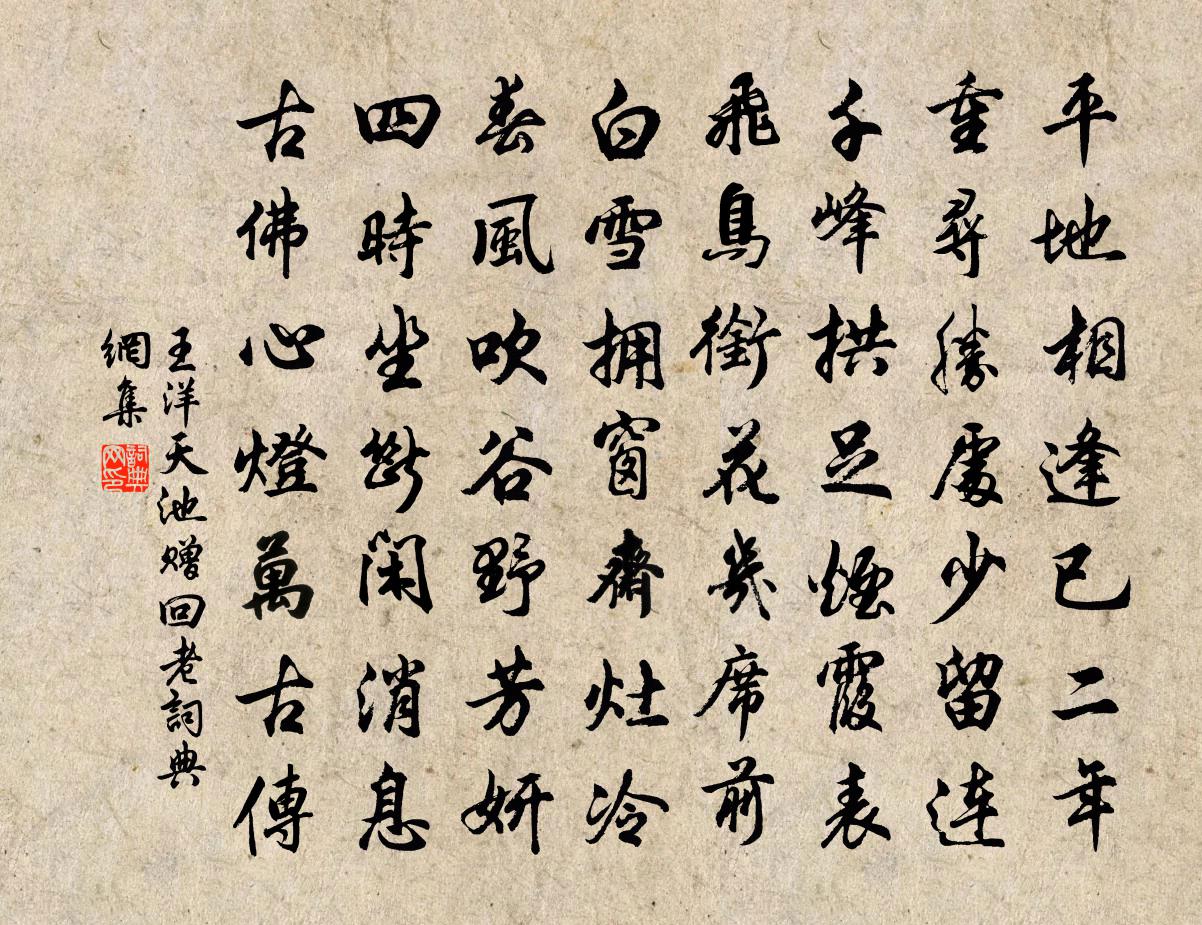 詩詞名句歷史字典書法欣賞書法字典國語詞典說文解字康熙字典古漢語字典標 題 作 者 詩 句 天池贈回老作者:王洋 朝代:宋代天池贈回老原文平地相逢已二年,重尋勝處少留連。千峰拱足煙霞表,飛鳥銜花幾席前。白雪擁窗齋灶冷,春風吹谷野芳妍。四時坐斷閒訊息,古佛心燈萬古傳。詩詞問答問:天池贈回老的作者是誰?答:王洋問:天池贈回老寫於哪個朝代?答:宋代王洋天池贈回老書法欣賞天池贈回老書法作品詩詞推薦寄懷劉使君梅堯臣〔宋代〕昔我從仲父,三年在河內。春遊丹水上,花木弄粉黛。人夸走馬來,盡眼看沒背。薄暮半醉歸,插花紅簇隊。使君和徐判院見惠詩篇姜特立〔宋代〕吊往文高古戰場,麗天星斗射寒芒。也知深奪曹劉氣,不用濃熏班馬香。和賈閣老三首胡寅〔宋代〕來朝杲日破頑陰,共指秋成喜不禁。寸碧遙岑供眺望,長空飛鳥自消沉。四時景物千鍾酒,萬古功名一寸心。尚愧皇帝閣春帖子趙湘〔唐代〕和氣生金殿,微風轉畫旗。年年好春色,先是帝先知。憑何十一少府邕覓榿木栽杜甫〔唐代〕草堂塹西無樹林,非子誰復見幽心。飽聞榿木三年大,與致溪邊十畝陰。聞田家插秧已畢王炎〔宋代〕聞道田家日夜愁,黃雲白雪不全收。稻畦插遍青如染,滿望今年倍有秋。蕭灑桐廬郡十絕范仲淹〔宋代〕蕭灑桐廬郡,烏龍山靄中。使君無一事,心共白雲空。次韻湯叔遜謝筆墨長句馬廷鸞〔宋代〕南屏翁,斯文千古何終窮,清輝靈氣鬥牛充。我從公家二老話此事,寒更支坐燭跋紅。哀哉人琴俱亡天地覆,有刀山樓枕上潘獻可〔宋代〕山近寒偏草,愁多睡不沈。鴉啼半夜月,鶴唳五更風。曉接殘燈里,吟成落葉中。塵埃今已厭,懶聽上方鍾。張法曹歸闕梅堯臣〔宋代〕海底日未上,屋頭群雀喧。晨興溪館迥,坐聽櫓聲煩。出戶望行舸,羨心如野猿。暮春余亦去,為見故人言。村居述懷魏野〔宋代〕布褐楮皮冠,朝昏信自然。眼明山雨後,發亂晚風前。鶴病生閒惱,僧來廢靜眠。自知慵懶性,至死豈能悛。翦牡丹感懷陸游〔宋代〕雨聲點滴漏聲殘,短褐猶如二月寒。閉戶自憐今伏老,聯鞍誰記舊追歡?欲持藤榼沽春碧,自傍朱欄翦牡丹。不為頌古一○一首釋子淳〔宋代〕白頭童子智尤長,半夜三更渡渺茫。任支往來無間斷,不消船艇與浮囊。探梅顧逢〔宋代〕探梅自策短筇來,是處溪山到一回。歲歲見花人已老,幾番花落又花開。秋晚雜書三十首方回〔宋代〕去年歸我廬,移菊於鄰家。今年灌我畦,百本余秋華。閱時十二朔,暄涼更韭瓜。逋債之所叢,詆詬紛交加。燃頭春申君楊維楨〔元代〕春申君,見利重,見理蒙。保相印,封江東,李家女兒入楚宮。春申滅國並滅嗣,舍人入相遺腹子。送李道士歸南嶽張喬〔唐代〕千峰隔湘水,迢遞掛帆歸。掃月眠蒼壁,和雲著褐衣。洞虛懸溜滴,徑狹長松圍。只恐相尋日,人間舊識稀。夏日游目聊作駱賓王〔唐代〕暫屏囂塵累,言尋物外情。致逸心逾默,神幽體自輕。浦夏荷香滿,田秋麥氣清。詎假滄浪上,將濯楚臣纓。句丁謂〔宋代〕幾處園林蕭索里。和潘大卿芍藥二首吳芾〔宋代〕拂拂輕黃染御衣,出群標韻異繁枝。此身已分京華隔,不謂天香尚許披。名句推薦自重者然後人重,人輕者便是自輕。佚名《增廣賢文·下集》 令必行,禁必止。韓非及後人《韓非子·飾邪》 綠槐煙柳長亭路,恨匆忙分離去。惠洪《青玉案·綠槐煙柳長亭路》 落月滿屋樑,猶疑照顏色。杜甫《夢李白二首·其一》 雨落不上天,水覆難再收。李白《妾薄命》 佳人彩雲里,欲贈隔遠天。李白《折荷有贈》 梨花院落溶溶月,柳絮池塘淡淡風。晏殊《無題·油壁香車不再逢》 殘月臉邊明,別淚臨清曉牛希濟《生查子·春山煙欲收》 父母在,不遠遊,遊必有方。孔子弟子《論語·里仁篇》 桃花塢裏桃花庵,桃花庵裏桃花仙。唐寅《桃花庵歌》