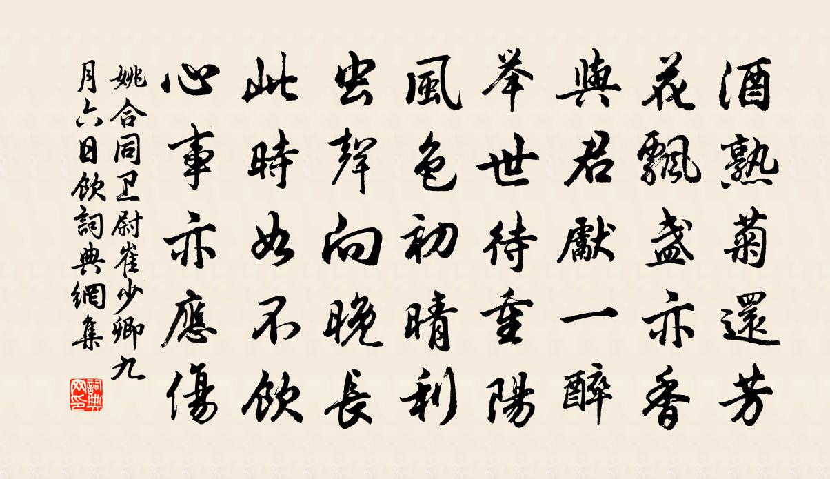 詩詞名句歷史字典書法欣賞書法字典國語詞典說文解字康熙字典古漢語字典標 題 作 者 詩 句 同衛尉崔少卿九月六日飲作者:姚合 朝代:唐代同衛尉崔少卿九月六日飲原文酒熟菊還芳,花飄盞亦香。與君先一醉,舉世待重陽。風色初晴利,蟲聲向晚長。此時如不飲,心事亦應傷。詩詞問答問:同衛尉崔少卿九月六日飲的作者是誰?答:姚合問:同衛尉崔少卿九月六日飲寫於哪個朝代?答:唐代問:同衛尉崔少卿九月六日飲是什麼體裁?答:五律姚契約衛尉崔少卿九月六日飲書法欣賞同衛尉崔少卿九月六日飲書法作品注釋全唐詩:卷498-40詩詞推薦贈謫者王建〔唐代〕何罪過長沙,年年北望家。重封嶺頭信,一樹海邊花。卜運算元(夢中作)李太古〔宋代〕盡道是傷春,不似悲秋怨。門外分明見遠山,人不見,空腸斷。朝來一霎晴,薄暮西風遠。卻憶黃花小雨聲,誤落江路見梅懷泉台留主管王提乾曾豐〔宋代〕強號梅為自在春,淡妝貴不失天真。園林爛熳空多事,籬落伶俜倒出塵。無竹無松自風韻,得江得月更精神。清高烏夜啼(八之六)陸游〔宋代〕園館青林翠樾,衣巾細葛輕紈。好風吹散霏微雨,沙路喜新乾。小燕雙飛水際,流鶯百囀林端。投壺聲斷彈棋罷,十二月二十七日病起行花下聞春禽有感舒岳祥〔宋代〕昨日立春節,今晨春鳥鳴。前峰宿蒼靄,風聲和且平。南翁病來久,起繞花枝行。花枝向人笑,婉孌感幽情。摩挲憶帝京·薄衾小枕涼天氣柳永〔宋代〕薄衾小枕涼天氣,乍覺別離滋味。展轉數寒更,起了還重睡。畢竟不成眠,一夜長如歲。 也擬待、卻回征轡;又題關彥長孤山四照閣鄭獬〔宋代〕湖山天下之絕境,群山繞湖千百重。碧筍四插明鏡外,此閣正落明鏡中。綠波一穗掃沙尾,擁門儘是紅芙蓉。清香和韓子華寄東華市玉版鮓梅堯臣〔宋代〕客從都下來,遠遺東華鮓。荷香開新包,玉臠識舊把。色絜已可珍,味佳寧獨舍。莫問魚與龍,予非博物者。藍田溪雜詠二十二首古藤錢起〔唐代〕引蔓出雲樹,垂綸覆巢鶴。幽人對酒時,苔上閒花落。鳳銜杯晏殊〔宋代〕柳條花纇惱青春。更那堪、飛絮紛紛。一曲細清脆、倚朱唇。斟綠酒、掩紅巾。追往事,惜芳唇。暫時間、留住行假日書事陸游〔宋代〕萬里西來為一飢,坐曹日日汗沾衣。但嫌憂畏妨人樂,不恨疏慵與世違。雕檻迎陽花並發,畫梁避雨燕雙歸。放懷牆西樹王安石〔宋代〕牆西高樹結陰稠,步屣窮年向此留。白日屢移催我老,清風一至使人愁。紛紛暝鳥驚還合,渺渺涼蟬咽欲休。回首書桐葉佚名〔唐代〕拭翠斂蛾眉,鬱郁心中事。搦管下庭除,書成相思字。此字不書石,此字不書紙。書在桐葉上,願逐秋風起。天下昔在九江與蘇伯固唱和其略曰我夢扁舟浮震澤蘇軾〔宋代〕覺而思之蓋南華賜物也豈復與伯固相見於此耶今得來書已在南華相待數日矣感嘆不已故先寄此詩扁舟震澤定何時,醉眠亭四首晁端佐〔宋代〕盤石幽亭樂未央,是非窮達兩相忘。塵寰下望知何許,爛醉高眠自有鄉。滿替在眼即景賦二首董嗣杲〔宋代〕野分霜信薄,溪落雨痕乾。僻邑催冬早,遙林積暝寒。雞棲隱壞壁,鶴老戀空關。燭下哀箏發,樓頭送漏殘。鶴楊億〔宋代〕帳望青田碧草齊,帝鄉歸路阻丹梯。露濃漢苑宵猶警。雪滿梁園晝乍迷。瑞世鸞皇徒自許,繞枝烏鵲未成棲。終年題方士繇伯謨五丈所居三首趙蕃〔宋代〕詩名舊仰方豐國,句法親傳呂紫微。聞道有兒能世業,師門更向晦庵歸。夏日韓偓〔唐代〕庭樹新陰葉未成,玉階人靜一蟬聲。相風不動烏龍睡,時有嬌鶯自喚名。偈頌一百四十一首釋師範〔宋代〕名不得,狀不得,復是何物。見得到,用得親,不由別人。有時恁麽,有時不恁麽, * 鷂子貼天飛,帶角大蟲當名句推薦終日望君君不至,舉頭聞鵲喜。馮延巳《謁金門·風乍起》 興盡晚回舟,誤入藕花深處。李清照《如夢令·常記溪亭日暮》 小橋橫截,缺月初弓。辛棄疾《沁園春·靈山齋庵賦時築偃湖未成》 事以密成,語以泄敗。韓非及後人《韓非子·說難》 城中桃李愁風雨,春在溪頭薺菜花。辛棄疾《鷓鴣天·陌上柔桑破嫩芽》 傷心千里江南,怨曲重招,斷魂在否?吳文英《鶯啼序·春晚感懷》 騁望因高雲外盡,鄉關回首愧煙蘿。石茂華《九月九日登長城關》 天將降大任於是人也,必先苦其心志,勞其筋骨,餓其體膚,空乏其身,行拂亂其所為。孟子《孟子·告子章句下·第十五節》 千門開鎖萬燈明,正月中旬動帝京。張祜《正月十五夜燈》 風吹仙袂飄颻舉,猶似霓裳羽衣舞白居易《長恨歌》