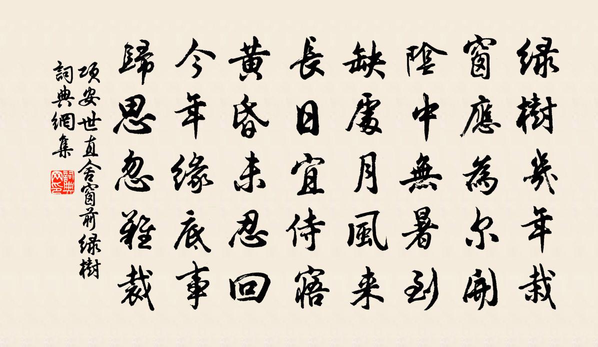 詩詞名句歷史字典書法欣賞書法字典國語詞典說文解字康熙字典古漢語字典標 題 作 者 詩 句 直舍窗前綠樹作者:項安世 朝代:宋代直舍窗前綠樹原文綠樹幾年栽,窗應為爾開。陰中無暑到,缺處月風來。長日宜侍寤,黃昏未忍回。今年緣底事,歸思忽難裁。詩詞問答問:直舍窗前綠樹的作者是誰?答:項安世問:直舍窗前綠樹寫於哪個朝代?答:宋代項安世直舍窗前綠樹書法欣賞直舍窗前綠樹書法作品詩詞推薦縱筆蘇軾〔宋代〕白頭蕭散滿霜風,小閣藤床寄病容。報導先生春睡美,道人輕打五更鐘。贈術士陳談天王邁〔宋代〕我生之辰日在亢,鬥牛之宿晻無耀。獨有首尾二{左武右虎}星,角立昴氐爭擊標。一生奇蹇良苦之,已分青雲輸河陰新城雍陶〔唐代〕高城新築壓長川,虎踞龍盤氣色全。五里似雲根不動,一重如月暈長圓。河流暗與溝池合,山色遙將睥睨連。自有黃筌鵲雛文同〔宋代〕短羽已褵褷,弱脛方屴岌。母也向何處,開口猶仰食。初寒獨居戲作陸游〔宋代〕開殼得紫栗,帶葉摘黃甘。獨臥維摩室,誰同彌勒龕?宗文樹雞柵,靈照挈蔬籃。一段無生話,燈籠可與談。南徐題友人郊居吳仁璧〔唐代〕門前樵徑連江寺,岸下漁磯系海槎。待到秋深好時節,與君長醉隱侯家。夏口送屈突司直使湖南劉長卿〔唐代〕共悲來夏口,何事更南征。霧露行人少,瀟湘春草生。鶯啼何處夢,猿嘯若為聲。風月新年好,悠悠遠客情。緣識宋太宗〔宋代〕日月何忙忙,相逢有出沒。催將壯志心,少年如頃克。人生苦海中,否泰知通塞。四季倏忽來,寒暑變為賊。偷人題朝陽亭李洪〔宋代〕新亭危冠別峰西,萬壑千岩勢總低。要使登臨高著眼,梧桐應有鳳凰棲。梁分宮女孫元晏〔唐代〕滌盪齊宮法令新,分張宮女二千人。可憐無限如花貌,重見世間桃李春。題清勝軒壁白玉蟾〔宋代〕奇花兩朵香一爐,片心無事便清虛。壁頭有琴床有劍,浩歌梵曲聲虛徐。物外志趣本不俗,山軒清勝萬事足。自勸通山李傳正〔宋代〕我愛愛羊好,清無一點塵。峭山多洞戶,樵牧識仙人。城南雜詠二十首蘭澗張栻〔宋代〕藝蘭北澗側,澗曲風紆餘。原言植根固,芬芳長慰予。出北門記所見二首趙蕃〔宋代〕我行舒州來,觸目嘆荒棘。今經北門道,麻麥殊翳密。乃知人力愆,地固有遺殖。安得遍厥耕,疲羸當少息。偈頌二百零五首釋正覺〔宋代〕主中之主天中天。家勢金輪萬代傳。退步不居尊貴位,借功卻作誕生緣。廓虛印上無瑕垢,明白機頭有轉旋。劫數洞仙歌佚名〔宋代〕千崖滴翠。正秋高時候。橙黃橘綠又重九。有蓬壺仙子、赤鯉來游,風雲會,施展經綸妙手。去年稱壽處,北斗天貽王秀才齊己〔唐代〕功到難搜處,知難始是詩。自能探虎子,何慮屈男兒。此道真清氣,前賢早白髭。須教至公手,不惜付舟枝。郊廟歌辭享文敬太子廟樂章請神許孟容〔唐代〕觴牢具品,管磬有節。祝道夤恭,神儀昭晰。桐圭早貴,象輅追設。聲達樂成,降歆豐潔。頌古三十九首釋道樞〔宋代〕一番雨過一番晴,蠶眼已開桑眼青。鵓鳩樹頭啼不已,百舌黃鸝相共鳴。辟戴帥初食長菜陳著〔宋代〕漂泊無家杜少陵,兵閒奔走如蓬萍。碧澗香芹因可嗜,膾鯉豈厭銀絲精。百謫九死蘇玉局,到處為鄉心自足。有時名句推薦又莫是東風逐君來,便吹散眉間一點春皺蘇軾《洞仙歌·詠柳》 江上雪,獨立釣漁翁。李綱《望江南·江上雪》 人過留名,雁過留聲。佚名《增廣賢文·下集》 夜覺曉非,今悔昨失顏之推《顏氏家訓·序致篇》 萬里雲間戍,立馬劍門關。崔與之《水調歌頭·題劍閣》 稚子金盆脫曉冰,彩絲穿取當銀錚。楊萬里《稚子弄冰》 一夜雨聲涼到夢,萬荷葉上送秋來。陳文述《夏日雜詩》 年年戰骨埋荒外,空見蒲桃入漢家。李頎《古從軍行》 殘雪庭陰,輕寒簾影,霏霏玉管春葭。王沂孫《高陽台·和周草窗寄越中諸友韻》 冥冥寒食雨,客意向誰親?劉一止《冥冥寒食雨》