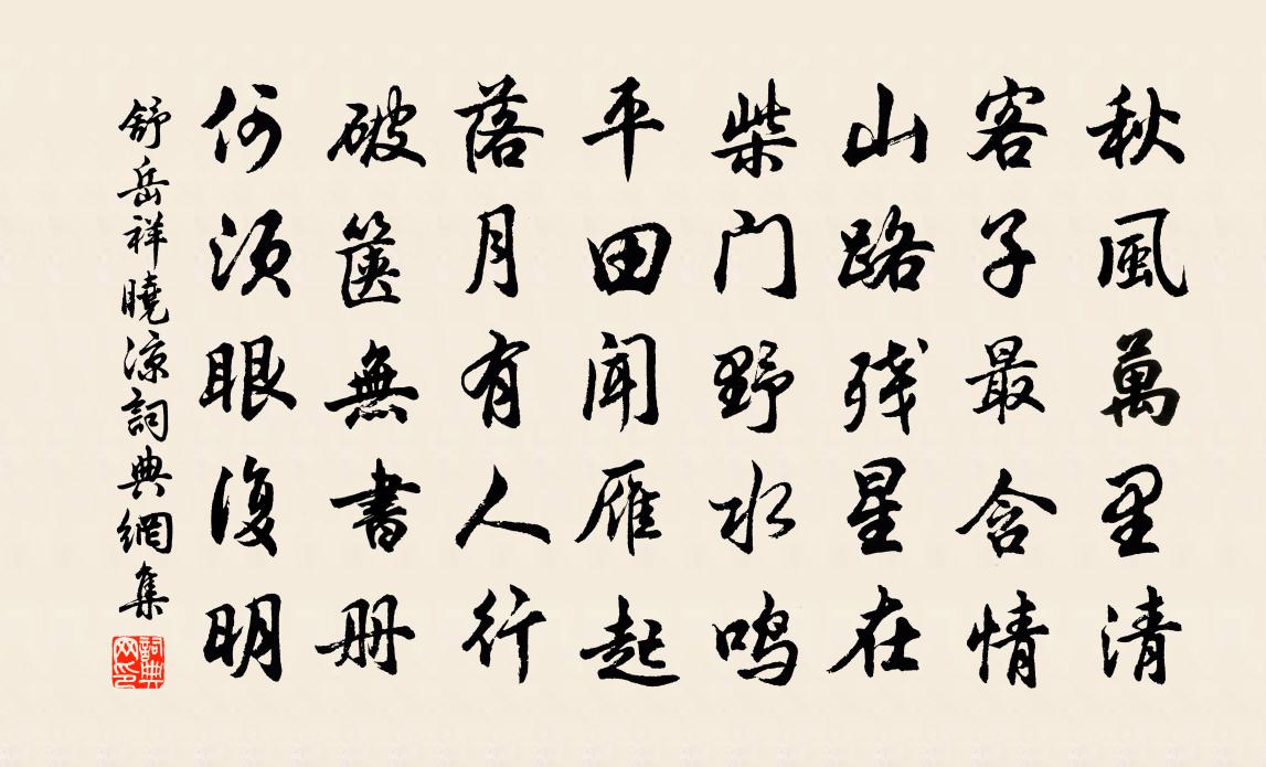 詩詞名句歷史字典書法欣賞書法字典國語詞典說文解字康熙字典古漢語字典標 題 作 者 詩 句 曉涼作者:舒岳祥 朝代:宋代曉涼原文秋風萬里清,客子最含情。山路殘星在,柴門野水鳴。平田聞雁起,落月有人行。破篋無書冊,何須眼復明。詩詞問答問:曉涼的作者是誰?答:舒岳祥問:曉涼寫於哪個朝代?答:宋代舒岳祥曉涼書法欣賞曉涼書法作品詩詞推薦次余仲庸松風閣韻十九首 其十六裘萬頃〔宋代〕為憐風雨趣春回,故著秋花到處栽。蘭菊從來盛風味,不妨環繞讀書齋。資聖庵欲過圓通釋正覺〔宋代〕我初浮舟濟九江,幽尋蘭若山蒼龍。王摩詰畫倚欄檻,謝靈運詩開綺窗。艾禪高談肖琢玉,法身雅論非枯樁。夢回和黃預病起陳師道〔宋代〕似聞藥病已投機,牛斗蛇妖頓覺非。李賀固知當得疾,沈侯可更不勝衣。驚逢白璧山千仞,會見黃金帶十圍。扣信游大智寺陸游〔宋代〕脫髮紛滿梳,衰顏不堪照。百年忽已半,去日如過燒。平生功名心,上馬無燕趙。爾來閱世故,萬事驚錯料。豈無淳化鄉飲酒三十三章佚名〔宋代〕求之無斂,寤寐所屢。聲爾一心,受天百祿。聞沈彬赴吳都請辟齊己〔唐代〕長訝高眠得穩無,果隨徵辟起江湖。鴛鴦已列樽罍貴,鷗鶴休懷釣渚孤。白日不妨扶漢祚,清才何讓賦吳都。可能行崧嶺將半下瞰山中一人家似不與世者凝佇久陳文蔚〔宋代〕幾曲青山一畝宮,前村惟有小溪通。雞鳴鳥宿知昏旦,水碓無人自在舂。送林大年寺丞宰蒙城先歸餘杭逋之侄孫梅堯臣〔宋代〕東方有奇士,隱德珠在淵。川壑為之媚,草樹為之妍。歿來十五載,獨見諸孫賢。煌煌出仕途,皎皎如淮蠙。今為出都來陳,所乘船上有題小詩八首,不知何人蘇軾〔宋代〕鳥樂忘置罦,魚樂忘鉤餌。何必擇所安,滔滔天下是。次下牢韻戴叔倫〔唐代〕獨立荒亭上,蕭蕭對晚風。天高吳塞闊,日落楚山空。猿叫三聲斷,江流一水通。前程千萬里,一夕宿巴東。清平樂(謝叔良惠木犀)辛棄疾〔宋代〕少年痛飲。憶向吳江醒。明月團圓高樹影。十里薔薇水冷。大都一點宮黃。人間直恁芳芬。怕是九天風露,染教世吟詩姜特立〔宋代〕平生性僻愛吟詩,驅使風光如使兒。縱橫妙用無凝滯,問著機緘自不知。留春令彭止〔宋代〕夜來小雨三更作。近水處、小桃開卻。玉女向曉掀朱箔。似與花枝有約。綠池上、柳腰纖弱。燕子過、誰家院落。蒼嶺行三首葛紹體〔宋代〕只將客路當山行,自覺春光步步生。幾許花開到桃李,東風又趣隴頭耕。西山有單鵠行范成大〔宋代〕西江有單鵠,託身萬里雲。猥為稻粱謀,墮此鷗鷺群。朝游楓葉杪,暮宿蘆花根。懷安浦漵暖,忘記雲海寬。忽有春晚書山家屋壁二首貫休〔唐代〕柴門花寂寂黍飯花馨,山家花煙火春雨花晴。庭花濛濛水泠泠,小兒啼索樹上鶯。水香塘黑蒲森森,鴛鴦鸂鶒如家早發新都驛陸游〔宋代〕喔喔江村雞,迢迢縣門漏。河漢縱復橫,繁星明如晝。愛涼趣上馬,未曉閱兩堠。高林起宿鳥,絕澗落驚狖。寺樓春和郭使君游光福寺雲閒閣二十韻趙公碩〔宋代〕南龕幾百年,古木闞雲掩。崖傾千仞垂,路縣一線險。飛秈{沈氵換犭}喜曾巔,羸驂怯虛塹。楓葉紅斕斑,松□少年游趙子發〔宋代〕曉山日薄半春陰。煙暖柳拖金。滿眼新晴,歌聲妝影,悠蕩碧雲心。閒庭客散人歸去,疏雨濕羅襟。樓閣濛濛,斷望蓬萊劉處玄〔元代〕形如鶴,性耀似孤雲。自在空中無掛礙,來來去去意無塵。世外樂天真。大成拜,三教理超群。結就丹陽蓬島去,名句推薦亂雲低薄暮,急雪舞迴風。杜甫《對雪》 一葉漁船兩小童,收篙停棹坐船中。楊萬里《舟過安仁》 其進銳者,其退速。孟子《孟子·盡心章句上·第四十四節》 傷高懷遠幾時窮。無物似情濃。張先《一叢花令·傷高懷遠幾時窮》 雲物不殊鄉國異,教兒且覆掌中杯。杜甫《小至》 松樹千年終是朽,槿花一日自為榮。白居易《放言五首·其五》 風雨牢愁無著處,那更寒蛩四壁。文天祥《酹江月·和友驛中言別》 家住層城臨漢苑,心隨明月到胡天。皇甫冉《春思》 時危見臣節,世亂識忠良。鮑照《代出自薊北門行》 玉階空佇立,宿鳥歸飛急。李白《菩薩蠻·平林漠漠煙如織》