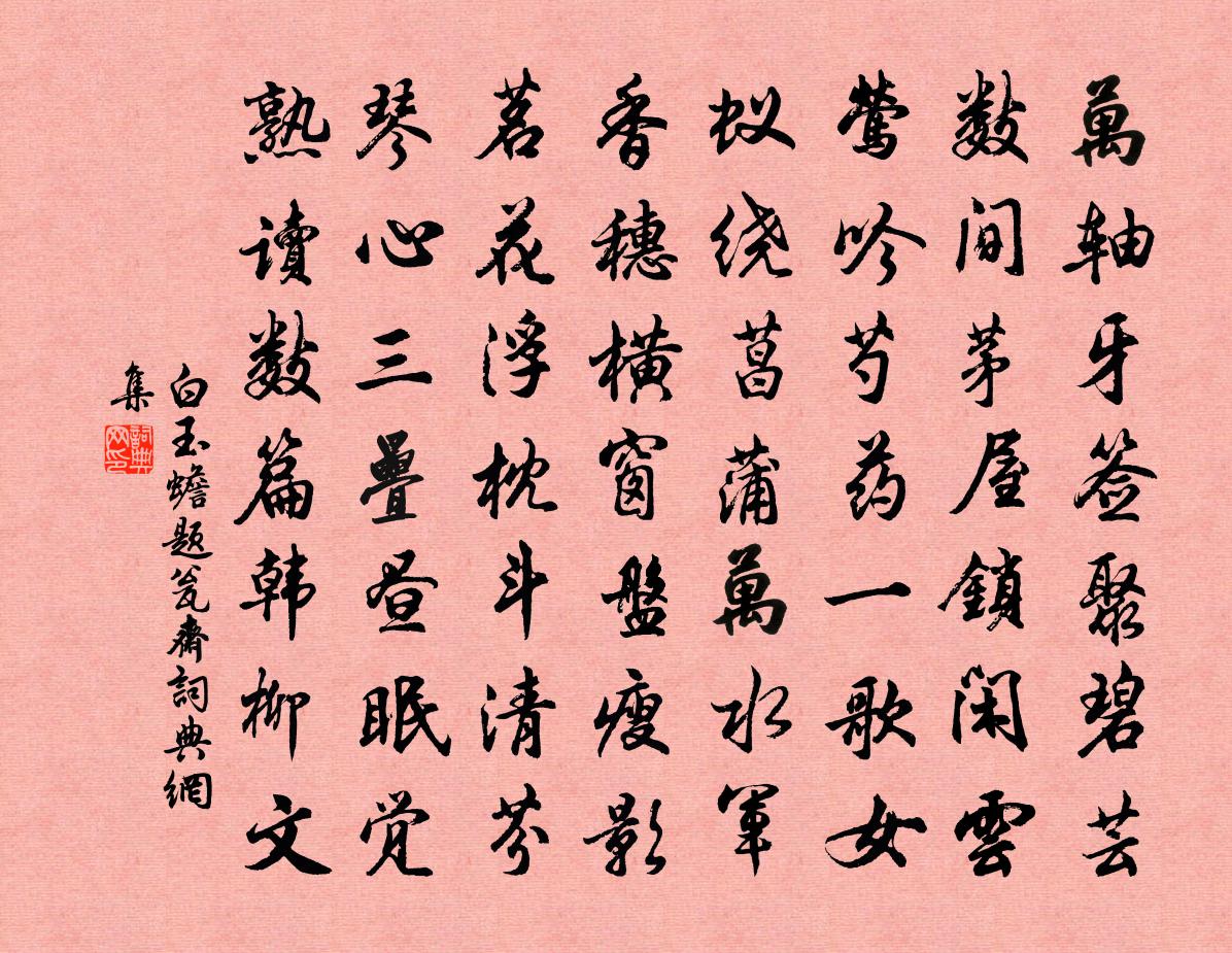 詩詞名句歷史字典書法欣賞書法字典國語詞典說文解字康熙字典古漢語字典標 題 作 者 詩 句 題瓮齋作者:白玉蟾 朝代:宋代題瓮齋原文萬軸牙籤聚碧芸,數間茅屋鎖閒雲。鶯吟芍藥一歌女,蟻繞菖蒲萬水軍。香穗橫窗盤瘦影,茗花浮枕斗清芬。琴心三疊晝眠覺,熟讀數篇韓柳文。詩詞問答問:題瓮齋的作者是誰?答:白玉蟾問:題瓮齋寫於哪個朝代?答:宋代問:題瓮齋是什麼體裁?答:七律白玉蟾題瓮齋書法欣賞題瓮齋書法作品詩詞推薦湖上夜坐二首黎廷瑞〔宋代〕平湖漠漠來孤艇,遠樹冥冥見一燈。翁媼隔籬呼稚子,豈頭猶有未收罾。玉樓春李朝卿〔宋代〕爐煙不斷騰金獸。香霧入簾波影皺。秋堂錦席艷群仙,不惜綺羅縈舞袖。晝弦素管春風手,嬌妙如花輕似柳。勸君滿江紅袁去華〔宋代〕社雨初晴,煙光暖、吳山滴翠。望絳闕、祥雲虧蔽,粉垣千雉。萬柳低垂春似酒,微風不動天如醉。遍萬井、嬉嬉樓居釋行海〔宋代〕秋光清接眼光寒,碧落茫茫碧海寬。月墮樹根當岳頂,天垂河氣濕欄乾。元龍百尺情猶在,黃鶴千年跡未殘。最是會平上人夜話趙湘〔唐代〕秋燈照岳客,深夜坐前軒。白髮新聞雨,青山舊聽猿。病多添藥債,吟苦避蟲喧。不寐還相對,高梧葉自翻。自釋休官之意方回〔宋代〕七載休官學老農,間關垂死脫兵鋒。折腰早覺身難屈,饒舌懸知世不容。已幸櫟陽歸舊質,可能稷嗣冀新封。時清點絳唇元好問〔金代〕痛負花朝,半春猶在長安道。故園春早。紅雨深芳草。愁里花開,愁里花空老。西歸好。一尊傾倒。氣去聲與花枝瑞鷓鴣張孝祥〔宋代〕香佩分紫繡囊。野塘波急折鴛鴦。春風灞岸空回首,落日西陵更斷腸。雪下喔詩憐謝女,花間為令勝潘郎。從今千福州張從事楊億〔宋代〕萬人都督古閩州,幕府旌門映碧油。閫外依蓮滯英俊,樽前噉薤占風流。犀燈照水窺龍劍,鯨浪噴空見蜃樓。暇日和陶郭主簿二首蘇軾〔宋代〕今日復何日,高槐布初陰。良辰非虛名,清和盈我襟。孺子卷書坐,誦詩如鼓琴。卻去四十年,玉顏如汝今。閉戶夜泊東溪有懷唐彥謙〔唐代〕水昏天色晚,崖下泊行舟。獨客傷歸雁,孤眠嘆野鷗。溪聲牽別恨,鄉夢惹離愁。酒醒推篷坐,淒涼望女牛。胡笳十八拍第十七拍劉商〔唐代〕行盡胡天千萬里,唯見黃沙白雲起。馬飢跑雪銜草根,人渴敲冰飲流水。燕山仿佛辨烽戍,鼙鼓如聞漢家壘。努力馴虎岩陳洵直〔宋代〕骨橫虎口孰當雄,處士臨壇風自從。猛伏丹成俱解化,至今靈草記深蹤。旅舟度歲呈范堯臣吳錫疇〔宋代〕柏琖椒盤且罷休,呂蒙城下泊孤舟。昏獨照還鄉夢,久客新添別愁。爆竹無聲驚寂寞,梅花有意伴淹留。明朝例是賢者之孝二百四十首原涉林同〔宋代〕所當約於已,豈忍儉其先。道立南陽表,人呼原氏阡。春日五首楊時〔宋代〕一番微雨一番晴,淡淡春容照眼明。庭外幽花自開落,飛揚無處覓殘英。讀屈翁山詩,有作陳維崧〔清代〕靈均苗裔,羨十年學道,匡廬山下。忽聽簾泉豗冷瀑,豪氣軼於生馬。亟跳三邊,橫穿九塞,開口談王霸。軍中毬正紀用暮春韻見貽復和三章郭印〔宋代〕萬形何苦役,兩曜不曾停。世事風中絮,人生水上萍。久能忘蟻慕,聊自學熊經。功滿他年後,虬龍定駕青。送蘇寺丞宰廣德宋庠〔宋代〕早捧諸侯檄,新登九列丞。庇身聊制錦,受命更懷冰。浦藥薰行櫂,江禾壓翠塍。高樓如可望,西北一長憑。次韻四明孫常州陳著〔宋代〕忽忽光陰日隙塵,回頭十載兩襟分。聽經偶枉真人駕,過首猶懷處士墳。危世清風誰一面,青山啼鳥自相聞。殷勤名句推薦煙籠寒水月籠沙,夜泊秦淮近酒家。杜牧《泊秦淮》 思欲委符節,引竿自刺船。元結《賊退示官吏》 一手獨拍,雖疾無聲。韓非及後人《韓非子·功名》 時不可失,喪不可久左丘明《國語·晉語·里克殺奚齊而秦立惠公》 綠雲擾擾,梳曉鬟也;杜牧《阿房宮賦》 夫嚴家無悍虜,而慈母有敗子。韓非及後人《韓非子·顯學》 彩扇紅牙今都在,恨無人、解聽開元曲。蔣捷《賀新郎·夢冷黃金屋》 論山水,則循聲而得貌;言節侯,則披文而見時。劉勰《文心雕龍·辨騷》 木蘭舟上珠簾卷,歌聲遠,椰子酒傾鸚鵡盞。李珣《南鄉子·山果熟》 雪雰雰而薄木兮,雲霏霏而隕集。劉向《九嘆》