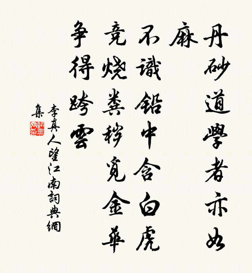 詩詞名句歷史字典書法欣賞書法字典國語詞典說文解字康熙字典古漢語字典標 題 作 者 詩 句 望江南作者:李真人 朝代:元代望江南原文丹砂道,學者亦如麻。不識鉛中含白1/1虎,競燒糞穢覓金華。爭得跨雲詩詞問答問:望江南的作者是誰?答:李真人問:望江南寫於哪個朝代?答:元代問:望江南是什麼體裁?答:詞李真人望江南書法欣賞望江南書法作品詩詞推薦自詠陸游〔宋代〕華發蕭蕭居士身,江頭風雨折烏巾。無人問字尤宜嬾,有吏徵租未是貧。薄宦儻來難倚仗,舊交漸少每酸辛。敲門過南墅懷寒岩二首釋善珍〔宋代〕年年散粟出朱門,狗盜雞鳴總受恩。空有玉棺歸碧落,更無紅粉哭黃昏。遍行苔蘚尋陳跡,擬倩梅花招醉魂。常恐端午詞御閣晏殊〔宋代〕五彩絲長系臂初,萬年芳樹影扶疏。豈勞方士標神篆,自有真靈衛帝居。石佛谷皇甫湜〔唐代〕澶漫花太行北,花千里一塊花石。平腹有壑谷,深廣數百尺。土僧何為者,老草花發白。寢處容身龕,足膝隱成跡雪中走筆寄鄧延碩韓元吉〔宋代〕去年雪裡共清游,蕭子酣歌幾唱酬。竹葉又看新釀熟,梅花還作暗香浮。青衫尚想君奔走,短褐空嗟我滯留。南北疊嶂樓有懷吳門朱長文〔唐代〕虎邱換得敬亭山,句水松陵數舍間。天下難如兩州好,君恩乞與一身閒。慚無牒訴煩敲扑,喜有林泉數往還。猶想三月晦日閒步西園楊萬里〔宋代〕嶺南春去盡從伊,元自無花可得飛。只有草花偏稱意,強留蝴蝶不教歸。大酺樂張文收〔唐代〕淚滴珠難盡,容殘玉易銷。倘隨明月去,莫道夢魂遙。陸君實輓詩仇遠〔宋代〕乾坤那可問,至痛老臣心。甘抱白日沒,不知滄海深。忠魂隨上下,義骨肯浮沈。草木長淮淚,秋風起莫陰。送郭少府探得憂字駱賓王〔唐代〕開筵枕德水,輟棹艤仙舟。貝闕桃花浪,龍門竹箭流。當歌淒別曲,對酒泣離憂。還望青門外,空見白雲浮。紹興祀高禖十首佚名〔宋代〕青律載陽,有鳦頡頏。祈我繁祉,立子生商。三牲既讓,玉帛是將。克熟克祀,月嘉其祥。佛跡釋智朋〔宋代〕石火電光中出沒,崖崩只裂尚難酬。放行一步還知不,佛是西天老比丘。安國寺尋春蘇軾〔宋代〕臥聞百舌呼春風,起尋花柳村村同。城南古寺修竹合,小房曲檻欹深紅。看花嘆老憶年少,對酒思家愁老翁。病眼再贈月蓬道人六言二首劉克莊〔宋代〕謝公早有遠志,陶子晚知昨非。帝允我乞骸疏,汝見吾衡氣機。山茶楊萬里〔宋代〕樹子團團映碧岑,初看喚作木犀林。誰將金粟銀絲膾,簇飣朱紅菜碗心。春早橫招桃李妒,歲寒不受雪霜侵。題詩和趙榮州胡寅〔宋代〕兵戎暌隔幾春秋,又向南州話北州。一飯識君塵外趣,三川回首夢中游。可堪麗藻相華寵,逢斷沉疴合罷休。安得寄題廣信鄭倅潛道齋金君卿〔宋代〕養志浮名外,潛神聖壺中。誠心如自得,樂事固無窮。齋靜橫賓榻,詩成促遞筩。英瓊何以報,惟有四般同。多病執熱奉懷李尚書(之芳)杜甫〔唐代〕衰年正苦病侵凌,首夏何須氣鬱蒸。大水淼茫炎海接,奇峰硉兀火雲升。思沾道暍黃梅雨,敢望宮恩玉井冰。不是司馬溫公輓詞五首范祖禹〔宋代〕自昔龍門峻,叨蒙國士知。紬書陪太史,問學仰宗師。一紀依林壑,千秋隔履綦。餘生愧簪紱,無路送靈輀。春日釋斯植〔宋代〕人生厭別離,老去更何為。獨對清明雨,閒吟社日詩。野蜂成蜜早,海燕入簾遲。未盡尋春興,慶須愧後期。名句推薦問他有甚堪悲處?思量卻也有悲時,重陽節近多風雨。辛棄疾《踏莎行·庚戌中秋後二夕帶湖篆岡小酌》 殘螢棲玉露,早雁拂金河。許渾《早秋三首·其一》 晚風庭院落梅初。淡雲來往月疏疏。李清照《浣溪沙·髻子傷春慵更梳》 來歲花前。又是今年憶去年。呂本中《減字木蘭花·去年今夜》 花谷依然,秀靨偷春小桃李。吳文英《荔枝香近·送人游南徐》 翠葉藏鶯,朱簾隔燕。晏殊《踏莎行·小徑紅稀》 見兔而顧犬,未為晚也;亡羊而補牢,未為遲也。劉向《戰國策·楚四·莊辛謂楚襄王》 翻空白鳥時時見,照水紅蕖細細香。蘇軾《鷓鴣天·林斷山明竹隱牆》 無由持一碗,寄與愛茶人。白居易《山泉煎茶有懷》 謝公最小偏憐女,自嫁黔婁百事乖。元稹《遣悲懷三首·其一》