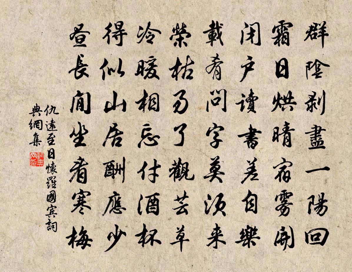 詩詞名句歷史字典書法欣賞書法字典國語詞典說文解字康熙字典古漢語字典標 題 作 者 詩 句 至日懷羅國賓作者:仇遠 朝代:宋代至日懷羅國賓原文群陰剝盡一陽回,霜日烘晴宿霧開。閉戶讀書差自樂,載餚問字莫須來。榮枯易了觀芸草,冷暖相忘付酒杯。得似山居酬應少,晝長閒坐看寒梅。詩詞問答問:至日懷羅國賓的作者是誰?答:仇遠問:至日懷羅國賓寫於哪個朝代?答:宋代仇遠至日懷羅國賓書法欣賞至日懷羅國賓書法作品詩詞推薦次韻因上人晚菊簡魏定父王之道〔宋代〕黃花如故人,別久喜復面。澆泥一杯酒,安用較深淺。清霜開浮雲,黃落信風卷。岩岩幽素姿,秋來不多見。宴桃源(烏江路中二首)王之道〔宋代〕黃葉聲遲風歇。龕火夜寒明滅。殘月卻多情,來照先生歸轍。清絕。清絕。透隙飛霜似雪。次楊國材韻晁公溯〔宋代〕形模豈稱侍承明,不願簫韶聽九成。但願豐年有高廩,千夫獲稻看秋晴。贈江東李提學方回〔宋代〕小難和氣如三春,大難色瑩清無塵。小難作詩到對處,大難更自髯絕倫。天憐今年窮已極,稍慰蒹葭霜露身。惡風頌十玄談釋印肅〔宋代〕達達,遍滿河沙微塵剎。本來無語似陽春,雨過花枝連夜發。天竺寺(並引)蘇軾〔宋代〕予年十二,先君自虔州歸,為予言:“近城山中天竺寺,有樂天親書詩云:一山門作兩山門,兩寺原從一寺分。東謝鄭侍郎餉酒二首曾幾〔宋代〕鳴鞭走送徒紛然,開嘗政足甜中邊。甘辛未省有如許,氣壓爛柯山下泉。詠史詩烏江胡曾〔唐代〕爭帝圖王勢已傾,八千兵散楚歌聲。烏江不是無船渡,恥向東吳再起兵。觀燈口號姜夔〔宋代〕正好嬉遊天作魔,翠裾無奈雨沾何。御街暗裡無燈火,處處但聞樓上歌。題雁塔許玫〔唐代〕寶輪金地壓人寰,獨坐蒼冥啟玉關。北嶺風煙開魏闕,南軒氣象鎮商山。灞陵車馬垂楊里,京國城池落照間。暫放和趙南塘離支五絕劉克莊〔宋代〕側生海畔遠難將,風日尤能變色漿。借問驛馳丞相府,何如輦致道山堂。題金廷標琵琶行圖乾隆〔清代〕船隱蘆洲不見人,四弦風送到江濱。主賓僮僕齊傾耳,寫出尋聲暗問神。清平調詞三首李白〔唐代〕雲想衣裳花想容,春風拂檻花。若非群玉山頭見,會向瑤台月下逢。一枝穠艷露凝香,雲雨巫山枉斷腸。借問漢花次韻俞好問慶予七十方回〔宋代〕固窮早類從心孔,懶讀今如便腹邊。時制堪驚小戴記,初筵敢擬衛公篇。云何此老偏令壽,其或斯文遂有傳。見一次滕彥真韻三首趙蕃〔宋代〕我欲湘西看,行須覓渡船。何如臨絕頂,得以盡長川。鷗鷺煙雲表,蚊虻埃壒前。隱寧分大小,那更別山鄽。戲促黃簿雞粥約三首陳造〔宋代〕雙雞可饜小人腹,未羨侯家千足羊。借問解黿食指動,何如蒸鴨瓠壺香。滿江紅(壽太守)黃人傑〔宋代〕小駐碧油,公兩載、重臨初度。滿全楚、襲人和氣,拍天歌舞。波涌荊江流不斷,地連巫峽山無數。指此山、此水初六日阻風新淦二首趙蕃〔宋代〕昨日北風猶可行,今日北風不可撐。雖無人止公無渡,憑河而死聖不與。況我生產憂患多,平陸往往愁風波。近連苦雨方岳〔宋代〕翁自無田望有秋,有秋翁自飽齁齁。此愁不遣吾人管,欲遣何人管此愁。鄉校頌陸淞〔宋代〕維校在鄉,示民有防。入孝出悌,為忠為良,斯邦家之光。名句推薦淚濕羅巾夢不成,夜深前殿按歌聲。白居易《後宮詞》 關山正飛雪,烽火斷無煙。王維《隴西行》 錦帶吳鉤,征思橫雁水。吳文英《荔枝香近·送人游南徐》 若對黃花孤負酒,怕黃花、也笑人岑寂。劉克莊《賀新郎·九日》 願為西南風,長逝入君懷。曹植《七哀詩》 人生十年曰幼,學。二十曰弱,冠。三十曰壯,有室。四十曰強,而仕。五十曰艾,服官政。戴聖《禮記·曲禮上》 輕舟泛月尋溪轉,疑是山陰雪後來李白《東魯門泛舟二首》 無為在歧路,兒女共沾巾。王勃《送杜少府之任蜀州 / 送杜少府之任蜀川》 畢竟年年用著來,何似休歸去。如晦《楚天遙過清江引·有意送春歸》 君人者,愛民而安,好士而榮,兩者無一焉而亡。荀子《荀子·君道》