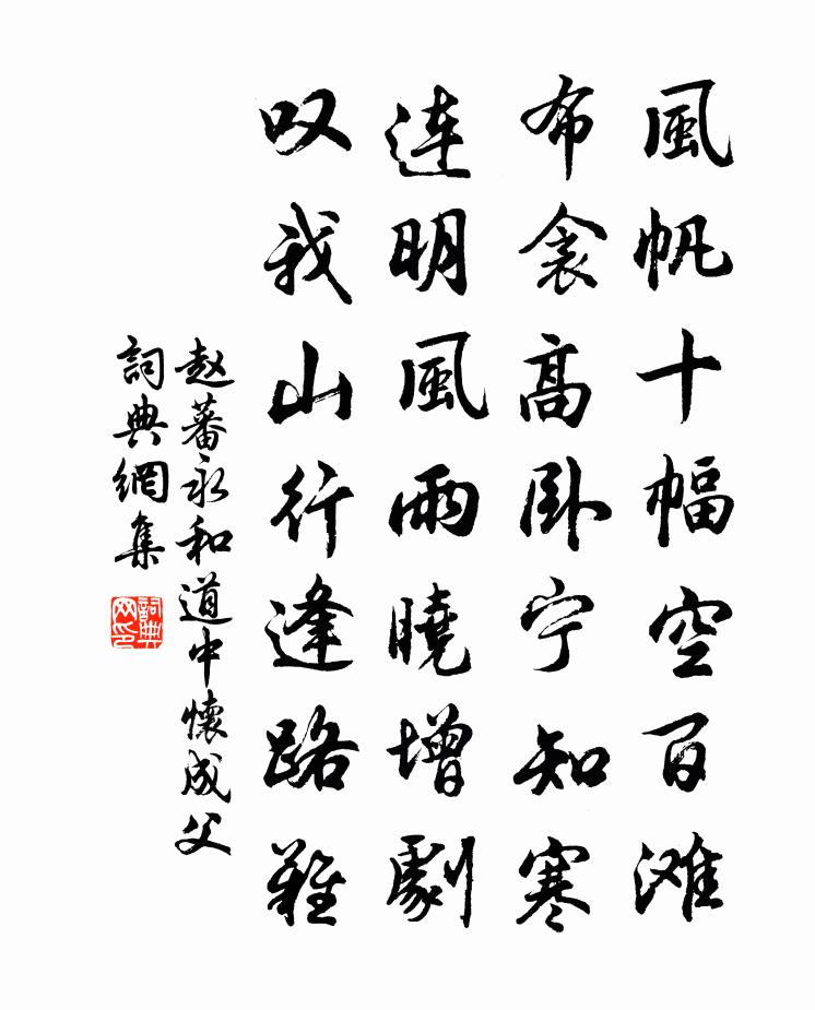 詩詞名句歷史字典書法欣賞書法字典國語詞典說文解字康熙字典古漢語字典標 題 作 者 詩 句 永和道中懷成父作者:趙蕃 朝代:宋代永和道中懷成父原文風帆十幅空百灘,布衾高臥寧知寒。連明風雨曉增劇,嘆我山行逢路難。詩詞問答問:永和道中懷成父的作者是誰?答:趙蕃問:永和道中懷成父寫於哪個朝代?答:宋代趙蕃永和道中懷成父書法欣賞永和道中懷成父書法作品詩詞推薦禁中見◇紅牡丹歐陽修〔宋代〕盛游西洛方年少,晚落南譙號醉翁。白首歸來玉堂署,君王殿後見◇紅。看雁張鎡〔宋代〕曉晴群雁欲何之,正是青天似紙時。橫斜數行有聲字,服殺虛空解作詩。頌古二十六首釋嗣宗〔宋代〕舒無蹤,卷無跡,日午晴空轟霹靂。衲子驚迷失路頭,神號鬼哭知何極。和延州三詠濟勝橋宋祁〔宋代〕溪光倒彴影,彴影跨溪垠。非論權取意,聊訂濟涉仁。拂菻天馬圖牟巘五〔宋代〕赤手謝銜轡,踏蹴翻九衢。健哉此女子,果勝大丈夫。伯勝文本袖詩見訪輒成長句奉酬盛意劉子翬〔宋代〕懶逐交遊戶晝扃,客來曳履亦逢迎。舊知吾里多豪雋,親識君家好弟兄。瓜芋滿畦聊卒歲,琴書一榻寄平生。驊騮賜神童蔡伯禧宋真宗〔宋代〕七閔山水多才俊,三歲奇童出盛時。家世應傳清白訓,嬰兒自得老成資。初嘗學步來朝謁,方及能言解誦詩。更勵責逋二首華岳〔宋代〕索逋無術謁公門,豈謂公門反愴神。令尹幸酬三百索,痴兒猶戀一千緡。如今索手方知錯,自此甘心莫怨貧。不是青城大面山中有二隱士一曰譙先生定字天陸游〔宋代〕寄謝譙夫子,今年一出無?萬綠隨夢斷,百念與形枯。雲護巢松谷,神呵煆藥爐。憑高應念我,白首學徵租。次韻杜安行見寄六首郭印〔宋代〕擬作淵明去,寧為祖逖先。築廬須近水,賣劍且求田。短燭窺今古,清樽樂聖賢。卜鄰真有意,相與慶餘年。啄木鳥二首魏野〔宋代〕亂繞園林啄,終朝意若何。莫因飢不足,翻愛蠹偏多。渴映鄰溪下,驚從別樹過。辛勤詠還囑,無損好枝柯。西江月(再游龍隱岩,追和陶商翁韻)方信孺〔宋代〕碧洞青崖著雨,紅泉白石生寒。朅來十月九湖山。人笑元郎太漫。絕壑偏宜疊鼓,夕陽休喚歸鞍。茲游未必勝驂鸞菩薩蠻舒亶〔宋代〕金船滿引人微醉。紅綃籠燭崔歸騎。香泛雪盈杯。雲龍疑夢回。不辭風滿腋。舊是仙家客。坐得夜無眠。南窗衾枕南山羅漢贊十六首黃庭堅〔宋代〕大阿羅漢賓度羅,奉持末後如來印。日中一缽千家飯,處處作佛事饒益。以我身心五分香,作光明雲雨大千。取火滿江紅吳潛〔宋代〕聊把芳尊,殷勤勤、斜陽休墜。吾老矣,難從仙客,采丹丘李。且趁風光一百五,園林尚有殘紅綴。更忉忉、百舌東風第一枝(元夕)曹勛〔宋代〕寶苑明春,青霞射晚,六幕雲閒風靜。茂林修竹昂霄,素月照人澄瑩。梅花十頃,遞暗香、瓊瑤真景。散萬斛金蓮二月二十日野步城南晚與吳伯承諸友飲裴台分張栻〔宋代〕春日煙沙岸,禪房風竹窗。有時傾綠酒,隨處見清江。世路紛多轍,吾生老此邦。千林看不盡,白鳥去雙雙。渡鄱陽嚴遂成〔清代〕煙與水無際,迷茫小洞庭。潮回三楚白,山壓五湖青。葦折雁聲苦,風多魚氣腥。揚舲一極目,何處吊湘靈?夜行船侯善淵〔元代〕虎*天罡吞鳳尾。火輪轉艮山初起。注鼎炎炎,烹煎神水。交泰地精天髓。煉就純陽丹貫體。換凡軀以別塵世。鶴舅氏自壽陽由京師歸安陸宋祁〔宋代〕道舊欣來駕,銷魂遽遠離。顛毛同白日,俗眼暫青時。客飯稽留數,齋醪酪酊遲。風波須畏險,老大共餘悲。楚莽名句推薦不知庭霰今朝落,疑是林花昨夜開。宋之問《苑中遇雪應制》 魯女東窗下,海榴世所稀。李白《詠鄰女東窗海石榴》 馬蹀閼氏血,旗裊可汗頭。岳飛《送紫岩張先生北伐》 可有梅花寄一枝?雪來翠羽飛。吳錫麒《長相思·以書寄西泠諸友即題其後》 天網恢恢,疏而不失。老子《老子·德經·第七十三章》 世上無難事,只怕不專心。佚名《增廣賢文·下集》 路逢險處須迴避,事到臨頭不自由。佚名《增廣賢文·上集》 長相思,長相思。晏幾道《長相思·長相思》 深林人不知,明月來相照。王維《竹里館》 靜言庸違,像恭滔天。佚名《尚書·虞書·堯典》