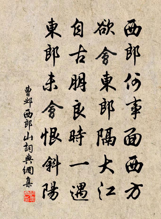 詩詞名句歷史字典書法欣賞書法字典國語詞典說文解字康熙字典古漢語字典標 題 作 者 詩 句 西郎山作者:曹鄴 朝代:唐代西郎山原文西郎何事面西方?欲會東郎隔大江。自古朋良時一遇,東郎未會恨斜陽。詩詞問答問:西郎山的作者是誰?答:曹鄴問:西郎山寫於哪個朝代?答:唐代問:西郎山是什麼體裁?答:七絕曹鄴西郎山書法欣賞西郎山書法作品注釋全唐詩詩詞推薦管晏列傳司馬遷〔兩漢〕管仲夷吾者,潁上人也。少時常與鮑叔牙游,鮑叔知其賢。管仲貧困,常欺鮑叔,鮑叔終善遇之,不以為言。已而和立齋歲寒歌五章王柏〔宋代〕羌人生之秉貞兮孰無陽秋,惟澹而無欲兮斯能無求。宜此心之冰堅兮凜北風之正遒,歲寒之常兮足以自修。和周仲覺三首楊萬里〔宋代〕月淡猶明樹,霜嚴不剩雲。天寒一鴈叫,夜半幾人聞。詩只令吾瘦,清聊與子分。頻來仍恨少,此去更離群。人月圓·山中書事張可久〔元代〕興亡千古繁華夢,詩眼倦天涯。孔林喬木,吳宮蔓草,楚廟寒鴉。數間茅舍,藏書萬卷,投老村家。山中何事?松避地復歸故鄉葛立方〔宋代〕二老堂邊花作林,不愁酒竭貰貂金。宗人避世散還聚,才子喔詩絕復尋。莫話衣冠一酸鼻,回思戎虜幾寒心。半墩代柬答合淝蘇刑曹兼呈淮西帥同年趙寶謨二首劉宰〔宋代〕青衫擬掾襲芳塵,短褐歸來理約緡。二紀期君紹先烈,一官投老祗參軍。宦情自與秋光薄,公論猶期歲晚伸。見說和沈祭酒行園詩謝朓〔南北朝〕清淮左長薄。荒徑隱高蓬。回潮旦夕上。寒渠左右通。霜畦紛綺錯。秋町郁蒙茸。環梨縣已紫。珠榴折且紅。君有再和元禮春懷十首黃庭堅〔宋代〕紅紫欲疏啼百勞,洞宮春色醉蟠桃。虛窗酒病扶頭起,強取金釵癢處搔。古意報袁功曹江淹〔南北朝〕從軍出隴北,長望陰山雲。涇渭各異流,恩情於此分。故人贈寶劍,鏤以瑤華文。一言鳳獨立,再說鸞無群。何得沁園春 題戶部郎完顏正甫舒嘯園,仍用盧齊劉敏中〔元代〕華屋高軒,富貴之心,人皆有之。甚伯倫挈,惟知酒,浩然踏雪,只解吟詩。一見令人,利名都忘,更有高情詠刺蝟李貞白〔唐代〕行似針氈動,臥若栗球圓。莫欺如此大,誰敢便行拳。岳州作張說〔唐代〕水國生秋草,離居再及瓜。山川臨洞穴,風日望長沙。物土南州異,關河北信賒。日昏聞怪鳥,地熱見修蛇。遠人又行路難曹勛〔宋代〕行路難,行路難,九折之坂以無足嘆。羊腸劍閣視階闥,巫峽灩澦無波瀾。長安九衢最巘嶮,侯門處處深如淵。深見陳月觀二首王奕〔宋代〕仲尼日月幾曾昏,自古君師豈必存。水陸三千游聖域,風雲萬里望天閽。燕台接武何多隗,吳國孤騫未見雲。觀上晚泊江口令小舟汲江心水烹葉璵雲谷碎冰散步李彌遜〔宋代〕不到鐘山二十上,江邊獨立思茫然。故園如夢南歸客,明日好風東去船。白鷺一雙輕照水,青鴉萬點遠漫天。何須十三夜招全真沅陵趙蕃〔宋代〕昨朝熱如焚,今日涼如水。豈惟悟天機。政自知物理。黃華一月賒,桂子數夕事。已辦烹伏雌,相期泛浮蟻。古意閻寬〔唐代〕庭樹發華滋,瑤草復葳蕤。好鳥飛相從,愁人深此時。天中有靈匹,日夕嚬蛾眉。願逐飄風花,千里入遙帷。心逝立春方岳〔宋代〕采燕雙簪翡翠翹,巧裁銀勝試春韶。東風已到闌乾北,看見嬌黃上柳條。恭謝侍讀仁皇訓典徹章御賜杜工部紫宸殿詩退杜范〔宋代〕於赫仁皇訓典垂,寬慈實德太平基。鴻圖植遠文孫紹,燕翼謀深烈祖貽。寶曆初更思善治,瑤編久閱撫良規。平平興慶池侍宴應制劉憲〔唐代〕蒼龍闕下天泉池,軒駕來游簫管吹。緣堤夏筱縈不散,冒水新荷卷復披。帳殿疑從畫裡出,樓船直在鏡中移。自然名句推薦隋堤上、曾見幾番,拂水飄綿送行色。周邦彥《蘭陵王·柳》 無人信高潔,誰為表予心?駱賓王《詠蟬 / 在獄詠蟬》 長者梢,深者底。宋濂、王褘《元史·列傳·卷二》 易得凋零,更多少無情風雨趙佶《宴山亭·北行見杏花》 為問元戎竇車騎,何時返旆勒燕然。皇甫冉《春思》 白髮悲花落,青雲羨鳥飛。岑參《寄左省杜拾遺》 自損者有餘,自益者彌昏。房玄齡《晉書·列傳·第八章》 止凡人之斗鬩,則堯舜之道,不如寡妻之誨諭。顏之推《顏氏家訓·序致篇》 泛樓船兮濟汾河,橫中流兮揚素波。劉徹《秋風辭》 不受苦中苦,難為人上人。吳承恩《西遊記·第三十二回》