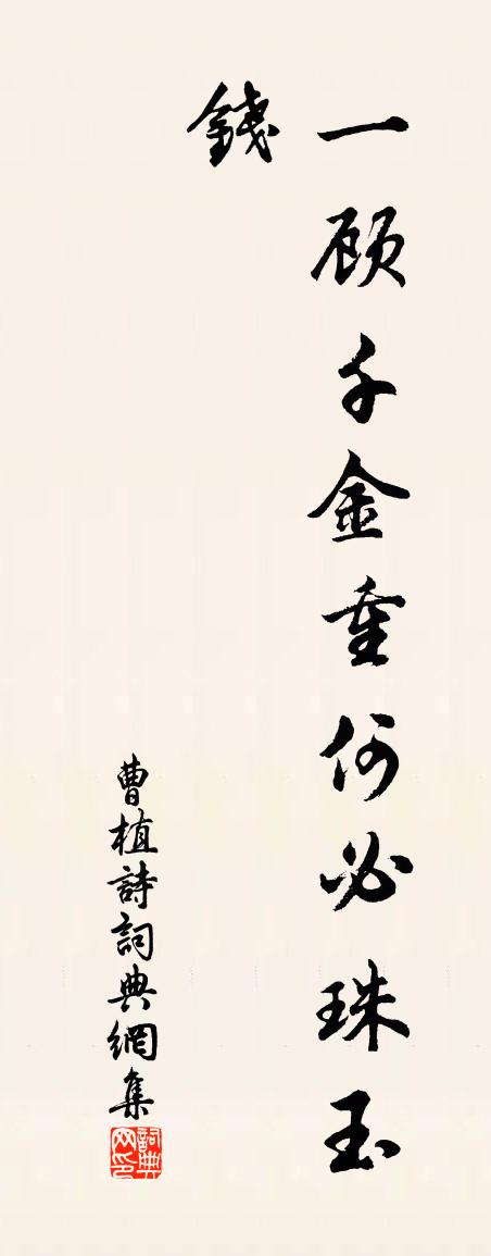 詩詞名句歷史字典書法欣賞書法字典國語詞典說文解字康熙字典古漢語字典標 題 作 者 詩 句 詩作者:曹植 朝代:魏晉詩原文一顧千金重。何必珠玉錢。詩詞問答問:詩的作者是誰?答:曹植問:詩寫於哪個朝代?答:魏晉問:曹植的名句有哪些?答:曹植名句大全曹植詩書法欣賞詩書法作品詩詞推薦家園臥疾畢太祝曜見尋①孟浩然〔唐代〕伏枕舊遊曠,笙歌勞夢思。②平生重交結,迨此令人疑。冰室無暖氣,炎雲空赫曦。③隙駒不暫駐,日聽涼禪悲。孔周翰嘗令仙源中秋以事留東武時陳君榮右王蘇軾〔宋代〕超然台聞周翰乞此郡客有誦其詩者乃次其韻二篇以為他日一笑。壞壁題詩已五年,故人風物兩依然。定知來歲中秋奉同何濟川迎吏示至秋暑方劇呈同舍司馬光〔宋代〕稚金酒避老火,酒暑勢萬驕酒盈。朱光酒爍厚地,萬葉焦無聲。夫子久倦遊,得郡為親榮。束裝待騶吏,歸期殊未答陳珍劉克莊〔宋代〕寂寂少游從,斯人未易逢。清貧今仲子,疏雋小元龍。君謹提詩筆,吾當避箭鋒。勉旃鳴盛世,切勿效寒蛩。寄父王氏〔宋代〕西風不入小窗紗,秋氣應鄰我憶家。極目江南千里恨,依然如淚看黃花。霜天曉角(日暮)張輯〔宋代〕暮天雲闊。懶泛琴三疊。恰有梅花相伴,窗兒上、一枝月。憶別。恁時節。吟情誰共說。敧枕偶成清夢,畫角曉、巫山一段雲 白岳晴雲李齊賢〔元代〕曉過青郊驛,春遊白岳山。提壺勸酒語關關。一聽一開顏。村舍疏林外,田畦亂水間。郊原雨足信風還。羨殺嶺雲荊州貫休大師舊房齊己〔唐代〕疏篁抽筍柳垂陰,舊是休公種境吟。入貢文儒來請益,出官卿相駐過尋。右軍書畫神傳髓,康樂文章夢授心。銷得夏夜坐游李左藏園常父子駿明叔毅父元忠時新孔武仲〔宋代〕王城雖多賢,相過每希闊。今夕復何夕,共此青天月。鄰園初鏟築,咫尺夷且潔。胡床占勢便,漫不就行列。素華揚子江阻風王令〔宋代〕揚子江風十月初,四駕巨浪渺無隅。常憂傾搖地為動,意欲起塞天無虛。大舟不行就系岸,小舟分去爭得魚。舟中立春和孫子紹二首王之道〔宋代〕老窮推不去,湖海又逢春。懶復論三甲,空驚薦五辛。柳梢寒已動,萱草暖還新。我亦寰中物,因君試問津。哭孫行之二首劉克莊〔宋代〕世上高科眾,君尤自貴珍。如何一夕里,忽盡百年身。雙旐齊眉友,孤燈擁{上髟下告}人。傷心惟孟母,頭白送赫曦台四景雞鳴出日熊禾〔宋代〕赫曦清晝真奇絕,遠望海門觀出日。金戈鐵騎走千峰,閃閃万旗張天赤。神龍飛上使人驚,爍眼祥光成五色。扶桑閏九月九日登高有感宋祁〔宋代〕隔霜雲葉繞天愁,閏節重來續舊遊。賦客豈辭聊暇日,楚人無奈賸悲秋。寒萸實老猶薰佩,晚菊香殘不占甌。悵憶金谷行楊奐〔元代〕洛陽園池天下無,金谷近在西城隅。晉時花草不復見,野人猶解談齊奴。齊奴豪奢誰比數,酒醒愛擊珊瑚株。後堂海南人不作寒食而以上巳上冢予攜一瓢酒尋諸蘇軾〔宋代〕老鴉銜肉紙飛灰,萬里家山安在哉。蒼耳林中太白過,鹿門山下德公回。管寧投老終歸去,王式當年本不來。記取宮詞楊皇后〔宋代〕海棠移向小窗栽,高疊盆山合復開。將見紅葩斗新艷,君王應為探花來。紹興祀太社太稷十七首佚名〔宋代〕[太簇為角]是尊是奉,茲率舊章。樂音純繹,薦溢圓方。情文舊矣,神其迪賞。永觀錫義,多檣穰穰。食曲河驛(驛在商鄧間)韓愈〔唐代〕晨及曲河驛,悽然自傷情。群烏巢庭樹,乳燕飛檐楹。而我抱重罪,孑孑萬里程。親戚頓乖角,圖史棄縱橫。下負送二十二弟入浙晁說之〔宋代〕世亂還家未有期,汝於何處望京師。韋郎舊恨今新恨,細學南音寄我詩。名句推薦反者道之動;弱者道之用。天下萬物生於有,有生於無。老子《老子·德經·第四十章》 關山正飛雪,烽火斷無煙。王維《隴西行》 一晌凝情無語,手捻梅花何處。王之道《如夢令·一晌凝情無語》 林斷山明竹隱牆。亂蟬衰草小池塘。蘇軾《鷓鴣天·林斷山明竹隱牆》 臣子恨,何時滅!駕長車,踏破賀蘭山缺。岳飛《滿江紅·寫懷》 明敕星馳封寶劍,辭君一夜取樓蘭。王昌齡《從軍行七首》 伏久者,飛必高;開先者,謝獨早。陳繼儒《小窗幽記·集醒篇》 最愛湖東行不足,綠楊陰裏白沙堤。白居易《錢塘湖春行》 孤燈不明思欲絕,卷帷望月空長嘆。李白《長相思·其一》 讀書不覺已春深,一寸光陰一寸金。王貞白《白鹿洞二首·其一》