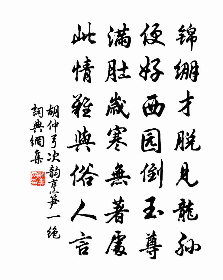 詩詞名句歷史字典書法欣賞書法字典國語詞典說文解字康熙字典古漢語字典標 題 作 者 詩 句 次韻烹筍一絕作者:胡仲弓 朝代:宋代次韻烹筍一絕原文錦繃才脫見龍孫,便好西園倒玉尊。滿肚歲寒無著處,此情難與俗人言。詩詞問答問:次韻烹筍一絕的作者是誰?答:胡仲弓問:次韻烹筍一絕寫於哪個朝代?答:宋代胡仲弓次韻烹筍一絕書法欣賞次韻烹筍一絕書法作品詩詞推薦南山堂黃遹〔宋代〕幸然閉閣文書靜,何必銜杯笑語頻。只把悠然無限意,散為和氣萬家春。次韻弟觀雪中二首陳著〔宋代〕萬里長久一樣雲,紛紛吹下玉成塵。能令下界皆稱瑞,誰謂南人不識真。積凍已多為麥地,培湯更辦百花春。強將錢氏東皋張蘊〔宋代〕百年鐘鼓園林在,人物蕭疏更海鄉。藤絡湖嵌山解長,花移鄴本土猶香。棋聲靚晝松陰淡,扇影閒秋水氣長。莫道上喬右司戴復古〔宋代〕端笏立朝日,肺肝傾上前。把麾持節處,桃李滿淮壖。藥石箴時病,蓍龜燭事先。焦頭與曲突,為計孰為賢。贈沈兢趙希邁〔宋代〕僦居初不惡,門巷接溪灣。有譜曾評菊,無錢可買山。吟驅生計拙,愁積鬢毛斑。遠示諸名作,閒題馹寄還。山中夜聞風雨王銍〔宋代〕空山清夜寒無寐,松檜搖聲風雨高。行盡江湖忘岩壑,猶疑繞屋盡波濤。和黃彥華帥機六言十首劉克莊〔宋代〕老矣宦情素薄,天於書分尤慳。寧作一鷗浮海,長笑六鰲負山。菩薩蠻(四)韋莊〔唐代〕權君今夜須沉醉,尊前莫話明朝事。珍重主人心,酒深情亦深。須愁春漏短,莫訴金杯滿。遇酒且呵呵,人生能幾次韻重九董嗣杲〔宋代〕懷古憑高厭客身,秋深愁望隔江城。狂支靈運東山屐,醉漉淵明栗里巾。楚澤豈無餐菊友,漢宮還有佩萸人。今年明妃徐夤〔唐代〕不用牽心恨畫工,帝家無策及邊戎。香魂若得升明月,夜夜還應照漢宮。贈筆工王諶〔宋代〕試子玉簪筆,他工總不如。毫長宜貯墨,管淨可抄書。汝自誇淮兔,吾猶註魯魚。鬢毛斑白盡,心折正緣渠。初伏休沐宋祁〔宋代〕伏時詔休偃,閉門謝朋儕。羲和挾昇陽,曉氣紅崔嵬。炎林欝歊露,焦原橫赭埃。怒甚崒崒雲,旱始隆隆雷。況我合江夜宴歸馬上作陸游〔宋代〕零露中宵濕綠苔,江郊縱飲亦荒哉!引杯快似黃河瀉,落筆聲如白雨來。纖指醉聽箏柱促,長檠時看燭花摧。頭顱宿雞林坊楊萬里〔宋代〕路覺往而復,意迷東與西。元來 * 渡,只是一條溪。亭午雖微暑,茲辰較少泥。諸峰雲上出,不但與雲齊。十二月初六日出郊途只值雪偶成小律詩杜范〔宋代〕宦塵役役走長塗,歲晚離家只自吁。風入破輿寒徹骨,雪穿疎幌秘沾須。橫陳瑞色今如許,定似豐年可大書。州縣世事二首趙善括〔宋代〕世事今如此,惟堪一笑嘩。空持沖鬥劍,安得上天槎。遠信憑飛翼,流年付落花。平戎須大度,何必顧纖瑕。次韻酬洪監倉方岳〔宋代〕我輩從來不入時,知心粗有硯相隨。肯分雪屋十年夢,寫作秋山一段奇。簾靜堂深無比客,歲寒亭老有先師。梧桐清暑陸游〔宋代〕穿竹窗清我魂,窗散發吹我窗頂。虛窗聽鳴蟬,小檻看汲井。掃地長物空,漱泉齒頰冷。廚人具漿粉,童子鬻山茗奉和受圖溫洛應制蘇味道〔唐代〕綠綺膺河檢,清壇俯洛濱。天旋俄制蹕,孝享屬嚴禋。陟配光三祖,懷柔洎百神。霧開中道日,雪斂屬車塵。預奉歸途次韻黃彥平〔宋代〕村落人家柳過牆,舞腰曾共小姑長。點妝拂黛留相學,卷葉吹蘆莫漫狂。名句推薦主失其神,虎隨其後。主上不知,虎將為狗。韓非及後人《韓非子·揚權》 雪月最相宜,梅雪都清絕。張孝祥《卜運算元·雪月最相宜》 罰慎其濫,惠戒其偏。罰濫則無以為罰,惠偏則不如無惠沈約《宋書·列傳·卷七十三》 歷覽前賢國與家,成由勤儉破由奢。李商隱《詠史二首·其二》 磧里征人三十萬,一時回向月明看。李益《從軍北征》 門外平橋連柳堤,歸來晚樹黃鶯啼。溫庭筠《春洲曲》 童孫未解供耕織,也傍桑陰學種瓜。范成大《夏日田園雜興·其七》 只應守寂寞,還掩故園扉。孟浩然《留別王侍御維 / 留別王維》 君子和而不同,小人同而不和。孔子弟子《論語·子路篇》 回首暮雲遠,飛絮攪青冥。蘇軾《水調歌頭·昵昵兒女語》