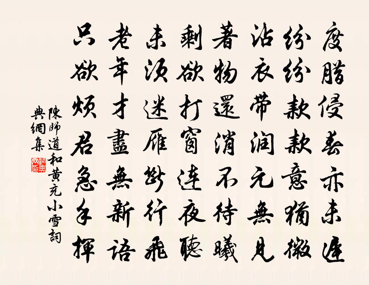 詩詞名句歷史字典書法欣賞書法字典國語詞典說文解字康熙字典古漢語字典標 題 作 者 詩 句 和黃充小雪作者:陳師道 朝代:宋代和黃充小雪原文度臘侵春亦未遲,紛紛款款意猶微。沾衣帶潤元無見,著物還消不待曦。剩欲打窗連夜聽,未須迷雁斷行飛。老年才盡無新語,只欲煩君急手揮。詩詞問答問:和黃充小雪的作者是誰?答:陳師道問:和黃充小雪寫於哪個朝代?答:宋代問:陳師道的名句有哪些?答:陳師道名句大全陳師道和黃充小雪書法欣賞和黃充小雪書法作品詩詞推薦舟中詠落景余清暉輕橈弄溪渚之句蓋孟浩然耶陸游〔宋代〕禹穴探斷簡,樵風泛清溪。倒影森松桂,避船散鳧鷖。塵中有異境,十里青玻璃。高塔忽招人,湖邊日未低。戲問花門酒家翁岑參〔唐代〕老人七十仍沽酒,千壺百瓮花門口。道傍榆莢仍似錢,摘來沽酒君肯否。過耶溪朱慶餘〔唐代〕春溪繚繞出無窮,兩岸桃花正好風。恰是扁舟堪入處,鴛鴦飛起碧流中。趣成父釀酒用子進家法故及其昆仲趙蕃〔宋代〕聞道名方曾口授,定應買秫趁冬炊。小須旬月釀當熟,寄我茅齋不可遲。鼎丁謂〔宋代〕妙盡三才象,精皆九貢金。克商遷洛邑,興漢出汾陰。郜賂慚非道,秦求愧醜心。觀銘知考甫,傴僂戒何深。題陽華岩何麒〔宋代〕名山固多岩,茲岩擅天下。屋大享千人,谷深量萬馬。谽谺通一水,旁午飛橋跨。石礫巧雕鎪,松篁森繪畫。古人偈二十七首釋守淨〔宋代〕我有懶庵兄,夤緣真有在。從東復過西,兩處成交代。去矣無遺恨,所欠唯睡債。難忘手足情,特來為渠賽。生查子毛滂〔宋代〕釵上燕猶寒,勝里紅偏小。恰有爾多春,不許群花笑。酒麵粉酥融,香袖金泥罩。芳意已潛通,殘雪猶相照。菩薩蠻(丁卯壽李嗣宗)郭應祥〔宋代〕去年持酒為君壽。勸君快上懸車奏。通籍已金閨。腰銀袍亦緋。壺中閒日月。自有長生訣。父子弟兄賢,一門行地韓少謨輓詩魏了翁〔宋代〕早年豪氣蓋區中,晚歲頹然一病翁。負許才華竟何事,有皇上帝豈夢夢。竹所見梅錢時〔宋代〕歲華冉冉走塵沙,望看家山便仙家。竹所夜深風戛玉,道人消坐共梅花。蜀漢陸游〔宋代〕蜀漢崎嶇外,江湖莽蒼中。冷官家世事,獨立古人風。已老學猶力,久窮詩未工。悠悠千載後,此意與誰同?路中上田尚書王建〔唐代〕去路何詞見六親,手中刀尺不如人。可憐池閣秋風夜,愁綠嬌紅一遍新。鄭北山之元孫扁其樓王適莊為書北山之英四字金履祥〔宋代〕維公之英,育多聞孫。尚繼其志,而世其聲。送僧周賀〔唐代〕草履初登南客船,銅瓶猶貯北山泉。衡陽舊寺秋歸去,門鎖寒潭幾樹蟬。河東賦楊雄〔兩漢〕其三月,將祭后土,上乃帥群臣橫大河,湊汾陰。既祭,行游介山,回安邑,顧龍門,覽鹽池,登歷觀,陟西嶽以逆境風返順和東翔侄韻陽枋〔宋代〕觀國丹心切,橫舟綠水遲。東君如有意,風返曉江吹。雜興四首趙蕃〔宋代〕不見澗底松,樹子元楚楚。長大今幾年,植立無風雨。一朝建明堂,未免斤斧苦。斤斧不為傷,掄材固其所。題召伯埭斗野亭劉燾〔宋代〕地勢如披掌,天形似覆盤。三星羅戶牖,北斗掛闌乾。晚色鞭蕖靜,秋香桂子寒。更無山礙眼,剩覺水雲寬。甲戌寒食賈似道〔宋代〕寒食家家插柳枝,留春春亦不多時。人生有酒須當醉,青冢兒孫幾個悲。名句推薦一聲何滿子,雙淚落君前。張祜《宮詞·故國三千里》 漠漠秋雲起,稍稍夜寒生。白居易《微雨夜行》 女媧鍊石補天處,石破天驚逗秋雨。李賀《李憑箜篌引》 雲壓西村茅舍重,怕他榾柮同燒。陳維崧《臨江仙·寒柳》 張翰江東去,正值秋風時。李白《送張舍人之江東》 驚鳥去無際,寒蛩鳴我傍。馬戴《楚江懷古三首》 鳳皇舟上楚女,妙舞,雷喧波上鼓孫光憲《河傳·柳拖金縷》 秀樾橫塘十里香,水花晚色靜年芳。蔡松年《鷓鴣天·賞荷》 致人於死,莫逾構其反也;誘人以服,非刑之無得焉。來俊臣《羅織經·刑罰卷第十一》 不明察,不能燭私。韓非及後人《韓非子·孤憤》