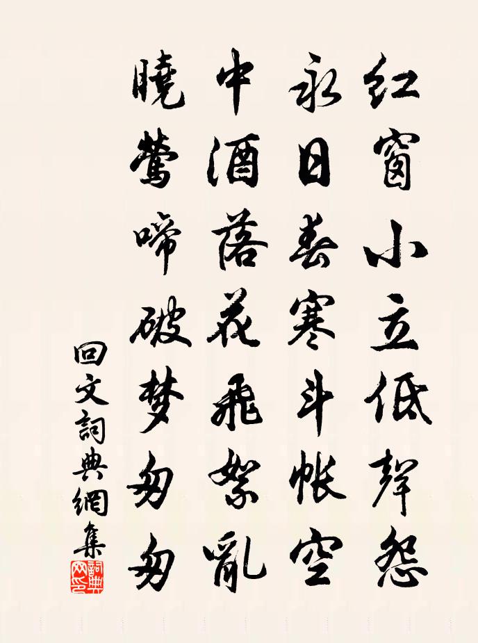 詩詞名句歷史字典書法欣賞書法字典國語詞典說文解字康熙字典古漢語字典標 題 作 者 詩 句 回文作者:佚名 朝代:宋代回文原文紅窗小立低聲怨,永日春寒斗帳空。中酒落花飛絮亂,曉鶯啼破夢匆匆。詩詞問答問:回文的作者是誰?答:佚名問:回文寫於哪個朝代?答:宋代問:佚名的名句有哪些?答:佚名名句大全佚名回文書法欣賞回文書法作品詩詞推薦直指大丹歌呂岩〔唐代〕三清宮殿隱昆巔,日月光浮起紫煙。池沼泓泓翻玉液,樓台疊疊運靈泉。青龍乘火鉛為汞, * 騰波汞作鉛。欲得臨江仙·送宇文德和被召赴行在所張元乾〔宋代〕露坐榕陰須痛飲,從渠疊鼓頻催。暮山新月兩徘徊。離愁秋水遠,醉眼曉帆開。泛宅浮家遊戲去,流行坎止忘懷。挽史館資政木石尢公三首劉克莊〔宋代〕往年群玉頂,典領偶然同。我去如廷秀,君來似放翁。同聃駕牛出,魯叟感麟逢。縱有招魂些,誰為寄浙中。和欲雪二首梅堯臣〔宋代〕雪欲漫天落,雲初著地垂。臂鷹過野健,走馬上冰遲。公子多論酒,騷人自詠詩。都無少年意,只臥竹窗宜。王正卿何道夫和嘉字韻詩至數十道夫贈予數篇李流謙〔宋代〕清言元論極邊涯,南渡風流繼永嘉。中散一生慵作吏,淵明無日不思家。悠悠官路降胸臆,苒苒年光侮鬢華。人說文宣王及其弟子贊宋高宗〔宋代〕樂善哲士,伯於汧陽。傳道克正,垂名允臧。執德以洪,用心必剛。袤廣業履,式贊素王。正月十日夜大雷震范成大〔宋代〕人言有物司鼓,春到揚桴發聲。但要蟄蟲啟戶,何須一許震驚?和子瞻次韻陶淵明停雲詩蘇轍〔宋代〕晚稻欲登,白露霄蒙。人飲嘉平,漿酒如江。我獨何為,觀成於窗。此心瞭然,來無所從。文宣王廟古松李胄〔唐代〕列植成均里,分行古廟前。陰森非一日,蒼翠自何年。寒影煙霜暗,晨光枝葉妍。近檐陰更靜,臨砌色相鮮。每愧勝勝慢(冬至日,用劉春卿韻,送彥逢弟赴官西興)王之道〔宋代〕魯雲書瑞,周日迎長,曉占緹室飛灰。玉勒朝天,千門禁鑰齊開。簾卷扇分雉尾,香風遠、人到蓬萊。霞觴滿,□定海甲寅口號七首陳造〔宋代〕連宵飛雨喜滂流,已入梅天過麥秋。二十年前如此晚,金城地抱卻全收。長相思(京妓·林鐘商)柳永〔宋代〕畫鼓喧街,蘭燈滿市,皎月初照嚴城。清都絳闕夜景,風傳銀箭,露靉金莖。巷陌縱橫。過平康款轡,緩聽歌聲。憶素律公帖贊岳珂〔宋代〕噫懷素,善草書。雜真行,世所無。妙之臻,理不殊。盍反觀,同其初。和人李洪〔宋代〕楊柳疏疏已報秋,月華如水浸階頭。惜無畫手王摩詰,貌取一宵一段愁。四美堂楊萬里〔宋代〕義山禾水在處在,明月清風無地無。光祿子孫寧底巧,不應造物獨私渠。君不見謝家名子取四字,段家作堂兼四美東吳樂/尉遲杯賀鑄〔宋代〕勝游地。信東吳絕景饒佳麗。平湖底,見層嵐,涼月下,聞清吹。人如穠李。泛金袂、香潤苹風起。喜凌波、素襪踏莎行晏幾道〔宋代〕綠徑穿花,紅樓壓水。尋芳誤到蓬萊地。玉顏人是蕊珠仙,相逢展盡雙蛾翠。夢草閒眠,流觴淺醉。一春總見瀛洲賀新郎(李頤正路分見訪,留飲,即席書贈)張鎡〔宋代〕看了梅花去。要東風、攀翻飛雪,與君同賦。海內從來天際眼,一笑平窺千古。待翦盡、燭花紅吐。久矣南湖無此新秋自警王柏〔宋代〕直諒之言久不聞,秋來因作讀書吟。時時涵泳味無味,句句研窮深又深。老去已辜朋友望,閒中粗得聖賢心。無情紹興以後蜡祭四十二首佚名〔宋代〕播種之功,時惟后稷。推以配天,莫匪爾極。崇侑清祀,是為司檣。陳幣奠將,永祚王國。名句推薦萬種思量,多方開解,只恁寂寞厭厭地。柳永《憶帝京·薄衾小枕涼天氣》 來日綺窗前,寒梅著花未。王維《雜詩三首 / 雜詠三首》 寄言燕雀莫相啅,自有雲霄萬里高。李白《觀放白鷹二首》 可堪更近乾龍節,眼中淚盡空啼血向子諲《秦樓月·芳菲歇》 立身之道何窮,只得一敬字,便事事皆整。王永彬《圍爐夜話·第一六三則》 慎厥身,修思永。佚名《尚書·虞書·皋陶謨》 疏籬曲徑田家小。雲樹開清曉。周邦彥《虞美人·疏籬曲徑田家小》 顧此耿耿存,仰視浮雲白。文天祥《正氣歌》 晝出耘田夜績麻,村莊兒女各當家。范成大《夏日田園雜興·其七》 朝來入庭樹,孤客最先聞。劉禹錫《秋風引》