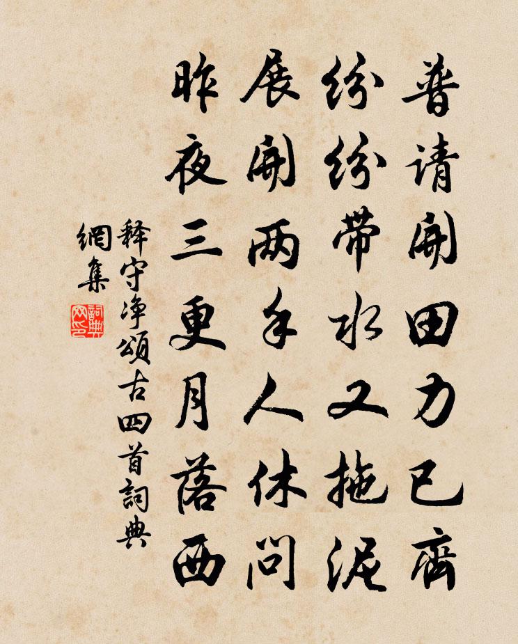 詩詞名句歷史字典書法欣賞書法字典國語詞典說文解字康熙字典古漢語字典標 題 作 者 詩 句 頌古四首作者:釋守淨 朝代:宋代頌古四首原文普請開田力已齊,紛紛帶水又拖泥。展開兩手人休問,昨夜三更月落西。詩詞問答問:頌古四首的作者是誰?答:釋守淨問:頌古四首寫於哪個朝代?答:宋代釋守淨頌古四首書法欣賞頌古四首書法作品詩詞推薦二月十九日席上賦四首魏了翁〔宋代〕露漬風揉嬌婀娜,煙籠日炙綠鬅鬙。風流名字時方污,亦為儀容太不矜。張劍州至劍一日以親憂罷王安石〔宋代〕客舍飛塵尚滿韉,卻尋東路想茫然。白頭反哺秦烏側,流血思歸蜀鳥前。今日相逢知悵望,幾時能到與留連。行看送游景仁夔漕分韻得喜字吳泳〔宋代〕桐花繁欲垂,柳色澹如洗。深谷艤行舟,匆匆春莫矣。廬山蕨已肥。荊渚魚正美。提攜赤藤杖,炊煮白粲火。佳處南徐晚望褚載〔唐代〕芳草鋪香晚岸晴,岸頭含醉去來行。僧歸岳外殘鍾寺,日下江邊調角城。入浙孤帆知楚信,過淮疏雨帶潮聲。如今驀山溪陳濟翁〔宋代〕薰風時候。芍藥披晴晝。天上玉闌乾,展一枰、天家錦繡。漢宮唐殿。嬪御逞妖嬈,飛燕女,太真妃,一樣新妝就句李紳〔唐代〕君詠風月夕,余當童稚年。閒窗讀書罷,偷詠左司篇。書園吏申花開榜子張詠〔宋代〕後園花開紅滿枝,太守倦遊紅不知。看花小吏報花信,太守茫然心忽悲。頭上光陰瞥爾過,昨日少年今老大。見說種花二首蘇轍〔宋代〕築室少閒地,種花能幾畦。松筠舊滿眼,桃李漸成蹊。無計通湖水,長思種藕泥。幽懷終不愜,拄杖出城西。雜興王昌齡〔唐代〕握中銅匕首,紛銼楚山鐵。義士頻報仇, * 不曾缺。可悲燕丹事,終被狼虎滅。一舉無兩全,荊軻遂為血。誠知各遠禍徐照〔宋代〕拙鳩巢杉刺棚,曙出昏入俱不鳴。雙雛脫殼羽翅生,母來哺餵雛無聲。鳩能默默各遠禍,一日高飛啄庭果。送梧州王使君張籍〔唐代〕楚江亭上秋風起,看發蒼梧太守船。千里同行從此別,相逢又隔幾多年。題烏程簿廳浮玉亭七首袁說友〔宋代〕道場山頂出南溪,蒼弁峰頭正直西。更割東橋儀鳳水,如今定不怨鸞棲。陪群公登箕山賦得群字宋之問〔唐代〕許由去已遠,冥莫見幽墳。世薄人不貴,茲山唯白雲。寧知三千歲,復有堯為君。時佐激頹俗,登箕挹清芬。高節簡張槃齋以國朝四君子文易南華經劉宰〔宋代〕我宋百年間,人物兩漢上。堂堂司馬公,奧學邁舒同。廬陵祖韓孟,首以六經唱。升堂子曾子,功亦孟氏抗。荊舒傷農鄭遨〔唐代〕一粒紅稻飯,幾滴牛頷血。珊瑚枝下人,銜杯吐不歇。無題蘇軾〔宋代〕簾卷窗穿戶不扃,隙塵風葉任縱橫。幽人睡足誰呼覺,攲枕床前有月明。贈吳生陸禹臣〔唐代〕露下瑤簪濕,雲生石室寒。星壇鸞鶴舞,丹灶虎龍蟠。次及甫入峽雜詠平善壩洪咨夔〔宋代〕水風靜處拋舡易,山雨晴時著句難。便向箇中占好讖,一程平善過雲安。相和歌辭烏棲曲李端〔唐代〕白馬逐牛車,黃昏入狹斜。柳樹烏爭宿,爭枝未得飛上屋。東房少婦婿從軍,每聽烏啼知夜分。句劉筠〔宋代〕聞說上饒風物好,錢郎詩思奈春何。名句推薦積薄而為厚,聚少而為多劉向《戰國策·秦四·或為六國說秦王》 曲妙人不能盡和,言是人不能皆信。王充《論衡·卷二十七·定賢篇》 此夜星繁河正白,人傳織女牽牛客。沈佺期《七夕曝衣篇》 亭皋木葉下,隴首秋雲飛柳惲《搗衣詩》 漠漠秋雲起,稍稍夜寒生。白居易《微雨夜行》 山抹微雲,天連衰草,畫角聲斷譙門。秦觀《滿庭芳·山抹微雲》 青青園中葵,朝露待日晞。佚名《長歌行》 燕忙鶯懶芳殘,正堤上、柳花飄墜。章楶《水龍吟·燕忙鶯懶芳殘》 章台柳,章台柳,昔日青青今在否?韓翃《章台柳·寄柳氏》 亭上秋風,記去年裊裊,曾到吾廬。辛棄疾《漢宮春·會稽秋風亭觀雨》