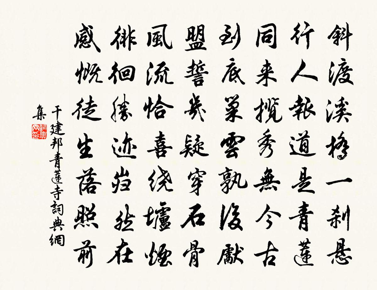詩詞名句歷史字典書法欣賞書法字典國語詞典說文解字康熙字典古漢語字典標 題 作 者 詩 句 青蓮寺作者:乾建邦 朝代:清代青蓮寺原文斜渡溪橋一剎懸,行人報導是青蓮。同來攬秀無今古,到底巢雲孰後先。盟誓幾疑穿石骨,風流恰喜繞壚煙。徘徊勝跡巋然在,感慨徒生落照前。詩詞問答問:青蓮寺的作者是誰?答:乾建邦問:青蓮寺寫於哪個朝代?答:清代乾建邦青蓮寺書法欣賞青蓮寺書法作品詩詞推薦喜晴仇遠〔宋代〕一簾遲日忽開晴,側近園池得散行。盡勝草堂窮處士,有花有酒作清明。陳公樓司馬允中〔宋代〕陳公汲深實奇計,轉向人間作豐歲。轆轤聲曉潛虬寒,玄猿啼在深深樹。次韻答元素蘇軾〔宋代〕不愁春盡絮隨風,但喜丹砂入頰紅。流落天涯先有讖,摩挲金秋會當同。蘧蘧未必都非夢,了了方知不落空。莫把帥寄詩再次韻陳造〔宋代〕才力高下岐雲泥,龜鏡國老乳臭兒。紛紛過眼敗人意,棘端覓猴毛不皮。江西久無金華伯,平水未識元微之。府公和劉珵西湖十洲花嶼舒坦〔宋代〕暖吹紅紫上青枝,掠水風煙巧自持。蜂蝶鸕鶿各芳意,錦囊消得探春詩。霜天曉角(赤壁)辛棄疾〔宋代〕雪堂遷客。不得文章力。賦寫曹劉興廢,千古事、泯陳跡。望中磯岸赤。直下江濤白。半夜一聲長嘯,悲天地、為踏莎行趙溫之〔宋代〕妖艷相偎,清香交噴。花王尤喜來親迎。有如二女事唐虞,群芳休更夸相併。小雨資嬌,輕風借潤。天應知我憐孤友人惠石兩峰巉然取杜子美玉山高並兩峰寒之陳與義〔宋代〕舊喜看書今不看,且留雙眼向孱顏。從來作夢大槐國,此去藏身小玉山。暮靄朝曦一生子,高天厚地兩峰閒。九華春夜二首劉子翬〔宋代〕樓迥星河轉,宵殘鼓角催。重門和月鎖,寒夢繞花回。雁湖先生揆初在旦某以家藏唐畫熾盛光如來像程公許〔宋代〕十方世界香水海,如微塵數無邊億,諸佛各以本誓願,遍坐道場作饒益。稽首兩足熾盛光,具有廣大神通力。剛風暮經新豐市,望遠山楊萬里〔宋代〕小市寒仍靜,斜陽澹欲脯。偶看平野去,不是遠山無。處處遮船住,家家有酒酟。朱樓臨碧水,曾駐玉鑾輿。旅中書懷王炎〔宋代〕燕子未歸寒已退,海棠半落雨初晴。他鄉異縣見春色,遠水平蕪關客情。道路不來黃犬信,煙波深負白鷗盟。數奇點絳唇 途中逢管倅趙彥端〔宋代〕憔悴天涯,故人相遇情如故。別離何遽,忍唱陽關句!我是行人,更送行人去。愁無據。寒蟬鳴處,回首斜陽暮。燕梅堯臣〔宋代〕涎涎只來燕,飛飛自舞空。輕如漢家後,斜避楚颱風。斗折撩沙觜,相高接草蟲。向人全不畏,切莫入吳宮。九日楊公遠〔宋代〕滿城風雨霍然開,不負登臨亦快哉。時俗半無烏帽墮,世情那有白衣來。且沽薄酒酬佳節,欲賦新詩愧短才。折得客舍有懷姚合〔唐代〕旅人無事喜,終日思悠悠。逢酒嫌杯淺,尋書怕字稠。貧來許錢聖,夢覺見身愁。寂寞中林下,飢鷹望到秋。晚登京口倅廳富覽二首陳鑒之〔宋代〕孫劉昔虎視,鐵騎如風雷。白水列蒼嶂,今焉侑予杯。功名詫一時,空雲暫崔嵬。衲子真英雄,一龕老岩隈。次韻葉觀文送杏花李彌遜〔宋代〕春風不與寒威爭,輕雷自轉驚群萌。紛紛桃李厭開謝,杏萼一吐增雙明。吾儕小人不敢觸,瞳送夜合浮香傾。平明酸棗令劉熊碑詩蔡邕〔兩漢〕碑雲。君諱熊。字孟□。廣陵海西人也。清越孤竹。德牟產奇。誠宜褒顯。昭其憲則。乃相□咨度諏詢。採摭謠言靈鷲寺高翥〔宋代〕靈鷲名山萬古名,幾回無事繞廓行。殿前流水晴猶急,塔上春雲晚自生。鶴傍經床聽梵語,鳥窺齋缽候鐘聲。我來名句推薦柳色參差掩畫樓,曉鶯啼送滿宮愁。司馬扎《宮怨 / 閨怨》 寒鴉飛數點,流水繞孤村。楊廣《失題》 美人卷珠簾,深坐顰蛾眉。李白《怨情》 謂女子,先生為姊,後生為妹。佚名《爾雅·釋親》 念月榭攜手,露橋聞笛。周邦彥《蘭陵王·柳》 南陵水面漫悠悠,風緊雲輕欲變秋。杜牧《南陵道中 / 寄遠》 父兄教子弟,必正其身以率子,無庸徒事言詞也。王永彬《圍爐夜話·第三三則》 玉樹歌殘猶有曲,錦帆歸去已無家。曾棨《維揚懷古》 十二樓中盡曉妝,望仙樓上望君王。薛逢《宮詞》 況屬高風晚,山山黃葉飛。王勃《山中》