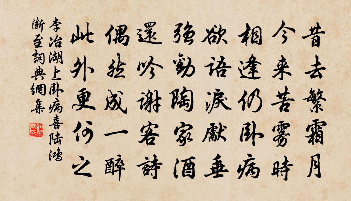詩詞名句歷史字典書法欣賞書法字典國語詞典說文解字康熙字典古漢語字典標 題 作 者 詩 句 湖上臥病喜陸鴻漸至作者:李冶 朝代:唐代湖上臥病喜陸鴻漸至原文昔去繁霜月,今來苦霧時。相逢仍臥病,欲語淚先垂。強勸陶家酒,還吟謝客詩。偶然成一醉,此外更何之。詩詞問答問:湖上臥病喜陸鴻漸至的作者是誰?答:李冶問:湖上臥病喜陸鴻漸至寫於哪個朝代?答:唐代問:湖上臥病喜陸鴻漸至是什麼體裁?答:五律李冶湖上臥病喜陸鴻漸至書法欣賞湖上臥病喜陸鴻漸至書法作品注釋全唐詩:卷805-1詩詞推薦杜秋娘詩杜牧〔唐代〕京江水清滑,生女白如脂。其間杜秋者,不勞朱粉施。老濞即山鑄,後庭千雙眉。秋持玉斝醉,與唱金縷衣。濞既晚庭宋庠〔宋代〕蒼霤秋霖歇,高軒夕景遲。桐凋金井恨,蘭老玉琴悲。巢燕寒初失,風蟬晚屢移。黃昏禽語鬧,相喚宿何枝。金門寺中見李西台與二錢唱和四絕句,戲用其蘇軾〔宋代〕西台妙跡繼楊風,無限龍蛇洛寺中。一紙清詩吊興廢,塵埃零落梵王宮。貴游武衍〔宋代〕鈿車轆轆輾芳塵,步幢香移一片春。花下玉盤行禁臠,御前宣勸到湖濱。感皇恩(壽范倅)辛棄疾〔宋代〕七十古來稀,人人都道。不是陰功怎生到。松姿雖瘦,偏耐雲寒霜曉。看君雙鬢底,青青好。樓雪初晴,庭闈嬉笑阮郎歸(餘干留別人家)趙彥端〔宋代〕三年何許競芳辰。君家千樹春。如今欲去復逡巡。好花留住人。紅蕊亂,綠陰勻。彩雲新又新。只應小闋記情親。讀赤壁賦前後二首文天祥〔宋代〕昔年仙子謫黃州,赤壁磯頭汗漫遊。今古興亡真過影,乾坤俯仰一虛舟。人間憂患何曾少,天上風流更有不。我亦訪枯崖不遇胡仲弓〔宋代〕踏破門前苔蘚斑,尋曦不值只空還。行雲過處青山濕,野水明邊白鳥閒。捫虱有人談古道,揮蠅無路透禪關。杖藜雨中招張司業宿白居易〔唐代〕過夏衣香潤,迎秋簟色鮮。斜支花石枕,臥詠蕊珠篇。泥濘非游日,陰沉好睡天。能來同宿否,聽雨對床眠。無題岳珂〔宋代〕秋水芙蓉試早妝,半軒微雨灑鴛鴦。細腰正欠酬金餅,奮翼何堪卸玉梁。發鬒釵橫人在牖,繩低斗轉月侵床。無情墨梅張嵲〔宋代〕山邊幽谷水邊村,曾被疏花斷客魂。猶恨東風無意思,更吹煙雨暗黃昏。狀江南。孟春鮑防〔唐代〕江南孟春天,荇葉大如錢。白雪裝梅樹,青袍似葑田。晚步傳氏小園陳文蔚〔宋代〕溪園信步晚徘徊,白白紅紅夾徑開。漫折一枝攜在手,也教人道看花來。題義門胡氏華林書院李巽〔宋代〕孝義門風累世修,帝恩旌表耀南州。藏書不特延多士,貢幣仍聞亞列侯。高閣聲寒慈竹雨,小池香老瑞蓮秋。人來春霽高翥〔宋代〕積雪才收雲盡歸,長空一色碧琉璃。日移簾影臨書案,風颭瓶花落研池。巢燕學飛猶戀母,籠雞得食旋呼兒。眼看次韻答賈耘老蘇軾〔宋代〕五年一夢南司州,饑寒疾病為子憂。東來六月井無水,仰看古堰橫奔牛。平生管鮑我知子,今日陳蔡誰從丘。夜航歸路過福聖觀瀑布輝老踞坐盤石二絕題飛雨亭徐大受〔宋代〕一水高懸千尺梭,空林終日影婆娑。仰天雄踞盤陀石,尊者趄身諾巨那。自料張鎡〔宋代〕自料躬耕體力微,他年為圃雅相宜。植茶要是依桑蔭,種芋先須納豆萁。藥愛金櫻長林薄,花因木槿作藩籬。祗應和余汝霖雪七絕胡寅〔宋代〕朱老能詩更謹虔,葉公好學亦窮年。饑寒共何凌霜操,未羨重裘食萬錢。水調歌頭佚名〔宋代〕直節傲山雪,偃畫詠松風。天香真色來報,春信月明中。六七日分景緯,五百年間英氣,相值產維崧。君子中庸也名句推薦天時不如地利,地利不如人和。孟子《孟子·公孫丑章句下·第一節》 千里江山昨夢非,轉眼秋光如許。文徵明《念奴嬌·中秋對月》 都緣自有離恨,故畫作遠山長。歐陽修《訴衷情·眉意》 日落沙明天倒開,波搖石動水縈迴李白《東魯門泛舟二首》 其進銳者,其退速。孟子《孟子·盡心章句上·第四十四節》 掃眉才子知多少,管領春風總不如。王建《寄蜀中薛濤校書》 言必信,行必果。孔子弟子《論語·子路篇》 女媧鍊石補天處,石破天驚逗秋雨。李賀《李憑箜篌引》 蠶娘洗繭前溪淥,牧童吹笛和衣浴。貫休《春晚書山家屋壁二首》 傷心庾開府,老作北朝臣。司空曙《金陵懷古》