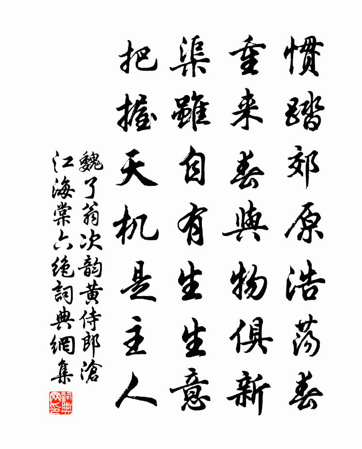 詩詞名句歷史字典書法欣賞書法字典國語詞典說文解字康熙字典古漢語字典標 題 作 者 詩 句 次韻黃侍郎滄江海棠六絕作者:魏了翁 朝代:宋代次韻黃侍郎滄江海棠六絕原文慣踏郊原浩蕩春,重來春與物俱新。渠雖自有生生意,把握天機是主人。詩詞問答問:次韻黃侍郎滄江海棠六絕的作者是誰?答:魏了翁問:次韻黃侍郎滄江海棠六絕寫於哪個朝代?答:宋代魏了翁次韻黃侍郎滄江海棠六絕書法欣賞次韻黃侍郎滄江海棠六絕書法作品詩詞推薦頌古十八首釋師一〔宋代〕不是旛兮不是風,軒轅寶鑑出懷中。森羅萬象難逃影,戀窟狐狸失卻蹤。題蕭照山水舒岳祥〔宋代〕翩翩涼樹下茅堂,揖客柴門去棧長。山外橫舟篷不啟,誰知世有送迎忙。明日南禪和詩不到故重賦數珠篇以督之二首蘇軾〔宋代〕未來不可招,已過那容遣。中間現在心,一一風輪轉。自從一生二,巧曆莫能衍。不如袖手坐,六用都懷卷。風雷漢宮春·著破荷衣趙汝茪〔宋代〕著破荷衣,笑西風吹我,又落西湖。湖間舊時飲者,今與誰俱?山山映帶,似攜來、畫卷重舒。三十里,芙蓉步障鄞城火後見光遠戴表元〔宋代〕火後丘墟市,兵前風雨春。那知攜手地,俱是皺眉人。海柳吟猶弱,山鶯聽未真。明朝各分路,何處避風塵。江上晚眺書所見李流謙〔宋代〕雲鎔金錯落,月掛玉盤盂。水退岸全缺,煙陳山欲無。沙晴鷗並集,林暝鳥爭呼。不必求摩詰,分明是畫圖。陳庭翠水竹清處艾性夫〔宋代〕晴波漾文綺,風篁弄家聲。居然三市中,著此一段清。幽人自地偏,淡趣由天成。洗耳日以靜,抱節日以貞。從君卜運算元(丙午春即席和從善)趙師俠〔宋代〕楊柳褪金絲,艷杏搖紅影。欲雨還晴二月天,春色渾無定。曉夢不堪驚,午晝新來永。一掬歸心萬疊愁,空惹長亭無著復欲去再作此留之吳則禮〔宋代〕都梁日日招吾人,梅花已復矜小春。胡為要隨白雁去,莫起此念僧伽嗔。彈琴幾時鬢毛脫,端是天教箇中活。僧伽有嘆二首范成大〔宋代〕春秋蘭菊殊調,南北馬牛異方。心醉井蛙海若,眼空鵬海鳩枋。比以拙詩戲調張籍不知作者已盈軸矣輒矣輒和鄭清之〔宋代〕展也虞朝遮績熙,合修厥貢暨熊貍。兕容於野雖非地,豹澤其文似識時。毛革正須供有用,血牙安事殺為嬉。國僑贈故將軍李端〔唐代〕平生在邊日,鞍馬若星流。獨出間千里,相知滿九州。恃功凌主將,作氣見王侯。誰道廉頗老,猶能報遠讎。短歌行曹叡〔魏晉〕翩翩春燕。端集余堂。陰匿陽顯。節運自常。厥貌淑美。玄衣素裳。歸仁服德。雌雄頡頏。執志精專。絜行馴良。寄林子方陳俊卿〔宋代〕雙闕門高襲慶余,相望再世擁軺車。清名益重先君子,遠俗爭看行秘書。醫國十全姑小試,蠹民五瘴想先除。炎州敘事獻同州侍御三首趙嘏〔唐代〕青席雲席中羅席襪塵,白席首江上吟席詩人。登龍不及三千士,虛度膺門二十春。平生望斷雲層層,紫府杳是他人浣溪沙薛昭蘊〔唐代〕紅蓼渡頭秋正雨,印沙鷗跡自成行,整鬟飄袖野風香。不語含嚬深浦里,幾回愁煞棹船郎,燕歸帆盡水茫茫。鈿匣奉和周蕃伯用王道夫韻二章見寄陳傅良〔宋代〕論定千年後,心寬萬事平。吾方慚鼠伎,安敢道鴻冥。門戶雖入境,溪山亦世情。半天喬木立,盡日好禽鳴。感懷 其一王冕〔元代〕太極本一氣,胡為兩儀分?生生立名字,萬匯遂紜紜。洪荒不足征,至精亦已淪。□蕕茂佳景,蔥□爭□□。□□送嚴上舍並寄諸公十首寄何解元陳造〔宋代〕交際論才業,何郎種種長。元推萬人敵,況別四年強。文看青錢中,詩須古錦藏。西歸容盥讀,老境借輝光。秋思黃庚〔宋代〕天容凝碧換秋容,殘暑泠然一洗空。梧葉多應愁夜雨,葛衣漸覺怯西風。十分冷淡砧聲外,一片淒涼雁影中。興動名句推薦夜寒不近流蘇,只憐他、後庭梅瘦。毛滂《上林春令·十一月三十日見雪》 知足之心,可用之以處境,不可用之以讀書。王永彬《圍爐夜話·第一五九則》 南軒有孤松,柯葉自綿冪。李白《南軒松》 何當共剪西窗燭,卻話巴山夜雨時。李商隱《夜雨寄北》 天下難事,必作於易;天下大事,必作於細。老子《老子·德經·第六十三章》 松月生夜涼,風泉滿清聽。孟浩然《宿業師山房期丁大不至 / 宿業師山房待丁大不至》 葉潤林塘密,衣乾枕席清。杜甫《水檻遣心二首》 後不乏人,榮之方久,賢者自苦亦惠嗣。來俊臣《羅織經·固榮卷第六》 舒捲江山圖畫,應答龍魚悲嘯,不暇顧詩愁。楊炎正《水調歌頭·登多景樓》 武帝宮中人去盡,年年春色為誰來。岑參《登古鄴城》
