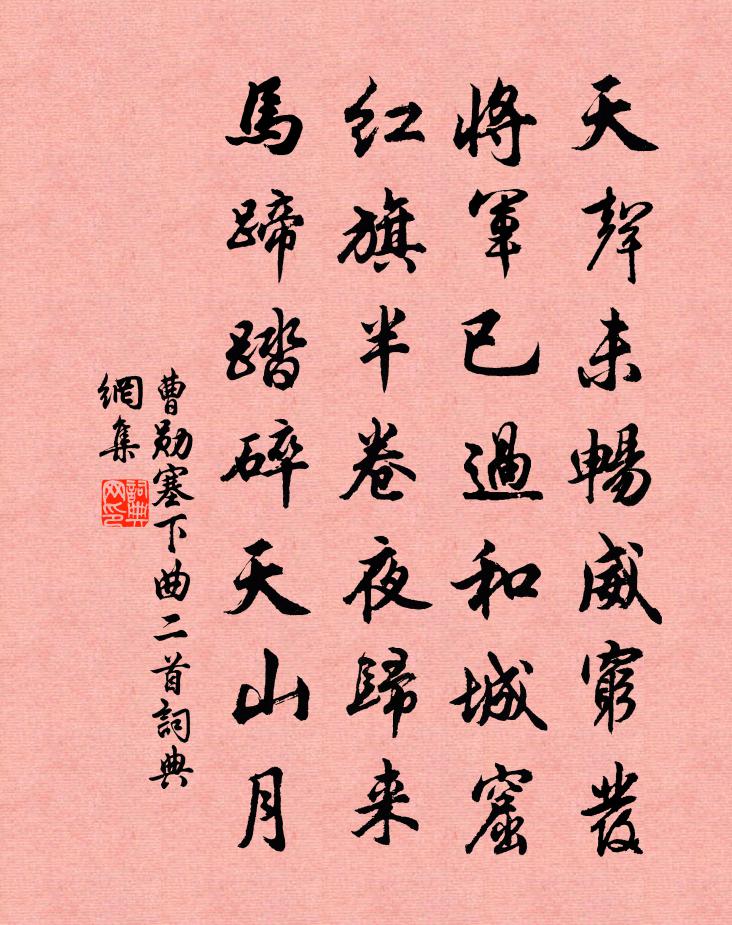 詩詞名句歷史字典書法欣賞書法字典國語詞典說文解字康熙字典古漢語字典標 題 作 者 詩 句 塞下曲二首作者:曹勛 朝代:宋代塞下曲二首原文天聲未暢威窮髮,將軍已過和城窟。紅旗半卷夜歸來,馬蹄踏碎天山月。詩詞問答問:塞下曲二首的作者是誰?答:曹勛問:塞下曲二首寫於哪個朝代?答:宋代問:塞下曲二首是什麼體裁?答:七絕曹勛塞下曲二首書法欣賞塞下曲二首書法作品詩詞推薦遣興吳汝弌〔宋代〕弱齡性淡泊,鄭圃吾其師。及茲拙生事,窮窘常經時。無方可紆包,何以宣中懷。柴門蔽殘席,詠書倦徘徊。呼兒安城即事三首陶弼〔宋代〕往歲傳聞南詔檄,近時方築伏波城。安城太守知邊計,菡萏花中閱水兵。示惠靈為僧釋智愚〔宋代〕惠性何如見性通,要教靈驗顯吾宗。剩地揚下墜腰石,笑捧衣盂繼祖風。送郭秀才顧況〔唐代〕故人曾任丹徒令,買得青山擬獨耕。不作草堂招遠客,卻將垂柳借啼鶯。即席黃庭堅〔宋代〕落葉不勝掃,月明樹陰疏。親鄰二三子,樽酒相與俱。霜栗剝寒橐,晚菘煮青蔬。解官方就門,敦薄無簡書。純益次山房贈阮尉燭詩韻何夢桂〔宋代〕翩翩佳公子,青絲絡白顛。黃綬映春花,來作吏隱仙。鳴琴鎮白下,賦劍起通泉。誰分讀書燭,良價重蠟鞭。官燭寄洞元師鄭獬〔宋代〕洞元道士酒中仙,散發人間五十年。醉後不知山月上,竹間橫枕一琴眠。由建寧回三山道中重陽喻良能〔宋代〕征鞍初自富沙還,亂葉殷紅點碧山。客里黃花驚度節,鏡中白髮巧摧顏。三休磴道惟頻嘆,一飯茆檐得暫閒。為想歸鳥 其一陶淵明〔魏晉〕翼翼歸鳥,晨去於林。遠之八表,近憩雲岑。和風不洽,翻翮求心。顧儔相鳴,景庇清陰。有所嘆五首張耒〔宋代〕蠍能毒人不能死,人能捕蠍殘其類。世人意惡蠍為虐,人蠍相殘竟誰至。不參彼已怨一方,自古詩人以為刺。我疑暮秋山行岑參〔唐代〕疲馬臥長坡,夕陽下通津。山風吹空林,颯颯如有人。蒼旻霽涼雨,石路無飛塵。千念集暮節,萬籟悲蕭晨。鶗鴂送朱行中守潤蔡肇〔宋代〕東南聞詔想風流,竹馬津亭待去舟。夾案曾為新右史,分符仍是古諸侯。大江注海吞三島,高閣臨城覽五州。筆力次韻富修仲見贈二首范浚〔宋代〕故人欣面款,令我得眉伸。意有千金重,詩無一字陳。清規看後裔,賢業想前人。會續安邊策,何當謁紫宸。句釋惠崇〔宋代〕井含春氣碧,樓轉夕陰清。嚴隱君九齡適軒謝諤〔宋代〕陶公勳業在姑蘇,扁舟歸來春水湖。張良亦從赤松子,拋擲兵閒黃石書。平吳戮項本無事,所適定非真適意。戰酣感事四首丙午冬淮上作張元乾〔宋代〕血灑三城渡,心寒粘罕兵。洛師聞已破,陵邑得無驚。憤切吞妖孽,悲涼托聖明。本朝仁澤厚,會復見承平。通州雨夜寄孫中叔鄭獬〔宋代〕黑雨噴薄陰雲驅,昏林號風秋聲粗。海氣熏煮怒不泄,彭彭十月推雷車。濕衣憫默瞠無睡,起對樽酒誰為娛。此心句牟及〔宋代〕何日脊令還並影,舊時豚犬已成空。困雨葵心終向日,隨風柳絮慢漫天。金剛隨機無盡頌知見不生分第三十一釋印肅〔宋代〕法應如是解,其餘休捏怪。六臂任三頭,一心無變壞。句戴叔倫〔唐代〕鄰里龍沙北。(《臨川六詠》)。麥秋桑葉大,梅雨稻田新。籬落栽山果,池塘養錦鱗。第二百七十五卷名句推薦亭皋木葉下,隴首秋雲飛柳惲《搗衣詩》 兩岸荔枝紅,萬家煙雨中。李師中《菩薩蠻·子規啼破城樓月》 秋風起兮白雲飛,草木黃落兮雁南歸。劉徹《秋風辭》 所謂伊人,在水一方。佚名《蒹葭》 千里馬常有,而伯樂不常有。韓愈《馬說》 登舟望秋月,空憶謝將軍。李白《夜泊牛渚懷古》 歲寒,然後知松柏之後凋也。孔子弟子《論語·子罕篇》 離歌且莫翻新闋。一曲能教腸寸結。歐陽修《玉樓春·尊前擬把歸期說》 孤村芳草遠,斜日杏花飛。寇準《江南春·波渺渺》 呼童烹雞酌白酒,兒女嬉笑牽人衣。李白《南陵別兒童入京》