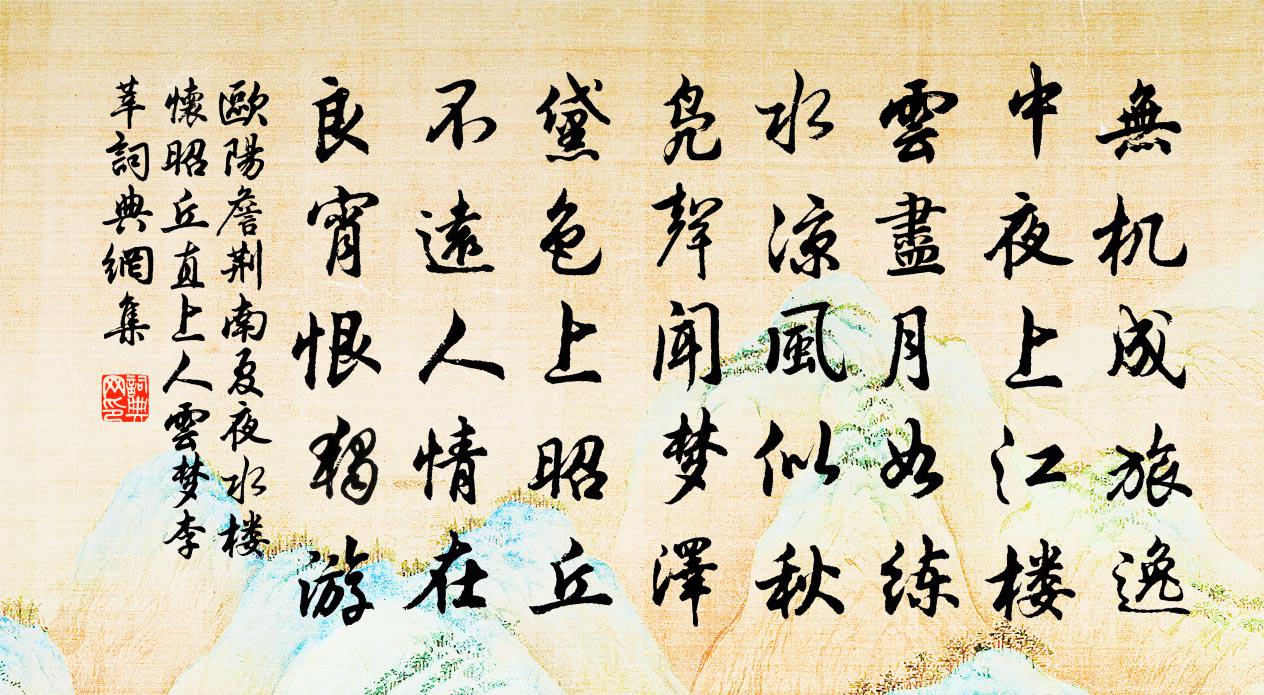 - 織錦相思樓影下,鈿釵暗約小簾間。吳文英《新雁過妝樓·中秋後一夕李方庵月庭延客命小妓過新水令坐間賦詞》