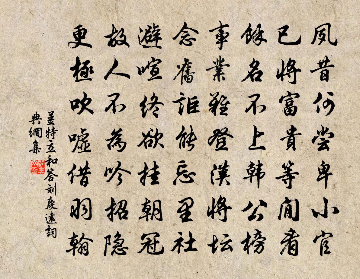 詩詞名句歷史字典書法欣賞書法字典國語詞典說文解字康熙字典古漢語字典標 題 作 者 詩 句 和答劉慶遠作者:姜特立 朝代:宋代和答劉慶遠原文夙昔何嘗卑小官,已將富貴等閒看。余名不上韓公榜,事業難登漢將壇。念舊詎能忘里社,避喧終欲掛朝冠。故人不為吟招隱,更極吹噓借羽翰。詩詞問答問:和答劉慶遠的作者是誰?答:姜特立問:和答劉慶遠寫於哪個朝代?答:宋代姜特立和答劉慶遠書法欣賞和答劉慶遠書法作品詩詞推薦次韻和知郡朝奉登禪月台書事二首孔武仲〔宋代〕物有賤而貴,勸公收樺皮。自能全烈火。何用爇香脂。山徑狂風夜,茅檐密雪時。金連猝難買,唯此頗相宜。和答北山劉克莊〔宋代〕北山當代文章祖,孔思周情幸未泯。弟子力疲心尚在,先生齒宿意逾新。今無斬鼻成風手,古有埋腰立雪人。不向清旦題採藥翁草堂溫庭筠〔唐代〕幽人尋藥徑,來自曉雲邊。衣濕術花雨,語成松嶺煙。解藤開澗戶,踏石過溪泉。林外晨光動,山昏鳥滿天。酬太原令狐相公見寄劉禹錫〔唐代〕書信來天外,瓊瑤滿匣中。衣冠南渡遠,旌節北門雄。鶴唳華亭月,馬嘶榆塞風。山川幾千里,惟有兩心同。戲贈侯常侍李洞〔唐代〕葛洪卷與江淹賦,名動天邊傲石居。兩蜀詞人多載後,同君諱卻馬相如。瑞鶴仙方岳〔宋代〕岳敢拜手而言曰:月窮於紀,星回於天,蓋三百有六旬有六日於是焉極、而歲功成矣。惟天之運,循環無窮,一氣劉後溪和雁湖即事詩十絕見示次韻洪咨夔〔宋代〕金穀人家大謬悠,春江自理送窮舟。漁人拍手從旁笑,淡飯粗衣過即休。洪城沈運乾新園三首程公許〔宋代〕柏梢結翠斗尖新,未問花枝插寶瓶。最好狻猊對雛鳳,向人翔躍似天成。試筆六言二首劉克莊〔宋代〕薰玉蕤香解穢,挽銀河水滌塵。雖非補造化筆,不似食煙火人。發高沙文天祥〔宋代〕曉發高沙臥一航,平沙漠漠水茫茫。舟人為指荒煙岸,南北今年幾戰場。紫河張休真曹唐〔唐代〕琪樹扶疏壓瑞煙,玉皇朝客滿花前。山川到處成三月,絲竹經時即萬年。樹石冥茫初縮地,杯盤狼藉未朝天。東風頌古一百則釋正覺〔宋代〕見有不有,翻手覆手。瑯琊山里人,不落瞿曇後。喜遷鶯蔡挺〔宋代〕霜天清曉。望紫塞古壘,寒雲衰草。汗馬嘶風,邊鴻翻月,壠上鐵衣寒早。劍歌騎曲悲壯,盡道君恩難報。塞垣樂陽羨雜詠十九首。觀妙庵陸希聲〔唐代〕妙理難觀旨甚深,欲知無欲是無心。茅庵不異人間世,河上真人自可尋。珍珠簾/真珠簾葛長庚〔宋代〕陰陽內感相交結。有鉛汞、分八卦羅列。金鼎煉黃芽,正一陽時節。子後午前方進火,向玉爐、烹成白雪。通徹。春雪題興善寺廣宣上人竹院楊巨源〔唐代〕皎潔青蓮客,焚香對雪朝。竹內催淅瀝,花雨讓飄颻。觸石和雲積,縈池拂水消。只應將日月,顏色不相饒。夜飲元稹〔唐代〕燈火隔簾明,竹梢風雨聲。詩篇隨意贈,杯酒越巡行。漫唱江朝曲,閒征藥草名。莫辭終夜飲,朝起又營營。酬李補闕雨中寄贈崔峒〔唐代〕十年隨馬宿,幾度受人恩。白髮還鄉井,微官有子孫。竹窗寒雨滴,苦砌夜蟲喧。獨愧東垣友,新詩慰旅魂。秦處士移家富春發樟亭懷寄李郢〔唐代〕潮落空江洲渚生,知君已上富春亭。嘗聞郭邑山多秀,更說官僚眼盡青。離別幾宵魂耿耿,相思一座發星星。仙翁潘貴妃徐鈞〔宋代〕寵冠天家十二樓,金蓮步步總嬌羞。可憐屠沽宮中樂,博得亡齊一段愁。名句推薦縱被無情棄,不能羞。韋莊《思帝鄉·春日游》 眾鳥高飛盡,孤雲獨去閒。李白《獨坐敬亭山》 雲霞出海曙,梅柳渡江春。杜審言《和晉陵陸丞早春遊望》 此時瞻白兔,直欲數秋毫。杜甫《八月十五夜月二首》 吾未聞枉己而正人者也,況辱己以正天下者乎。孟子《孟子·萬章章句上·第七節》 野客預知農事好,三冬瑞雪未全消。戴復古《除夜》 匝路亭亭艷,非時裛裛香。李商隱《十一月中旬至扶風界見梅花》 言以足志,文以足言。左丘明《左傳·襄公·襄公二十五年》 君者,舟也;庶人者,水也。水則載舟,水則覆舟。荀子《荀子·哀公》 三十功名塵與土,八千里路雲和月。岳飛《滿江紅·寫懷》