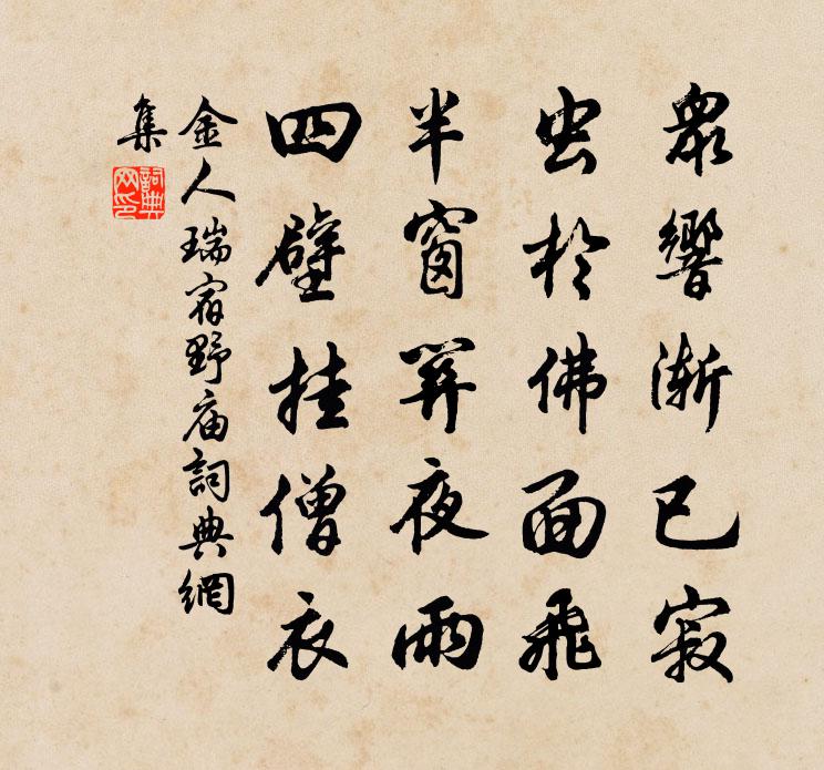 詩詞名句歷史字典書法欣賞書法字典國語詞典說文解字康熙字典古漢語字典標 題 作 者 詩 句 宿野廟作者:金人瑞 朝代:清代宿野廟原文眾響漸已寂,蟲於佛面飛。半窗關夜雨,四壁掛僧衣。詩詞問答問:宿野廟的作者是誰?答:金人瑞問:宿野廟寫於哪個朝代?答:清代金人瑞宿野廟書法欣賞宿野廟書法作品詩詞推薦山中雜興 其二王冕〔元代〕因拜山農號,生涯日日新。帶泥移瘦竹,和蘚擇枯薪。時酌山泉賞,都無世俗塵。烏鳶雖見忌,麋鹿自相親。頌古五十七首釋道昌〔宋代〕馬前相撲,入交失腳。不來外求,當面修削。六合彼中身,分明舉似人。到處世界總成就,脫略窠臼還滲漏。隆興書堂自警三十五首陳淳〔宋代〕詩蔽思無邪,禮主毋不敬。二言書諸紳,時時與涵泳。題畫廿四首唐寅〔明代〕山亭寥落接人稀,泥補柴門葉補衣。不起竹床頭似雪,已無心去問襌機。偶步劉子翬〔宋代〕偶步忘歸遠,心閒逸興增。山深知有寺,路盡不逢僧。古楓錢時〔宋代〕白雲岩下古株風,洞洞從根透頂空。認得自空真面目,逢春葉綠到秋紅。出都留別諸公康有為〔清代〕滄海驚波百怪橫,唐衢痛哭萬人驚。高峰突出諸山妒,上帝無言百鬼獰。豈有漢庭思賈誼,拚教江夏殺禰衡。陸沉昭君怨蔡伸〔宋代〕一曲雲和松響。多少離愁心上。寂寞掩屏帷。淚沾衣。最是銷魂處。夜夜綺窗風雨。風雨伴愁眠。夜如年。次韻江子我蠟梅二首晃沖之〔宋代〕步屧穿花醉曉風,翻枝摘葉興何窮。他年上苑求佳種,越白江紅掃地空。浪淘沙(中秋雨)蕭漢傑〔宋代〕愁似晚天雲。醉亦無憑。秋光此夕屬何人。貧得今年無月看,留滯江城。夜起候檐聲。似雨還晴。舊家誰信此時情賦劉子澄墨莊趙蕃〔宋代〕勤力漢疏傅,遺安龐德公。公家業異此,衰盛國應同。紀愁晃沖之〔宋代〕北風吹我裳,夏潦漂我屋。牛羊踐我稼,雀鼠耗我谷。雪寒附我指,雨 * 疾我腹。朝行桑榆間,秋序傷遠目。莫寄題仰止亭曾豐〔宋代〕廬陵江滸路窮處,舟子不容仙子渡。豈意一篙落手來,而資雙足凌波去。睥睨大海如江然,杯渡佛輕篙渡仙。休負寄和州韓舍人徐鉉〔唐代〕急景駸駸度,遙懷處處生。風頭乍寒暖,天色半陰晴。久別魂空斷,終年道不行。殷勤雲上雁,為過歷陽城。感弄猴人賜朱紱羅隱〔唐代〕十二三年就試期,五湖煙月奈相違。何如買取胡孫弄,一笑君王便著緋。謁金門張元乾〔宋代〕風露底。石上岸巾愁起。月到房心天似水。亂峰清影里。此去登瀛須記。今夕道山同醉。春殿明年人共指。玉皇香酹江月 題酒譚處端〔元代〕杜康得妙,釀三光真秀,清澄醇酎。太白仙才乘興飲,一斗佳篇百首。倒載山翁,襄陽童稚,笑唱齊拍手。陶潛籬醉睡初覺偶作陸游〔宋代〕小圃醒還醉,幽窗起復眠。虛明炷香地,清潤斸花天。老去才雖盡,窮來志益堅。阿瞞那可語,平日笑橋玄。白雲溪吳鞏〔唐代〕山逕入修篁,深林蔽日光。夏雲生嶂遠,瀑水引溪長。秀跡逢皆勝,清芬坐轉涼。回看玉樽夕,歸路賞前忘。玩丹砂 贈張仙馬鈺〔元代〕決烈修持大丈夫。專心致志免三塗。冰清玉潔個塵無。空里人頭歡笑落,壺中斗柄斡旋舒。丹成九轉駕雲輿。名句推薦霧冷笙簫,風輕環佩,玉鎖無人掣朱敦儒《念奴嬌·插天翠柳》 二月黃鶯飛上林,春城紫禁曉陰陰。錢起《贈闕下裴舍人》 山中夜來月,到曉不曾看。元好問《倪莊中秋》 怨別自驚千里外,論交卻憶十年時。高適《東平別前衛縣李寀少府 / 送前衛縣李宷少府》 從善如登,從惡如崩司馬光《資治通鑑·魏紀·魏紀三》 徒善不足以為政,徒法不能以自行。孟子《孟子·離婁章句上·第一節》 知者順時而謀,愚者逆理而動范曄《後漢書·列傳·朱馮虞鄭周列傳》 謾道愁須殢酒,酒未醒、愁已先回秦觀《滿庭芳·碧水驚秋》 浮雲柳絮無根蒂,天地闊遠隨飛揚。韓愈《聽穎師彈琴》 善不積不足以成名,惡不積不足以滅身。佚名《易傳·繫辭傳下·第五章》