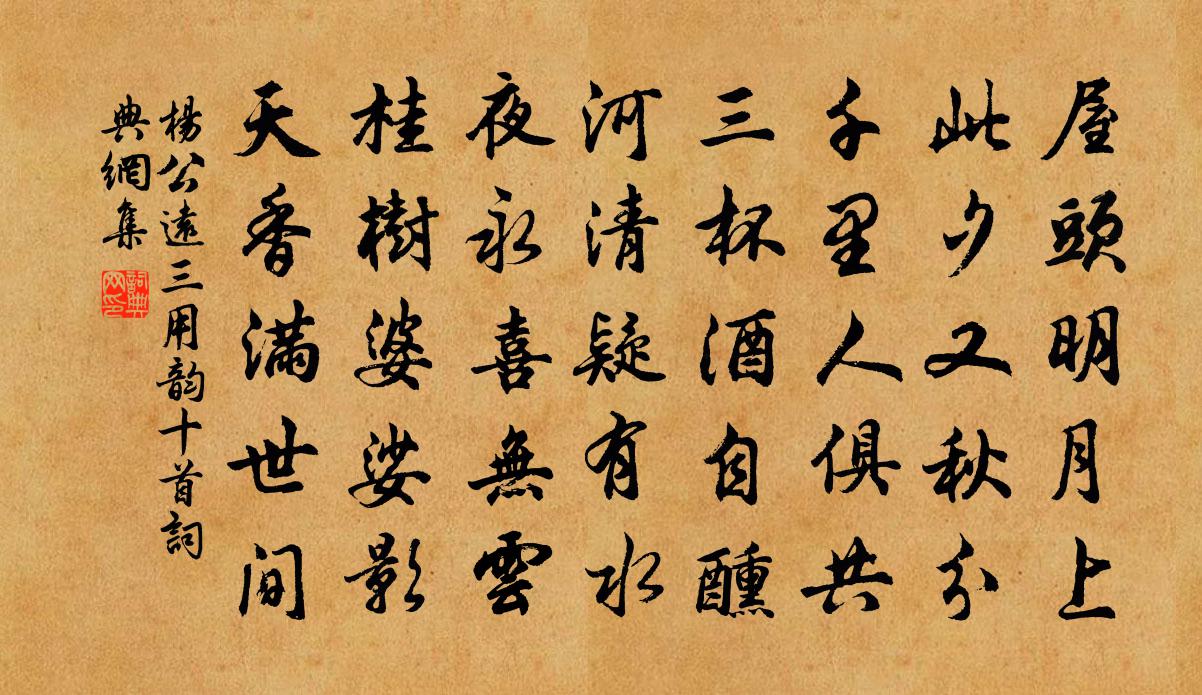詩詞名句歷史字典書法欣賞書法字典國語詞典說文解字康熙字典古漢語字典標 題 作 者 詩 句 三用韻十首作者:楊公遠 朝代:宋代三用韻十首原文屋頭明月上。此夕又秋分。千里人俱共,三杯酒自醺。河清疑有水,夜永喜無雲。桂樹婆娑影,天香滿世間。詩詞問答問:三用韻十首的作者是誰?答:楊公遠問:三用韻十首寫於哪個朝代?答:宋代楊公遠三用韻十首書法欣賞三用韻十首書法作品詩詞推薦鷓鴣天黃機〔宋代〕柳際梅邊臘雪乾。釵頭蝴蝶又成團。飄零萍梗江湖客,冷落笙簫燈火天。澆濁酒,惜流年。牙旗夜市幾時穿。太平挑濠歌羅椅〔宋代〕滿城挑濠五更起,城頭直挑到城尾。一彎一轉春蛇長,圍人方圓三十里。去年十月霜淒淒,挑濠人立霜中啼。今年雪孟郊〔唐代〕忽然太行雪,昨夜飛入來。崚嶒墮庭中,嚴白何皚皚。奴婢曉開戶,四肢凍徘徊。咽言詞不成,告訴情狀摧。官給和頓教授見寄用除夜韻蘇軾〔宋代〕我笑陶淵明,種秫二頃半。婦言既不用,還有責子嘆。無弦則無琴,何必勞撫玩。我笑劉伯倫,醉發蓬茅散。二豪虞美人(詠古)李彌遜〔宋代〕上陽遲日千門鎖。花外流鶯過。一番春去又經秋。惟有深宮明月、照人愁。暗中白髮隨芳草。卻恨容顏好。更無魂蟠龍菴白玉蟾〔宋代〕五乳峰前第幾峰,碧潭深處有蟠龍。半岩冷落孔明雨,一枕蕭騷少說風。變化爪牙君子竹,埋藏頭角大夫松。高人雨後十小絕以一雨洗殘暑萬家生早涼為韻章甫〔宋代〕暄濁氣未收,夜雨聊一洗。心清不受塵,眼淨豈容眯。步上黃羆嶺項安世〔宋代〕牛頭鶴弄漫虛傅,未抵黃羆路剌天。曳杖徐行君自樂,世間何地不平田。賀張肖翁參政姜夔〔宋代〕太一圖書客屢談,已知上相出淮南。銀台日月非虛過,金鼎功名得細參。從此與人為雨露,應憐有客臥雲嵐。明朝失意書懷呈知己馬戴〔唐代〕直道何由啟聖君,非才誰敢議論文。心存黃籙與丹訣,家憶青山與白雲。麋鹿幽棲閒可近,鴛鸞高舉勢宜分。微生禹帝祠道中喻良能〔宋代〕薰風正欲拂江梅,去歲茲晨宿霧開。新竹出牆荷貼水,今年潦倒又重來。別張粹一首劉克莊〔宋代〕同謁金閨覲茂陵,鼎湖弓劍隔西興。絕憐晚景如龐老,空為州人惜許丞。自有名姬調綠綺,可無侍女直青綾。夢中再游頭陀寺李涉〔唐代〕無因暫泊魯陽戈,白髮兼愁日日多。只恐雪晴花便盡,數來山寺亦無他。嘲中條文同〔宋代〕荊山赴太華,百萬如走駝。嘴尾不相殊,前後翻海波。既至擁而蹲,仰首爭列羅。太華勢愈尊,引手欲下摩。中條詩呈同院溫益〔宋代〕秋日同文館,文編亦共攜。升沉都莫問,榮辱已能齊。酒美何妨醉,詩成強自題。從容約歸日,訪子省闈西。延安道中作司馬光〔宋代〕羈旅兼邊思,川原蹀血新。煙雲長帶雨,草樹不在春。細水淘沙骨,驚飈轉路塵。今朝見烽火,白首太平人。水村歌錢仲鼎〔宋代〕舟搖搖兮,風嫋嫋兮。波鱗鱗兮,鷗翩翩兮。扣舷漁歌兮,孰知其他兮。失調名佚名〔宋代〕要解心頭愁悶,除非殢酒。蝶戀花晏幾道〔宋代〕碧玉高樓臨水住,紅杏開時,花底曾相遇。—曲陽春春已暮,曉鶯聲斷朝雲去。遠水來從樓下路,過盡流波,未得天谷菴白玉蟾〔宋代〕半天突出一奇峰,小小茅檐滋味濃。夾道新松招夜月,滿林幽竹喚秋風。迎人野鳥間關語,惱客岩花爛熳紅。策杖名句推薦起舞徘徊風露下,今夕不知何夕。蘇軾《念奴嬌·中秋》 酌酒與君君自寬,人情翻覆似波瀾。王維《酌酒與裴迪》 志足而言文,情信而辭巧劉勰《文心雕龍·徵聖》 試玉要燒三日滿,辨材須待七年期。白居易《放言五首·其三》 織婦何太忙,蠶經三臥行欲老。元稹《織婦詞》 莫辭酒味薄,黍地無人耕。杜甫《羌村三首·其三》 一聲已動物皆靜,四座無言星欲稀。李頎《琴歌》 攜扙來追柳外涼,畫橋南畔倚胡床。秦觀《納涼》 及時當勉勵,歲月不待人。陶淵明《雜詩·人生無根蒂》 盡教春思亂如雲,莫管世情輕似絮晏幾道《玉樓春·雕鞍好為鶯花住》