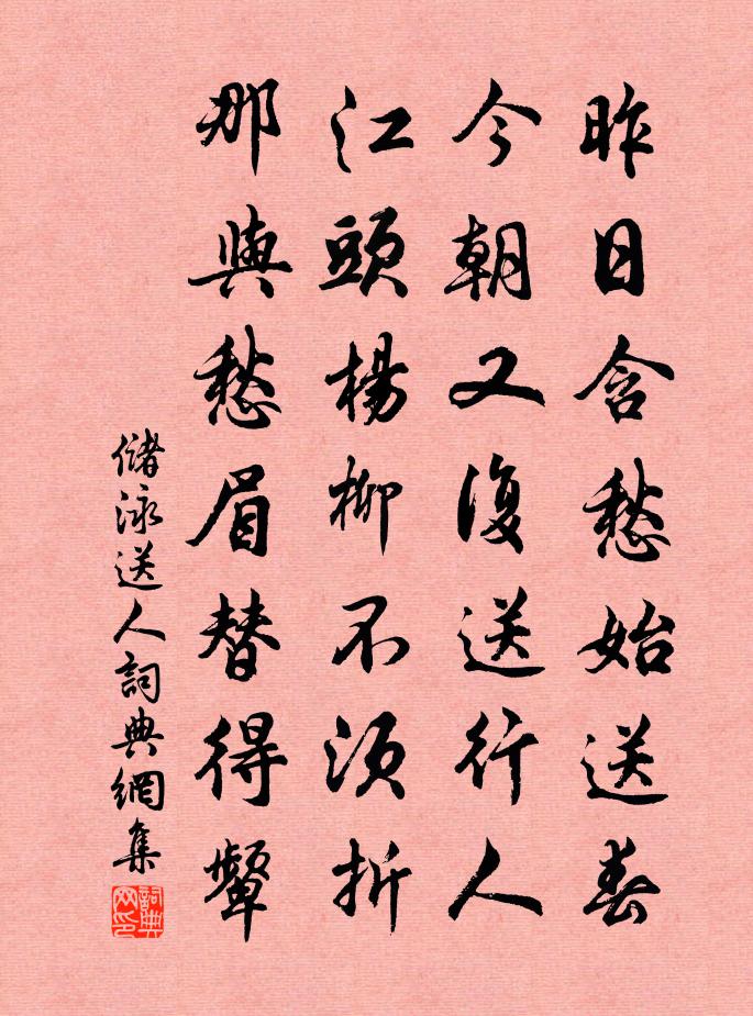 詩詞名句歷史字典書法欣賞書法字典國語詞典說文解字康熙字典古漢語字典標 題 作 者 詩 句 送人作者:儲泳 朝代:宋代送人原文昨日含愁始送春,今朝又復送行人。江頭楊柳不須折,那與愁眉替得顰。詩詞問答問:送人的作者是誰?答:儲泳問:送人寫於哪個朝代?答:宋代儲泳送人書法欣賞送人書法作品詩詞推薦送張支使陳師道〔宋代〕曠度逢知晚,高才處下難。清秋一鶚上,拭目萬人看。白酒初同醉,黃花已戒寒。憑將衰老事,一一報長安。讀秦紀七絕劉克莊〔宋代〕黔首死於城者眾,杞梁身直一微塵。不知當日征入婦,親送寒衣有幾人。梅花翅二首賈似道〔宋代〕翅似梅花蜘蛛形,身上如同梅花片。如此之蟲亦怪哉,滿場鬭勝真堪羨。丈亭潘璵〔宋代〕今古此行路,往來無了期。荒亭塵壓旁,廢廟土侵碑。日落空江暮,山遙去鳥遲。待潮潮未長,沽醉且吟詩。北院白居易〔唐代〕北院人稀到,東窗地最偏。竹煙行灶上,石壁臥房前。性拙身多暇,心慵事少緣。還如病居士,唯置一床眠。子真子常餉雙鴛將以五言效顰三首以謝劉克莊〔宋代〕顧影矜毛羽,晴川偶泳游。不知誰打鴨,驚去不回頭。題布袋和尚豐乾禪師寒山拾得畫卷方回〔宋代〕今有二異僧,一虎隨之入城市,一曳布袋引群小兒,民間不鼎沸喧鬨乎。以人情觀之,書本相傳如此,既未親見,詠史下劉裕陳普〔宋代〕 * 廣固哭如雷,肯任長安住不回。想是齊秦人共語,不知胡羯自南來。秋懷十首末章稍自振起亦古義也陸游〔宋代〕遇酒幸一醉,遇飯幸一飽。或遇空無時,豈復有他巧?鄉鄰哀其窮,叩戶饋麋青。欣然出舍傍,菘韭青落爪。飢羸十二月二十九夜大雪三首楊公遠〔宋代〕天教滕六下良宵,恰值人間下頌椒。萬屋高低皆玉潔,四山無邇絕塵囂。蒼髯鐵面亦華發,直節虛心也折腰。可惜初葺遺老齋二首蘇轍〔宋代〕髭鬚渾白已經歲,腰痛春來日又多。一味安閒猶有礙,卻令朝謁擬如何。築居定作子孫計,好事久遭僧佛呵。尤愧再賦魏了翁〔宋代〕淘金亂川綠,發{上艹下戾}燒山紅。自為天一隅,奚翅地十同。米賤衣弗費,四民罕全功。功夫到華卉,未至澆宜春道中贈邢公昭二首趙蕃〔宋代〕問君家在離騷國,句里應含蘭芷香。邂逅宜春須小住,要期傾倒錦為囊。代北風涼行鮑照〔南北朝〕北風涼。雨雪雱。京洛女兒多嚴妝。遙艷帷中自悲傷。沉吟不語若有忘。問君何行何當歸。苦使妾坐自傷悲。盧年水月園送王侍郎方岳〔宋代〕送別孤山步繞湖,闌乾盡處倚菰蒲。翁之樂者山林也,客亦知夫水月乎。萬事不如歸自好,百年聊與醉為徒。藕花洋州三十景灙泉亭鮮于侁〔宋代〕泉聲日琮琤,泉水深浩渺。可愛主人心,亭中狎鷗鳥。品令曾紆〔宋代〕紋漪漲綠。疏靄連孤鶩。一年春事,柳飛輕絮,筍添新竹。寂寞幽花,獨殿小園嫩綠。登臨未足。悵遊子、歸期促上巳日青龍道中一首王阮〔宋代〕身倦尋春事,心懷結夏清。猶臨曲水序,莫續麗人行。世態與吾異,生涯何日成。殷勤獨相送,江上午潮平。離闕下日感恩李建勛〔唐代〕二年塵冒處中台,喜得南歸退不才。即路敢期皇子送,出關猶有御書來。未知天地恩何報,翻對江山思莫開。斜日有感裘萬頃〔宋代〕政爾雙泉憶舊遊,柳江聞又有歸舟。誰能不作千年調,夢斷真成萬事休。傾蓋向來情莫逆,奠芻無計淚空流。重雲名句推薦富而不驕,貴而不舒。司馬遷《史記·五帝本紀》 丞相祠堂何處尋,錦官城外柏森森。杜甫《蜀相》 永夜角聲悲自語,客心愁破正思家。汪元量《望江南·幽州九日》 簾外雨潺潺,春意闌珊。李煜《浪淘沙令·簾外雨潺潺》 一朝哭都市,淚盡歸田畝。元結《農臣怨》 法尚應舍。何況非法。鳩摩羅什譯《金剛經·正信希有》 道私者亂,道法者治。韓非及後人《韓非子·詭使》 白雪關山遠,黃雲海戍迷。李白《紫騮馬》 俄而未霰零,密雪下。謝惠連《雪賦》 君仁莫不仁,君義莫不義,君正莫不正。孟子《孟子·離婁章句上·第二十節》
