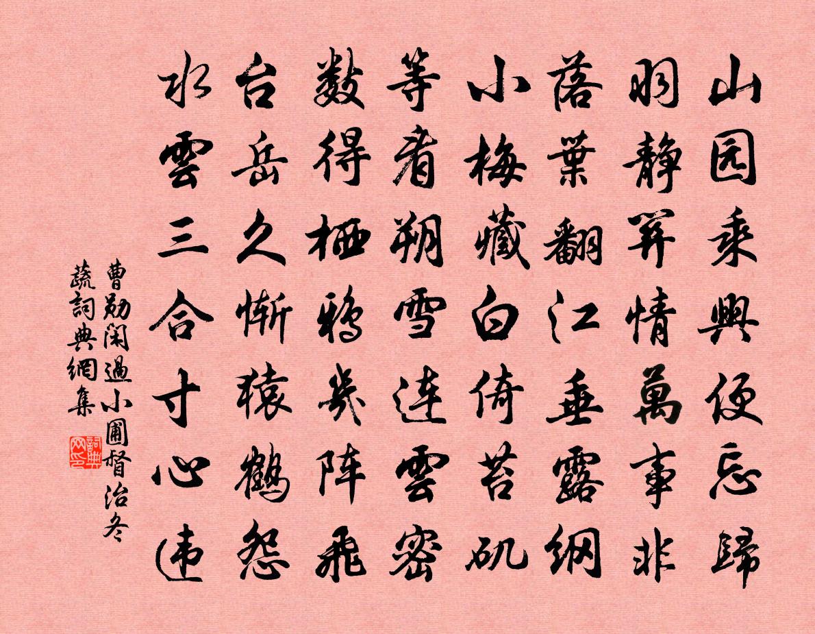 詩詞名句歷史字典書法欣賞書法字典國語詞典說文解字康熙字典古漢語字典標 題 作 者 詩 句 閒過小圃督治冬蔬作者:曹勛 朝代:宋代閒過小圃督治冬蔬原文山園乘興便忘歸,羽靜關情萬事非。落葉翻江垂露綱,小梅藏白倚苔磯。等看朔雪連雲密,數得棲鴉幾陣飛。台岳久慚猿鶴怨,水雲三合寸心違。詩詞問答問:閒過小圃督治冬蔬的作者是誰?答:曹勛問:閒過小圃督治冬蔬寫於哪個朝代?答:宋代曹勛閒過小圃督治冬蔬書法欣賞閒過小圃督治冬蔬書法作品詩詞推薦李深之西尉同年談吳興風物,再用古城韻范成大〔宋代〕李侯昔游吳,蓮舟鏡蒼茫。風鬟與霧鬢,共濯玻璃光。採花不盈舫,日暮雲水香。還登縹緲樓,羅襟酒淋浪。卷箔岩下放言五首之博山台黃庭堅〔宋代〕石蘊璵璠,山得其來之澤。木無犧象,天開不材之祥。屹金爐之突兀,其山海之來翔。然以明哲之火,熏以忠信之次韻劉閬州謝送菊岩春馮伯規〔宋代〕山中有佳菊,足以配古岩。飲酒對此菊,何用薦芳甘。不妨玉山頹,對臥千載楠。清賞不可共,妙句傳巴南。和劉後村梅花百詠方蒙仲〔宋代〕樂事賞心誰不有,可人勝士古來難。樽前莫怪同游少,恐被梅花白眼看。孟子王令〔宋代〕孟子不肯比伊尹,仲尼方可期文王。聖賢自得固厚重,庸俗始以己較量。微生喜以佞面詆,臧氏惡非禮所當。惜哉和岳文二公西湖韻何夢桂〔宋代〕昆明灰出海揚塵,老去英雄白髮新。宮闕崔嵬千里月,樓台牢落十年春。血流杜宇悲遊子,夢斷梅花憶故人。立盡家兄有和再用韻艾可翁〔宋代〕亂離生世晚,衰白在人前。雲水飛飢鶴,山林付亂蟬。日今行黑道,人有隔黃泉。晷漸秋來短,愁長亦敵年。偈頌二十二首釋妙倫〔宋代〕日暖噴庭花,風輕搖岸柳。雙林入滅老臊胡,至今猶露摩胸手。送韶化士乾靈雲古寺基釋法薰〔宋代〕劍客重尋眼翳生,至今孤露不堪聞。老韶直下能扶起,十□精神減八分。昭武舊同僚見過王洋〔宋代〕半生辛苦路漫漫,八月樵川類破酸。官事到時初覺易,人情雖後始知難。苦無私惠違情重,儉用官錢得謗寬。聞說送臧奎赴舉魏野〔宋代〕艱難天府解,去掇喜還悲。舊相和文薦,偏親帶病辭。劍如機不用,琴似影相隨。仆為初招戇,驢因賤買贏。窮途同兒曹步月寺門作趙蕃〔宋代〕溪風亂林影,林月漾溪光。宿鳥無安止,飛鳥為斂芒。兒曹從杖屨,老子廢杯觴。誰謂時方暑,端疑候已涼。和朱元晦九曲櫂歌歐陽光祖〔宋代〕日日金雞啁哳鳴,仙機岩前冬復春。繫舟四曲看題石,詩與人存今幾人。京城第二十文天祥〔宋代〕當寧陷玉座,兩宮棄紫微。北城悲笳發,失涕萬人揮。奉送杜中丞赴洪州暢當〔唐代〕詔出鳳凰宮,新恩連帥雄。江湖經戰陣,草木待仁風。豪右貪威愛,紆繁德簡通。多慚君子顧,攀餞路塵中。和蕭太山韻相士李月齋釋道璨〔宋代〕心明於月過於月,廣寒有殿無城闕。不須更服九轉丹,目光射人如月寒。凌煙閣上公侯像,未必肩如山字樣。玉川感興陳杰〔宋代〕滿目塵沙萬里還,客來相對舊儒酸。秋風慣識茅茨屋,朝日仍登苜蓿盤。雲鶴性情閒去好,山林面目本來看。今年自寬鄭剛中〔宋代〕瘴濃複嶺煙如墨,照以澄江一洗開。芳草望中春去遠,落花寒處鳥聲回。風飄空翠入修竹,潤滴幽蹊生綠苔。不是寄黃龍清老三首黃庭堅〔宋代〕萬山不隔中秋月,一雁能傳寄遠書。深密伽陀枯戰筆,真成相見問何如。辨奸論蘇洵〔宋代〕事有必至,理有固然。惟天下之靜者,乃能見微而知著。月暈而風,礎潤而雨,人人知之。人事之推移,理勢之相名句推薦兒不嫌母醜,狗不嫌家貧。佚名《增廣賢文·下集》 況故人新擁,漢壇旌節。辛棄疾《滿江紅·漢水東流》 怒不過奪,喜不過予。荀子《荀子·修身》 秋送新鴻哀破國,晝行飢虎齧空林。鄭思肖《二礪》 晚風收暑,小池塘荷淨。劉光祖《洞仙歌·荷花》 人有不及,可以情恕。房玄齡《晉書·列傳·第六章》 月兒彎彎照九州,幾家歡樂幾家愁。佚名《月兒彎彎照九州》 影孤憐夜永,永夜憐孤影蘇軾《菩薩蠻·回文秋閨怨》 車轔轔,馬蕭蕭,行人弓箭各在腰。杜甫《兵車行》 錢塘江上潮信來,今日方知我是我。施耐庵《水滸傳·第一百一十九回》
