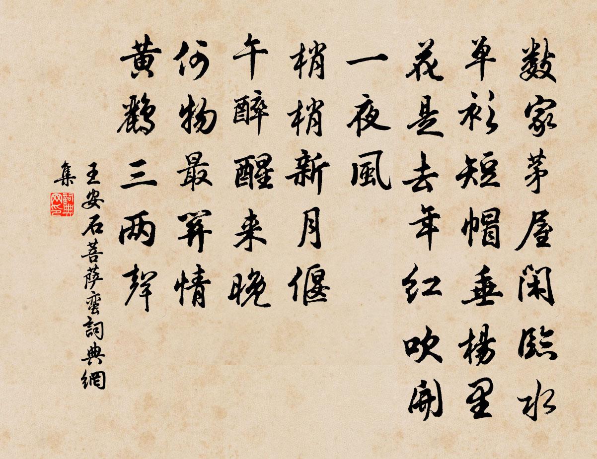 此詞為作者晚年隱居江寧半山之作 。《能改齋漫錄》云:“王荊公築草堂於半山,引入功德水作小港,其中疊石作橋,為集句填菩薩蠻 。”全篇用前人詩句雜綴成詞 ,使之如出己口 ,真正為自己表情達意服務,敘寫自己的閒適生活與故作放達的情懷。