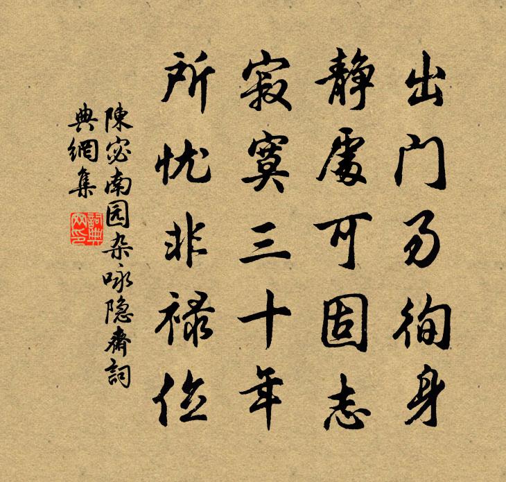 詩詞名句歷史字典書法欣賞書法字典國語詞典說文解字康熙字典古漢語字典標 題 作 者 詩 句 南園雜詠隱齋作者:陳宓 朝代:宋代南園雜詠隱齋原文出門易徇身,靜處可固志。寂寞三十年,所憂非祿位。詩詞問答問:南園雜詠隱齋的作者是誰?答:陳宓問:南園雜詠隱齋寫於哪個朝代?答:宋代陳宓南園雜詠隱齋書法欣賞南園雜詠隱齋書法作品詩詞推薦九日贈僧唐介〔宋代〕今日是重陽,勞師訪野堂。相逢又無語,籬下菊花黃。頌古四十五首釋慧遠〔宋代〕兩陣交鋒笑似瞋,雙眉倒卓眼生筋。溪山雲月誰為侶,南北東西絕近鄰。寄陽岐西峰僧齊己〔唐代〕西峰殘照東,瀑布灑冥鴻。閒憶高窗外,秋晴萬里空。藤陰藏石磴,衣毳落杉風。日有誰來覓,層層鳥道中。示程介夫馬廷鸞〔宋代〕流年何必共君參,九瑣青山老一庵。試檢樂天詩集看,明年半百又加三。答樂坡居士釋法泉〔宋代〕指出明明是甚麽,舉頭鷂子穿雲過。從來這碗最希奇,解問燈人能幾個。法駕導引虞集〔元代〕千歲事,何許覓松喬。急雨輕雷開道路,星河北斗轉**。相對話漁題忠愍公送婿邢得照歸婺女詩後曹穭孫〔宋代〕路八千來媚亦艱,相看冰玉問平安。剪燈夜話思全蜀,五十四州天上寬。成都羅城北門石記佚名〔唐代〕五五復五五,五五逾重數。浮世若浮雲,金石一如故。與君相見時,杳杳非今土。令狐相公見示新栽蕙蘭二草之什,兼命同作劉禹錫〔唐代〕上國庭前草,移來漢水潯。朱門雖易地,玉樹有餘陰。艷彩凝還泛,清香絕復尋。光華童子佩,柔軟美人心。惜晚光祿坂行杜甫〔唐代〕山行落日下絕壁,西望千山萬山赤。樹枝有鳥亂鳴時,暝色無人獨歸客。馬驚不憂深谷墜,草動只怕長弓射。安得春日汎舟南湖因遍游近港坐間書客所攜四扇張鎡〔宋代〕先須放櫂繞湖游,倒看行雲水底浮。客去莫歸朝市說,引渠無意作公侯。郭明甫作西齋於潁尾請予賦詩二首黃庭堅〔宋代〕食貧自以官為業,聞說西齋意凜然。萬卷藏書宜子弟,十年種木長風煙。未嘗終日不思潁,想見先生多好賢。安得怨郎詩卓文君〔兩漢〕一朝別後,二地相懸。只說是三四月,又誰知五六年?七弦琴無心彈,八行書無可傳。九連環從中折斷,十里長亭雨中贈仙人山賈山人(即賈鵬也)柳宗元〔唐代〕寒江夜雨聲潺潺,曉雲遮盡仙人山。遙知玄豹在深處,下笑羈絆泥塗間。峽水袁燮〔宋代〕峽石險而怪,峽水清且湍。伊誰剪蒙密,發此奇偉觀。兩龍會為一,激烈不可士。蜿蜒潄鳴玉,千古甘以寒。誰雲句吳沆〔宋代〕君少作奇字,瘦硬得柳骨。墨淨剪水勻,勢健拗鐵屈。……新詩更鐫磨,勁絕與字匹。老蛟寒臥波,壯士努抉石。和秉彝李君五偈釋智愚〔宋代〕曉聽君臣慶賀時,六街如書不曾迷。普賢境界應垂問,手詔來時見紫泥。入硤行晁公溯〔宋代〕吾家文物如崔公,向來世學工雕龍。側理固嘗收會稽,陶泓不獨稱洪農。徂徠取煤如點漆,宣城束潁能藏鋒。焉知感懷呈所知譚用之〔唐代〕十年流落賦歸鴻,誰傍昏衢駕燭龍。竹屋亂煙思梓澤,酒家疏雨夢臨邛。千年別恨調琴懶,一片年光覽鏡慵。早晚縣中迎石金山甘靈大士就放生池祈雨早上偕簿虞儔〔宋代〕夜起占星畢,朝趨禮佛龕。擁橋蓮墜粉,縈沼水揉藍。屏翳何須靳,登伽不受參。懸知天欲雨,蟻戰已酣酣。名句推薦青天蜀道難,紅葉吳江冷。張可久《普天樂·秋懷》 生而富者驕,生而貴者傲。范曄《後漢書·列傳·崔駰列傳》 質勝文則野,文勝質則史。文質彬彬,然後君子。孔子弟子《論語·雍也篇》 學者不患才之不贍,而患志之不立。徐幹《中論·上卷·治學》 寵柳嬌花寒食近,種種惱人天氣。李清照《念奴嬌·春情》 事莫明於有效,論莫定於有證王充《論衡·卷二十三·薄葬篇》 遺廟丹青落,空山草木長。杜甫《武侯廟》 明日復明日,明日何其多。錢福《明日歌》 不種閒花,池亭畔、幾竿修竹。陸容《滿江紅·詠竹》 天山雪雲常不開,千峰萬嶺雪崔嵬。岑參《天山雪歌送蕭治歸京》