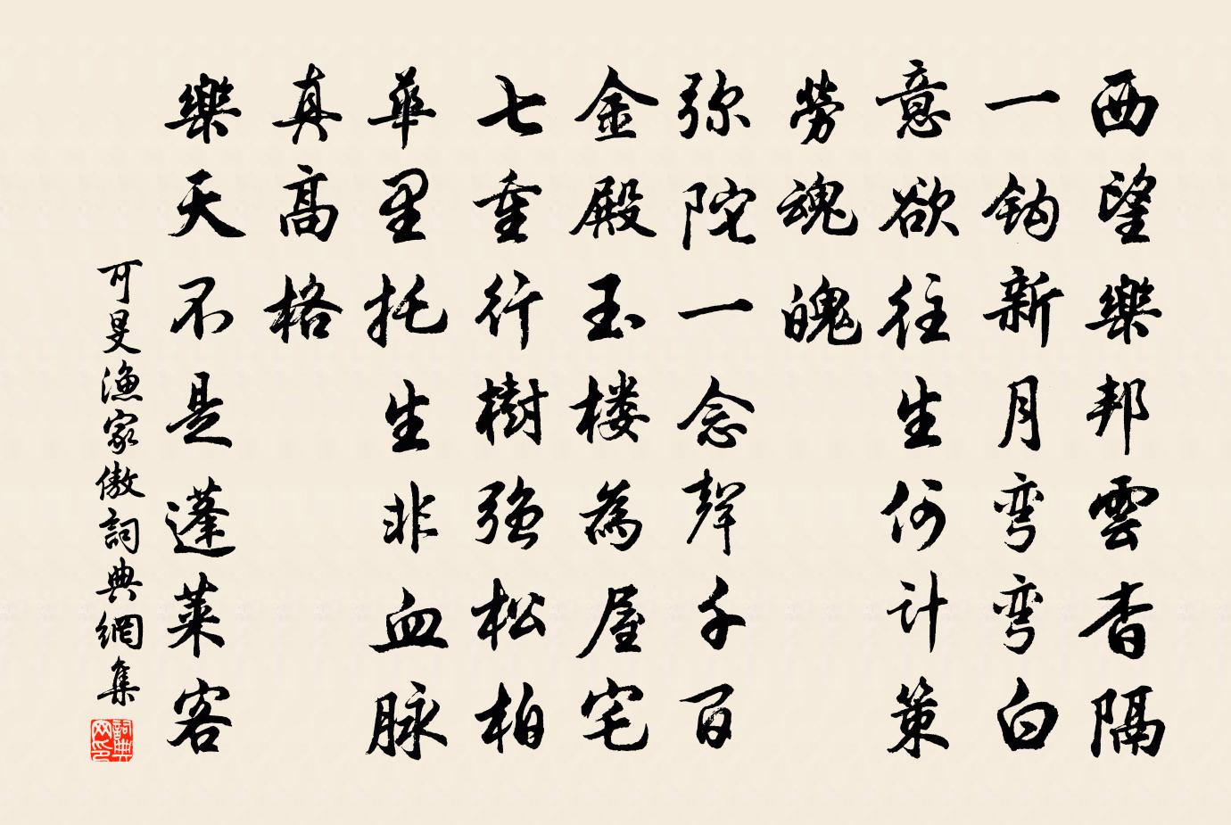 詩詞名句歷史字典書法欣賞書法字典國語詞典說文解字康熙字典古漢語字典標 題 作 者 詩 句 漁家傲作者:可旻 朝代:宋代漁家傲原文西望樂邦雲杳隔。一鉤新月彎彎白。意欲往生何計策。勞魂魄。彌陀一念聲千百。金殿玉樓為屋宅。七重行樹強松柏。華里托生非血脈。真高格。樂天不是蓬萊客。詩詞問答問:漁家傲的作者是誰?答:可旻問:漁家傲寫於哪個朝代?答:宋代問:漁家傲是什麼體裁?答:詞可旻漁家傲書法欣賞漁家傲書法作品詩詞推薦和樂天燒藥不成命酒獨醉劉禹錫〔唐代〕九轉欲成就,百神應主持。嬰啼鼎上去,老貌鏡前悲。卻顧空丹灶,回心向酒卮。醺然耳熱後,暫似少年時。簡張中白方回〔宋代〕疇昔兵興豈料今,朱幡猶憶對青衿。棠郊自愧無遺愛,芹泮遙知有好音。練水招予歸舊隱,錦峰輸子擅清吟。豈無秀蔓張耒〔宋代〕秀蔓依檐老,寒枝映屋疏。寒暄候蟲報,昏旦老雞呼。已飯新收稻,仍烹自種蔬。鄰邦有佳釀,沖雨隔江沽。女幾山女仙廟李復〔宋代〕絳節高翔不可攀,尚留遺幾在空山。月明曾有芳簫過,松老時看舊鶴不。岩下春歸花寂寂,壁間雲暗蘚斑斑。開元寄西弟六首劉黻〔宋代〕寂寂書堂秋夜涼,一編心畫一爐香。弟兄動是經年別,羞見天邊有雁行。禪人並化主寫真求贊釋正覺〔宋代〕廓然而瑩,了無餘影。卓爾而存,豈有他痕。靜非像也,徹見其源。動順緣也,萌發其根。用綿綿兮攪不渾。輒吟七言四韻攀寄翁文堯拾遺黃滔〔唐代〕唐設高科表用文,吾曹誰作諫垣臣。甄山秀氣曠千古,鳳闕華恩鍾二人。起草便論天上事,如君不是世間身。龍頭賦山 / 一七令·山令狐楚〔唐代〕山,聳峻,迴環。滄海上,白雲間。商老深尋,謝公遠攀。古岩泉滴滴,幽谷鳥關關。樹島西連隴塞,猿聲南徹荊觀舞妓溫庭筠〔唐代〕朔音悲嘒管,瑤踏動芳塵。總袖時增怨,聽破復含嚬。凝腰倚風軟,花題照錦春。朱弦固淒緊,瓊樹亦迷人。奉酬劉侍郎顧況〔唐代〕幾回新秋影,璧滿蟾又缺。鏡破似傾台,輪斜同覆轍。雖分上林桂,還照滄洲雪。暫伴憔悴人,歸華耿不滅。漁家傲可旻〔宋代〕淨土故鄉嗟乍別。天涯流浪經時節。老去染沾眉鬢雪。思歸切。聞聲願寄遼天月。念念時時修淨業。臨終佛定來迎七用喜雨韻三首吳潛〔宋代〕闌乾小倚望遙岑,晚霽朝朝換午陰。越鶩已收天外影,吳鳩尚帶雨中音。海瀕客子秋銜袖,塞上征人夜拊砧。都是夜興黃溍〔元代〕秋氣入病骨,殘夢倏然驚。芭蕉葉間露,風過皆成聲。攬衣泬寥內,搔首天河橫。飢蟲語不休,中宵誰汝令?孤鴻張明遠自持其所居萃勝亭記來求詩為賦三篇馮時行〔宋代〕靜躁固異秉,出處良一途。岩前東來人,翻然應時須。赫赫帝者師,去與赤松俱。鐘鼎與林泉,天以私吾儒。窮達題水月寺寒秀軒楊萬里〔宋代〕小寺深門一逕斜,繞身縈面總煙霞。低低檐入低低樹,小小盆盛小小花。經藏中間看佛盡,竹林外面是人家。山僧賀蕭蔘政張鎡〔宋代〕向來投謁未嘗頻,今日尤宜後眾賓。先世年家登政府,時情禮數到閒人。只將忠實酬明方,果見推遷作大臣。何用喜遷鶯(端午泛湖)黃裳〔宋代〕梅霖初歇。乍絳蕊海榴,爭開時節。角黍包金,香蒲切玉,是處玳筵羅列。鬥巧盡輸少年,玉腕彩絲雙結。艤彩舫送虞城劉明府謁魏郡苗太守高適〔唐代〕天官蒼生望,出入承明廬。肅肅領舊藩,皇皇降璽書。茂宰多感激,良將復吹噓。永懷一言合,誰謂千里疏。對酒二月二十一日東園桃李未開有感二首張耒〔宋代〕寄語玄都觀里花,饒君繁麗奪朝霞。劉郎想到長安日,葵麥風前一嘆嗟。贈陳養廉居士曾豐〔宋代〕身後相多清議同,大歸何者是家風。輕財笑饋三千客,重道爭祠六一公。門未生苔車跡滿,館無廢帚榻塵空。有人名句推薦無人解,樹轉午陰涼舒頔《小重山·端午》 庭中有奇樹,綠葉發華滋。佚名《庭中有奇樹》 關山正飛雪,烽火斷無煙。王維《隴西行》 聽其言,跡其行,察其所能而慎予官。墨子《墨子·09章 尚賢(中)》 日夕涼風至,聞蟬但益悲。孟浩然《秦中感秋寄遠上人 / 秦中寄遠上人》 紅橋路,正一派、畫船蕭鼓中流住。納蘭性德《摸魚兒·午日雨眺》 母欺子,子而不信其母,非以成教也。韓非及後人《韓非子·外儲說左上》 風回小院庭蕪綠,柳眼春相續。李煜《虞美人·風回小院庭蕪綠》 攜來百侶曾游,憶往昔崢嶸歲月稠。 * 《沁園春·長沙》 覆巢之下,復有完卵劉義慶《世說新語·言語》