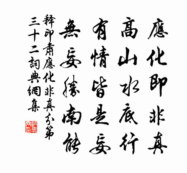 詩詞名句歷史字典書法欣賞書法字典國語詞典說文解字康熙字典古漢語字典標 題 作 者 詩 句 應化非真分第三十二作者:釋印肅 朝代:宋代應化非真分第三十二原文應化即非真,高山水底行。有情皆是妄,無妄勝南能。詩詞問答問:應化非真分第三十二的作者是誰?答:釋印肅問:應化非真分第三十二寫於哪個朝代?答:宋代釋印肅應化非真分第三十二書法欣賞應化非真分第三十二書法作品詩詞推薦句釋曉瑩〔宋代〕顧我於茲詩有興。奉和滁州九詠九首石屏路曾鞏〔宋代〕石屏不見刀斧痕,石下初誰得行徑。千騎來時停管弦,月明更覺山中靜。二月十五日遊興教寺劉黻〔宋代〕一僧癯似竹,結坐對觀音。但見夕陽過,不知春事深。茗芳留野客,樹老集巢禽。卓錫泉千古,冷然照此心。贈陸伯微三首袁燮〔宋代〕斗大書齋以潔名,冰壺表里要清明。如今塵土填胸臆,幸挽滄浪為濯纓。碧城三首李商隱〔唐代〕碧城十二曲闌乾,犀辟塵埃玉辟寒。閬苑有書多附鶴,女床無樹不棲鸞。星沈海底當窗見,雨過河源隔座看。若是蘇學十題玲瓏石朱長文〔唐代〕巨浪洗蒼玉,一峰飛我前。鑿開混沌竅,窺見滄浪天。洞敞延華月,岩虛生翠煙。幽軒相對久,古意日倏然。漁父吟宋伯仁〔宋代〕小舟如雁許,穩穩下波心。蓑笠幾風雨,江山無古今。清歌鳴短棹,紅葉滿疏林。一醉不知世,前村月未沈。冬暮送人尚顏〔唐代〕長安冬欲盡,又送一遺賢。醉後情渾可,言休理不然。射衣秦嶺雪,搖月漢江船。亦過春兼夏,回期信有蟬。玩丹砂 退道丘處機〔元代〕劍樹刀山雪刃橫。千磨百拷死還生。哀聲流血苦難登。針刺著身猶害痛,鋼*夸性莫非疼。如何淫放不修行。偶作五絕句袁枚〔清代〕偶尋半開梅,閒倚一竿竹。兒童不知春,問草何故綠。贈劉成文王令〔宋代〕予生日文謝早先,日文晚世相逅日文邂。禮俗不可徵,百孔千瘡壞。平時以是念,食美不知囋。誰為醫國者,已亟美人圖唐寅〔明代〕鸞釵壓鬢髻偏新,霧濕雲低別種情。最是含羞無那意,故將結髮試穿針。芹齋詩林光宗〔宋代〕春風芹下足遲留,白鳥平田憶舊遊。閱盡軒裳還過眼,讀殘書卷復於頭。偶逢隱几何須問,不到投簪便擬休。平世題秀野堂喻良能〔宋代〕秀野臨空闊,三堂若是班。荷香平入座,湖影倒涵山。魚鳥丹青里,雲煙水墨間。他年儻同社,應共狎鷗閒。巫山一段雲尹志平〔元代〕塞北三年轉,天西萬里回。飄飄雲駕漸東來。無不笑顏開。道德崢嶸功大。行滿決超三界。十方仙子行功圓。得見別夜羅鄴〔唐代〕秋入江天河漢清,迢迢鐘漏出孤城。金波千里別來夜,玉箸兩行流到明。若在人間須有恨,除非禪伴始無情。人間秋懷五首李謙〔宋代〕敗壁鳴莎雞,涼月照虛堂。南鄰機杼聲,燁燁燈火光。遙聞誰家砧,已趣公子裳。佳人在何許,葉落山中霜。開歲頗思江湖游適陸游〔宋代〕健筆當年賦遠遊,即今侷促但堪羞。雖為月下孤舟客,未醉天涯七澤秋。丹熟竟當金換骨,客來從笑雪蒙頭。龍泉袁州慶豐堂十閒詠祖無擇〔宋代〕雨霽輕埃息,閒吟面曲池。游鱗時對擲,雙破碧漣漪。挽蔡西山先生翁升〔宋代〕傷哉道學不容時,力抵先生蹈至危。槐棘僉謀雖日偽,草茅公論實難欺。蒼梧千里地雖遠,白首一心天自知。借問名句推薦有力者疾以助人,有財者勉以分人,有道者勸以教人。墨子《墨子·10章 尚賢(下)》 日出扶桑一丈高,人間萬事細如毛。劉叉《偶書》 行人夜宿金陵渚,試聽沙邊有雁聲。李頎《送劉昱》 人依遠戍須看火,馬踏深山不見蹤。王昌齡《從軍行七首》 其旨遠,其辭文,其言曲而中,其事肆而隱。佚名《易傳·繫辭傳下·第六章》 馬色雖不同,人心本無隔。李白《君馬黃》 不親仁,無限害,小人進,百事壞。李毓秀《弟子規·親仁》 軍氣橫大荒,戰酣日將入。王昌齡《從軍行二首》 不管三七二十一馮夢龍《醒世恆言·卷一》 更把玉鞭雲外指,斷腸春色在江南。韋莊《古離別》