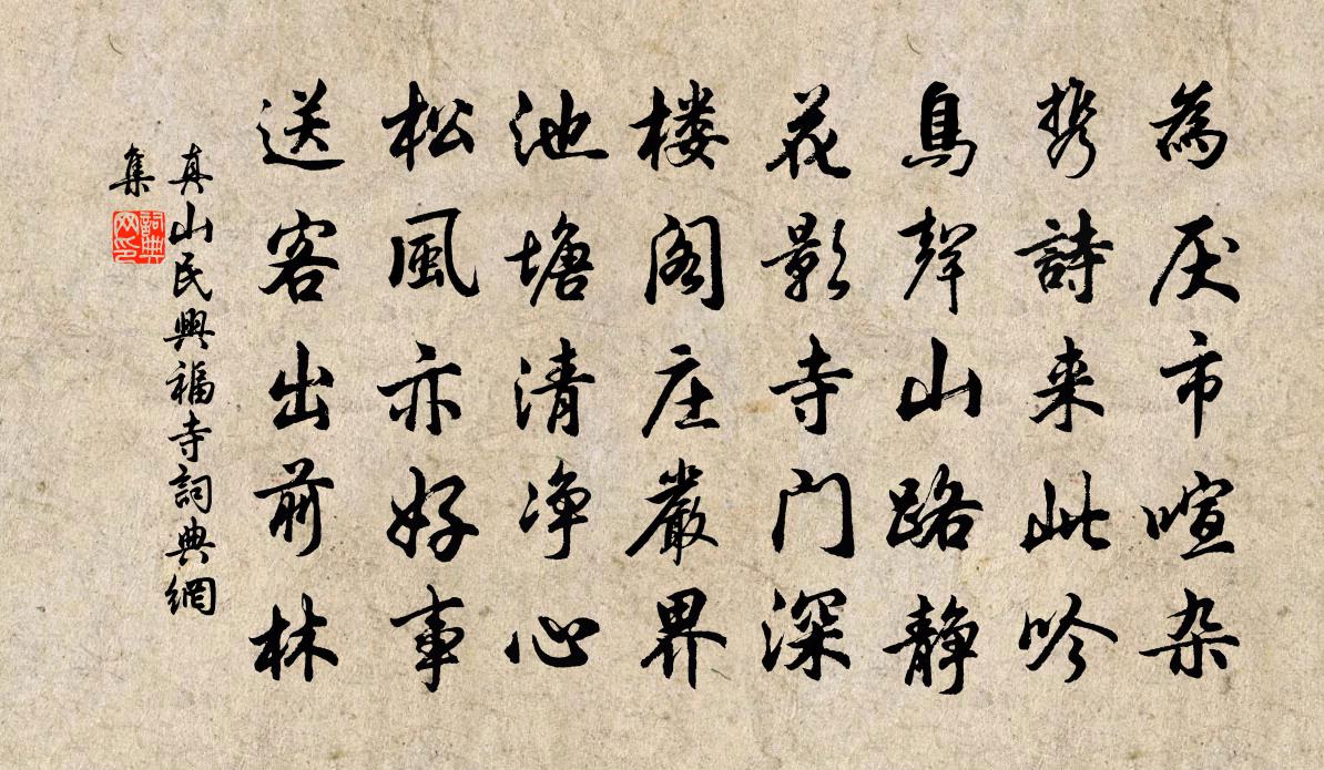 詩詞名句歷史字典書法欣賞書法字典國語詞典說文解字康熙字典古漢語字典標 題 作 者 詩 句 興福寺作者:真山民 朝代:宋代興福寺原文為厭市喧雜,攜詩來此吟。鳥聲山路靜,花影寺門深。樓閣莊嚴界,池塘清淨心。松風亦好事,送客出前林。詩詞問答問:興福寺的作者是誰?答:真山民問:興福寺寫於哪個朝代?答:宋代真山民興福寺書法欣賞興福寺書法作品詩詞推薦和原甫盆池種蒲蓮畜小魚韓維〔宋代〕江湖豈非壯,浩蕩不可尋。安知一斛水,坐得萬里心。植蒲翠節聳,種蓮柴實沉。群魚不盈寸,泳淺安其深。主人南州行徐延壽〔唐代〕搖艇至南國,國門連大江。中洲西邊岸,數步一垂楊。金釧越溪女,羅衣胡粉香。織縑春卷幔,采蕨暝提筐。弄瑟天地篇曹植〔魏晉〕復為時所拘。覊紲作微臣。齋居雜興王義山〔宋代〕山水之中足可娛,田園數畝任荒蕪。論交惟有詩知己,把酒相忘月與吾。秀石漱泉清可硯,孤峰掛日影堪圖。可憐郡圃宋祁〔宋代〕側曲艷歌閒送日,晚花初葉暗留春。舞狂風蝶時過樹,啼熟林鶯不避人。憶仙姿(九之四)賀鑄〔宋代〕羅綺叢中初見。理鬢橫波流轉,半醉不勝情,簾影猶招歌扇。留戀。留戀。秋夜辭巢雙燕。失調名佚名〔宋代〕春來長是病厭厭。石州慢(書所見寄子野、公明)張炎〔宋代〕野色驚秋,隨意散愁,踏碎黃葉。誰家籬院閒花,似語試妝嬌怯。行行步影,未教背寫腰肢,一搦猶立門前雪。依丙辰元夜釋斯植〔宋代〕淡河斜浸月光浮,看盡青山更倚樓。殘燭怕寒元夕夜,小欄花影伴人愁。哭同年羅著作王禹偁〔宋代〕荒涼故宅何人住,寂寞孀妻即日還。一歲嬰兒安健否,巨源雖在謫深山。上中書陳舍人三首袁燮〔宋代〕士方負材業,高價敵璠璵。一朝聲稱減,碌碌盆盎如。貴名豈不欲,名盛復難居。所以古君子,謹終如厥初。自公尤溪補陀岩釋慧空〔宋代〕岩下溪聲傾法雨,岩頭雲根聳華冠。遊人不入普門境,只作青山綠水看。送張坦公方伯出塞丁澎〔清代〕老去悲長劍,胡為獨遠征?半生戎馬換,片語玉關行。亂石沖雲走,飛沙撼磧鳴。萬方新雨露,吹不到邊城。贈琴妓二首陳造〔宋代〕夢中曾揖蔡文姬,焦尾親傳半夜衣。莫向詩 * 別鵠,免煩衰淚對君揮。柳絮張夫人〔唐代〕靄靄芳春朝,雪絮起青條。或值花同舞,不因風自飄。過尊浮綠醑,拂幌綴紅綃。那用持愁玩,春懷不自聊。和沖卿晚秋過金明池韓維〔宋代〕聞群西郊行,正值秋風晚。清霜卷枯荷,碧玉瑩池面。浮空結脩梁,涌波抗華殿。雲煙渺淨色,覽望一蕭散。頃思還圓益上人詩卷邵雍〔宋代〕瓶錫相從更一巾,一巾曾拂十州塵。心通佛性久無礙,口道儒言殊不陳。吳越江山前日事,伊嵩風月此時身。閒行秋夜吟長安中鬼〔唐代〕六街鼓歇行人絕,九衢茫茫室有月(吟)。九衢生人何勞勞,長安土盡槐根高(和)。送王詩客莊依湖外使者吳則禮〔宋代〕問舍求田話昔時,共憂南北未安枝。青山笑吾空成夢,白髮憐君苦作詩。風月誰教太瀟灑,功名自是小差池。要須畫眉鳥歐陽修〔宋代〕百囀千聲隨意移,山花紅紫樹高低。始知鎖向金籠聽,不及林間自在啼。名句推薦戀樹濕花飛不起,愁無比,和春付與東流水。朱服《漁家傲·小雨纖纖風細細》 柴門聞犬吠,風雪夜歸人。劉長卿《逢雪宿芙蓉山主人》 既生瑜,何生亮!羅貫中《三國演義·第五十七回》 風鳴兩岸葉,月照一孤舟。孟浩然《宿桐廬江寄廣陵舊遊》 似此星辰非昨夜,為誰風露立中宵。黃景仁《綺懷》 羌笛何須怨楊柳,春風不度玉門關。王之渙《涼州詞二首·其一》 闌乾風冷雪漫漫,惆悵無人把釣竿。姜夔《釣雪亭》 今朝有酒今朝醉,明日愁來明日憂。佚名《增廣賢文·上集》 舉杯邀明月,對影成三人。李白《月下獨酌四首·其一》 成人不自在,自在不成人。曹雪芹《紅樓夢·第八十二回》