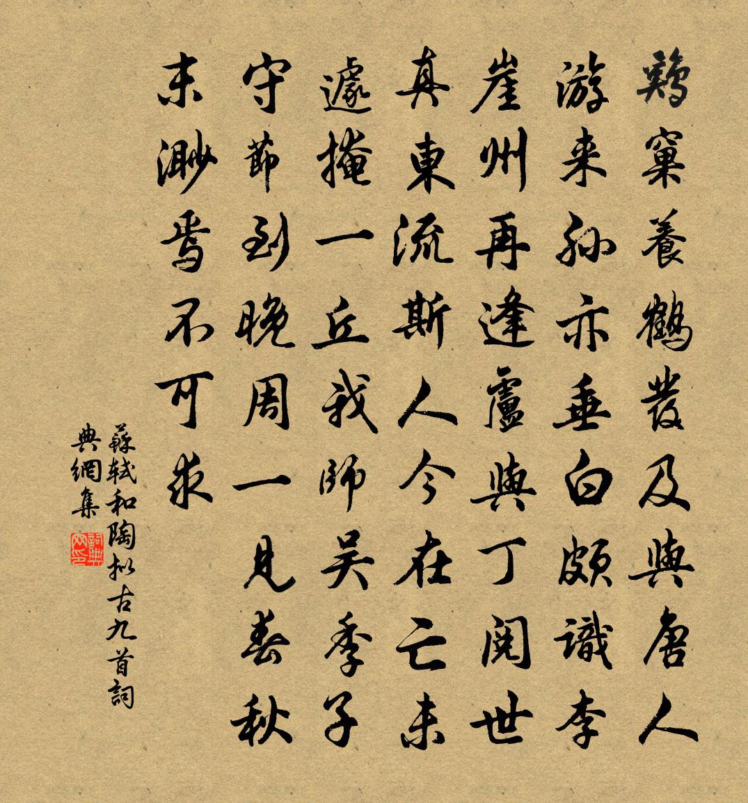 詩詞名句歷史字典書法欣賞書法字典國語詞典說文解字康熙字典古漢語字典標 題 作 者 詩 句 和陶擬古九首作者:蘇軾 朝代:宋代和陶擬古九首原文雞窠養鶴髮,及與唐人游。來孫亦垂白,頗識李崖州。再逢盧與丁,閱世真東流。斯人今在亡,未遽掩一丘。我師吳季子,守節到晚周。一見春秋末,渺焉不可求。詩詞問答問:和陶擬古九首的作者是誰?答:蘇軾問:和陶擬古九首寫於哪個朝代?答:宋代問:蘇軾的名句有哪些?答:蘇軾名句大全蘇軾和陶擬古九首書法欣賞和陶擬古九首書法作品詩詞推薦和原甫立春日拜賜歸不赴鄰幾會韓維〔宋代〕上閣群公拜賜歸,九衢春色遍熙熙。後房絲竹爭相命,窮巷簞瓢亦我期。濁酒滿樽聊混俗,嘉蔬登俎在隨時。劉郎宿蘇坊曹彥約〔宋代〕客久囂塵外,冬深驛舍前。亂山寬處日,野水暮時煙。契分新篘酒,生涯舊物氈。悠然歸興動,依約探梅天。折花聯句何遜〔南北朝〕笑出春園裡。望花聯褰纈。欲以間珠鈿。非為相思折。日照爛成綺。風來聚疑雪。試采一枝歸。願持因遠別。江南春·波渺渺寇準〔宋代〕波渺渺,柳依依,孤村芳草遠,斜日杏花飛。江南春盡離腸斷,苹滿汀洲人未歸。賈佩蘭歌文同〔宋代〕綠髮憶新梳,君前侍玉壺。相隨五色鳳,飛止帝宮梧。鳳時入紫煙,一舉萬羽趨。乘風恣敖盪,眾首傾雲衢。帝既湖上許渾〔唐代〕仿佛欲當三五夕,萬蟬清雜亂泉紋。釣魚船上一尊酒,月出渡頭零落雲。紹興以後蜡祭四十二首佚名〔宋代〕筆社備祀,教民美報。時和峁豈,奉本以告。惟照臨功,等於載燾。酌獻雲初,明神所勞。酬李廓精舍南台望月見寄姚合〔唐代〕看月空門裡,詩家境有餘。露寒僧梵出,林靜鳥巢疏。遠色當秋半,清光勝夜初。獨無台上思,寂寞守吾廬。送張無夢歸天台王得益〔宋代〕獨上仙槎汴水湄,吟歸舊隱赤城西。少微昨夜離丹闕,雙鳥何時到會稽。策杖再尋麋鹿逕,采芝重躡薜蘿梯。雲橫寄題徐仲晦須友堂二首劉克莊〔宋代〕病翁歲晚朋從絕,細讀高文面發慚。士貴切磋寧獨學,僧雖苦硬有同參。名堂蓋取倫之五,開徑那無益者三。見說頌古四十八首釋慧開〔宋代〕學道之人不識真,只為從前認識神。無量劫來生死本,痴人喚作本來人。佛舍利塔戴栩〔宋代〕海天五月氣陰清,單綌無功絮有情。踏半浮屠見滄海,風搖鈴鐸是商聲。神宗皇帝輓詞三首蘇轍〔宋代〕稽古堯無作,勤邦禹有功。政新天地力,事改漢唐風。禮樂寰中盛,梯航海外通。華封徒有誦,龍御忽乘空。承平贈別河南李功曹(宏辭登科拜官)韋應物〔唐代〕耿耿抱私戚,寥寥獨掩扉。臨觴自不飲,況與故人違。故人方琢磨,瑰朗代所稀。憲禮更右職,文翰灑天機。聿來從軍後寄山中友人王建〔唐代〕愛仙無藥住溪貧,脫卻山衣事漢臣。夜半聽雞梳白髮,天明走馬入紅塵。村童近去嫌腥食,野鶴高飛避俗人。勞動禪人並化主寫真求贊釋正覺〔宋代〕雲水之身,山林之氣。不專乎學,不游乎藝。默坐而心空,妙傳而道貴。西風淒清秋有痕,長天碧淨雲無蒂。從來題東林一首王阮〔宋代〕屏跡敷淺原,注目香爐峰。飽閏送客溪,鼎新古梵宮。緬懷結社人。豈止避俗翁。一念薰戒香,千年仰玄蹤。蜂房戲徐觀空張汝勤〔宋代〕學詩如學禪,所貴在觀妙。肺肝劇雕鏤,乃自鑿其竅。冥心游象外,何物可供眺。空山散雲霧,仰避日初照。曠觀扇子詩李石〔宋代〕冷著松聲似雨,凍教井水成冰。猛火燒天燒地,清涼谷里閒僧。寄仲子王淹〔宋代〕汝生席十七年,席不離父母席膝。抗言求自試,立意堅且必。父母不汝拒,汝志誠少匹。束席下扁舟,掛席飛鳥疾名句推薦同為懶慢園林客,共對蕭條雨雪天。白居易《雪夜小飲贈夢得》 爾曹身與名俱滅,不廢江河萬古流。杜甫《戲為六絕句·其二》 別日南鴻才北去,今朝北雁又南飛。魚玄機《閨怨》 三年羈旅客,今日又南冠。夏完淳《別雲間》 小樓昨夜又東風,故國不堪回首月明中。李煜《虞美人·春花秋月何時了》 軍聽了軍愁,民聽了民怕。王磐《朝天子·詠喇叭》 舞低楊柳樓心月,歌盡桃花扇底風。晏幾道《鷓鴣天·彩袖殷勤捧玉鍾》 一寸柔腸情幾許?薄衾孤枕,夢回人靜,徹曉瀟瀟雨。惠洪《青玉案·絲槐煙柳長亭路》 機在於應事;戰在於治氣尉繚《尉繚子·十二陵》 我欲乘槎,直窮銀漢,問津深入。許有壬《水龍吟·過黃河》