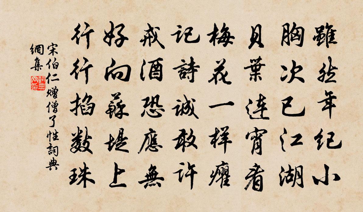 詩詞名句歷史字典書法欣賞書法字典國語詞典說文解字康熙字典古漢語字典標 題 作 者 詩 句 贈僧了性作者:宋伯仁 朝代:宋代贈僧了性原文雖然年紀小,胸次已江湖。貝葉連宵看,梅花一樣癯。記詩誠敢許,戒酒恐應無。好向蘇堤上,行行掐數珠。詩詞問答問:贈僧了性的作者是誰?答:宋伯仁問:贈僧了性寫於哪個朝代?答:宋代宋伯仁贈僧了性書法欣賞贈僧了性書法作品詩詞推薦唐多令·惜別吳文英〔宋代〕何處合成愁。離人心上秋。縱芭蕉、不雨也颼颼。都道晚涼天氣好,有明月、怕登樓。 年事夢中休。花空煙水流東宮作詩陸機〔魏晉〕羈旅遠遊宦。託身承華側。撫劍遵銅輦。振纓盡祗肅。歲月一何易。寒暑忽已革。載離多悲心。感物情悽惻。慷慨過新館罕見居人蘇頌〔宋代〕引弓風俗可傷嗟,滿目清溪與白沙。封域雖長編戶少,隔山才見兩三家。屈原宋庠〔宋代〕蜜勺瓊漿薦羽卮,脩門工祝儼相依。蛾眉雜遝無窮樂,澤上 * 底不歸。遣朝華秦觀〔宋代〕夜霧茫茫曉柝悲,玉人揮手斷腸時。不須重向燈前泣,百歲終當一別離。秦刷子陳東〔宋代〕誰斫碧琅玕,影撼半庭風月。尚有歲寒心在,留得數根華發。龍孫受戲碧波濤,喜動清風發。到得浪花深處,起一張司法寓齋唐士恥〔宋代〕玄錄五千言,妙在不敢先。留侯獨得之,帝師赤松仙。孰知百世下,乃有雲孫焉。扁齋以為寓,客谷音跫然。初除官蒙裴常侍贈鶻銜瑞草緋袍魚袋因謝惠貺兼抒離情白居易〔唐代〕新授銅符未著緋,因君裝束始光輝。惠深范叔綈袍贈,榮過蘇秦佩印歸。魚綴白金隨步躍,鶻銜紅綬繞身飛。明朝老病六言十首呈竹溪劉克莊〔宋代〕假合幻軀難靠,夭壽定數孰逃。屈子大招奚益,淵明自挽最高。玉津園餞魏王胡銓〔宋代〕餞行朱邸帝城春,隨例顛忙宴玉津。報國獨勞千一慮,鈞天同聽十三人。金卮宣勸君恩重,花露湔愁醉夢真。卻憶蓮任希夷〔宋代〕五月荷池未見花,但擎餘蓋碧參差。何人喚起凌波步,要見晨妝出曉霞。王子才軍中有道鬻筆既售而去日吾姓管中破視黃彥平〔宋代〕車馬相逢地,龍蛇雜處中。從容李洞長,遊戲管城公。墮履方圯下,跳壺已閬風。還同賀水部,乘興看行宮。鷓鴣天朱淑真〔宋代〕獨倚闌乾晝日長,紛紛蜂蝶斗輕狂。一天飛絮東風惡,滿路桃花春水香。當此際,意偏長,萋萋芳草傍池塘。千鍾中隱堂詩蘇軾〔宋代〕翠石如鸚鵡,何年別海堧。貢隨南使遠,載壓渭舟偏。已伴喬松老,那知故國遷。金人解辭漢,汝獨不潸然?感秋六首鄭獬〔宋代〕短松青鐵乾,童童三尺餘。花實少姿媚,獨與寒心俱。暴霜時侵凌,奮怒張雄須。長楸擁腫材,旁蔭可容車。秋風葉夢錫丞相輓詞二首韓元吉〔宋代〕制邑騰嘉譽,昇平遂一州。雍容持從橐,慷慨動宸旒。相業看調鼎,兵機久運籌。勛庸元未究,湖海淚空流。題章伯深臞怪圖仲並〔宋代〕竹戶茅檐一逕斜,清樽黃卷定生涯。溪山勝處春長在,卻放朱藤一半花。碧蟬兒花楊巽齋〔宋代〕揚葩簌簌傍疏籬,薄翅舒青勢欲飛。幾誤佳人將扇撲,始知錯認枉心機。詩三首孫何〔宋代〕黃帝升天去不還,空留片石在人間。千尋杳杳撐紅日,倚雲喬木羽林閒。時人不信飛升路,轍跡龍髯竟可攀。游禪林寺張弋〔宋代〕寺置蕭梁曾識少,今朝蘚磴始經過。天低落日江湖遠,煙冷風清竹樹多。蟲引翠禽行壞屋,馬驚白犬吠懸蘿。一僧名句推薦誠者,非自成己而已也。所以成物也。成己仁也。成物知也。性之德也,合外內之道也。故時措之宜也。子思《中庸·第二十五章》 自春來、慘綠愁紅,芳心是事可可。柳永《定風波·自春來》 誰念遷客歸來,老大傷名節。李綱《六么令·次韻和賀方回金陵懷古鄱陽席上作》 天有其時,地有其財,人有其治,夫是之謂能參。荀子《荀子·天論》 三千丈清愁鬢髮,五十年春夢繁華。喬吉《折桂令·客窗清明》 千人同心則得千人力,萬人異心則無一人之用。劉安及其門客《淮南子·兵略訓》 淒涼寶劍篇,羈泊欲窮年。李商隱《風雨》 君自故鄉來,應知故鄉事。王維《雜詩三首·其二》 長袖善舞,多錢善賈。韓非及後人《韓非子·五蠹》 燈半昏時,月半明時。徐再思《折桂令·春情》