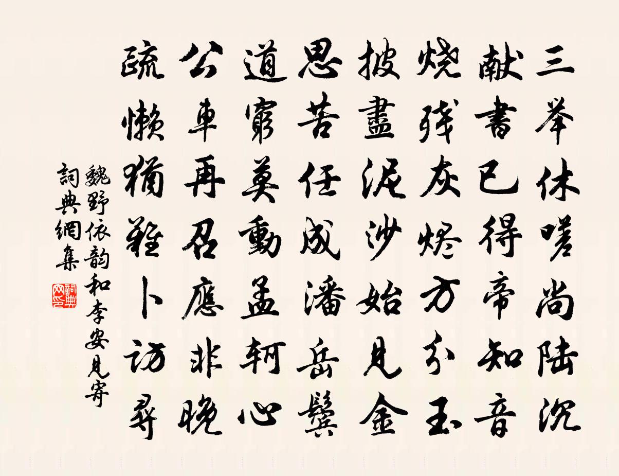 詩詞名句歷史字典書法欣賞書法字典國語詞典說文解字康熙字典古漢語字典標 題 作 者 詩 句 依韻和李安見寄作者:魏野 朝代:宋代依韻和李安見寄原文三舉休嗟尚陸沉,獻書已得帝知音。燒殘灰燼方分玉,披盡泥沙始見金。思苦任成潘岳鬢,道窮莫動孟軻心。公車再召應非晚,疏懶猶難卜訪尋。詩詞問答問:依韻和李安見寄的作者是誰?答:魏野問:依韻和李安見寄寫於哪個朝代?答:宋代魏野依韻和李安見寄書法欣賞依韻和李安見寄書法作品詩詞推薦峽橋喻良能〔宋代〕驚流落石震林坰,一洗紅塵耳目醒。妙語曾聞杜陵老,高江急峽斗雷霆。寄胡達孝二首趙蕃〔宋代〕問訊安豐守,開藩且半年。秋收多少麥,春辟幾何田。但使民能足,端知化已宣。譽毋求赫赫,腹肯愧便便。潁上唐公張集仙相勞宋祁〔宋代〕去時成恨恨,喜見眼中人。共束西崑帙,都為左虎鄰。年華衰意早,酒所故情親。後日孤舟遠,離懷怯重陳。廬山高啟〔明代〕騎馬幽幽度嶺遲,老僧不識使君誰 。門開紅葉林中寺,泉浸青山石上池。殘果已收猿食少,枯松欲折鶴巢危。壁避難東歸,依韻和黃秀才見寄徐鉉〔唐代〕戚戚逢人問所之,東流相送向京畿。自甘逐客紉蘭佩,不料平民著戰衣。樹帶荒村春冷落,江澄霽色霧霏微。時危延平書院落成柬諸友陳宓〔宋代〕群峰九疊勢來雄,直作吾儒五畝宮。隔斷市計才一水,讀書如坐萬山中。陪張丞相自松滋江東泊渚宮孟浩然〔唐代〕放溜下松滋,登舟命楫師。寧忘經濟日,不憚冱寒時。洗幘豈獨古,濯纓良在茲。政成人自理,機息鳥無疑。雲物重遊清源洞釋圓悟〔宋代〕此地今重到,藤蘿長碧陰。緬思仙去後,長有客來吟。出鳥江濤白,連雲嶺樹深。杖藜宜少駐,靈跡尚堪尋。滿庭芳 元霄和元 見寄華幼武〔元代〕萬井笙歌,滿城燈火,元宵預慶豐年。歡聲鼎沸,人氣結春煙。天外冰輪緩轉,畫樓上、玉漏遲傳。鰲山聳,香車失調名佚名〔宋代〕離情愁思,盡分付、眉頭眼底。世情王冕〔元代〕世情多曲折,客況自堪憐。聽雨愁如海,懷人夜似年。草肥燕地馬,花老蜀山鵑。淡冷歸歟計,蒼苔滿石田。句向滈〔宋代〕人情甚似吳江冷,世路真如蜀道難。奉和虢州劉給事使君三堂新題二十一詠柳巷韓愈〔唐代〕柳巷還飛絮,春餘幾許時。吏人休報事,公作送春詩。臘雪劉黻〔宋代〕八窗唯一色,穉子詫天花。不稔已多歲,無寒能幾家。山川增古老,宇宙頓奢華。凍坐無他事,呼松自煮茶。懷新亭四首張嵲〔宋代〕晚秧紛已及,中田日往還。適與好風會,植杖觀前山。初秋憶金均兩弟張九齡〔唐代〕江渚秋風至,他鄉離別心。孤雲愁自遠,一葉感何深。憂喜嘗同域,飛鳴忽異林。青山西北望,堪作白頭吟。歲暮真山民〔宋代〕顏不常朱鬢易斑,流光難駐兩跳丸。一年又是等閒過,百歲只消如此看。把酒何曾長在手,種桃能得幾憑欄。痴人夜泊廬江聞故人在東林寺以詩寄之王昌齡〔唐代〕江路經廬阜,松門入虎溪。聞君尋寂樂,清夜宿招提。石鏡山精怯,禪枝怖鴿棲。一澄如悟道,為照客心迷。次韻王適游真如寺蘇轍〔宋代〕江上春雨過,城中春草深。擾擾市井塵,悠悠溪谷心。東郊大愚山,自古檐卜林。微言久不聞,墜緒誰常尋。道俗送梅子明通判餘杭張耒〔宋代〕東南山水窟,錢塘吳越都。吾人神仙后,厭直承明廬。一舸去莫挽,落帆風月湖。蹁躚青衿子,能誦先生書。借問名句推薦增冰峨峨,飛雪千里些。屈原《招魂》 交親望歸騎,幾處擁年華。盧僎《歲晚還京台望城闕成口號先贈交親》 用人之道,又當以心術為本也。宋濂、王褘《元史·列傳·卷六十八》 登高壯觀天地間,大江茫茫去不還。李白《廬山謠寄盧侍御虛舟》 黃河捧土尚可塞,北風雨雪恨難裁。李白《北風行》 五更櫪馬靜無聲。鄰雞猶怕驚。吳文英《醉桃源·元日》 寒隨一夜去,春逐五更來。史青《應詔賦得除夜》 野店垂楊步,荒祠苦竹叢。范成大《寒食郊行書事》 日暮九疑何處?認舜祠叢竹。文廷式《好事近·湘舟有作》 悲吟雨雪動林木,放書輟劍思高堂。李白《留別於十一兄逖裴十三游塞垣》