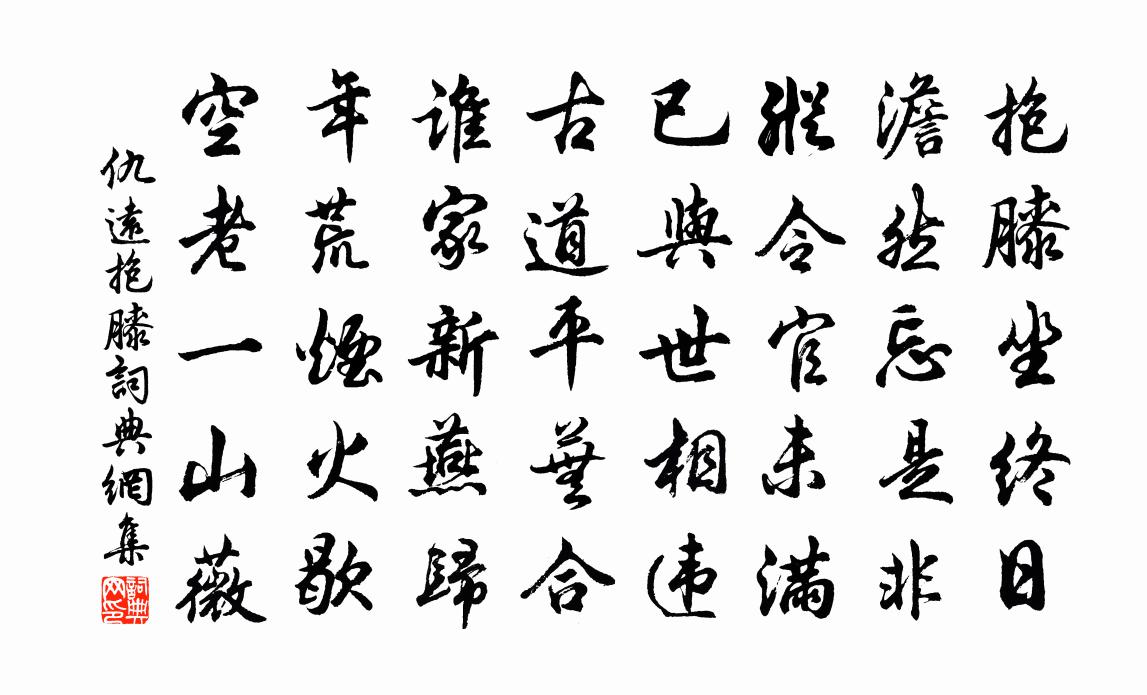 詩詞名句歷史字典書法欣賞書法字典國語詞典說文解字康熙字典古漢語字典標 題 作 者 詩 句 抱膝作者:仇遠 朝代:宋代抱膝原文抱膝坐終日,澹然忘是非。縱令官未滿,已與世相違。古道平蕪合,誰家新燕歸。年荒煙火歇,空老一山薇。詩詞問答問:抱膝的作者是誰?答:仇遠問:抱膝寫於哪個朝代?答:宋代仇遠抱膝書法欣賞抱膝書法作品詩詞推薦訓世孝弟詩十一首邵雍〔宋代〕每日清晨一炷香,謝天謝地謝三光。所求處處田禾熱,惟願人人壽命長。國有賢臣安社稷,家無逆子惱爹娘。四方長相思(京妓·林鐘商)柳永〔宋代〕畫鼓喧街,蘭燈滿市,皎月初照嚴城。清都絳闕夜景,風傳銀箭,露靉金莖。巷陌縱橫。過平康款轡,緩聽歌聲。答賀遂涉(時遂涉為戶部員外,謙光答此)趙謙光〔唐代〕錦帳隨情設,金爐任意熏。唯愁員外置,不應列星文。詩一首魏野〔宋代〕城裡爭看城外花,獨來城裡訪僧家。辛勤旋覓新鑽火,為我親烹嶽麓茶。游靈泉山寺石介〔宋代〕寺遠離朝市,同游並結軨。堦垠盤石磴,殿影落青冥。地勝松筠眾,山名草藥靈。洞門深數里,檜樹壽千齡。疑有雪中用黃太史韻馮時行〔宋代〕密雪誰人巧擬鹽,初飛仍帶雨廉纖。夜吹玉笛滿浮酒,曉看遙山高捲簾。方積銀杯翻過馬,欲銷冰箸插疏檐。不堪台城路 和師言送春袁易〔元代〕落紅填徑東風惡,貪飛燕雛歸晚。聽雨樓低,留春地窄,誰念閒情消減。天涯漫覽。正鷗渚波寬,柳汀雲黯。賴有清遠店范成大〔宋代〕女僮流汗逐氈軿,雲在淮鄉有父兄。屠婢殺奴官不問,大書黥面罰猶輕。有感方回〔宋代〕玩透羲爻未畫前,今時天即古時天。回空其庶亦其庶,軻死不傳焉不傳。積憤淫傷詩未削,暗籌微婉史誰編。繼周永王東巡歌·其五李白〔唐代〕二帝巡遊俱未回,五陵松柏使人哀。諸侯不救河南地,更喜賢王遠道來。坰邀公卷煎茶吳則禮〔宋代〕阿坰手持都堂胯,百千硨磲未論價。渴心知我生塵埃,故遣一甌官茗來。上方井水絕世無,中{左氵右霝}欲簾定和樂天秋涼閒臥劉禹錫〔唐代〕暑退人體輕,雨餘天色改。荷珠貫索斷,竹粉殘妝在。高僧掃室請,逸客登樓待。槐柳漸蕭疏,閒門少光彩。次韻虞萬州滄江海棠魏了翁〔宋代〕維摩老子菌生庵,門外滄江綠正涵。夜雨村村拆花柳,春風日日長桑蠶。晚妝才記海棠睡,朝色俄看禁藥酣。造化寄賀鄭常侍李洞〔唐代〕山亦懷恩地,高禽盡下飛。吏穿霞片望,僧掃月棱歸。省拜墀煙近,林居玉漏微。曾令駐錫話,聊用慰攀依。縣舍西亭二首王安石〔宋代〕主人將去菊初栽,落盡黃花去卻回。到得月年官又滿,不知誰見此花開。贈何生鐵陳維崧〔清代〕鐵汝前來者!曷不學、雀刀龍笛,騰空而化?底事六州都鑄錯,孤負陰陽爐冶。氣上燭、鬥牛分野。小字又聞呼阿次韻芻父秋懷蘇泂〔宋代〕逢人惟婞直,過事懶依阿。菊引陶彭澤,鳶驚馬伏波。衰年如意少,行路得詩多。彼其皆車服,嗟嗟如命何。摸魚兒 題熊伯宜藏梅花捲子張翥〔元代〕記西湖、水邊曾見,查牙老樹如此。冰痕冷沁苔枝雪,的*數花才試。天也似。愛玉質、清高不久閒紅紫。孤山處定水寺行香鄭谷〔唐代〕聽經看畫繞虛廊,風拂金爐待賜香。丞相未來春雪密,暫偷閒臥老僧床。惜梅滕岑〔宋代〕沈瘦難禁詩作魔,年年詩句為花多。亦知習氣要除盡,奈此高風勝韻何。名句推薦深山畢竟藏猛虎,大海終須納細流。佚名《增廣賢文·上集》 轡搖銜鐵。蹴踏平原雪。張炎《清平樂·平原放馬》 若待明朝風雨過,人在天涯!春在天涯。虞集《南鄉一剪梅·招熊少府》 見人初解語嘔啞,不肯歸眠戀小車。韋莊《與小女》 疏是枝條艷是花,春妝兒女競奢華。曹雪芹《詠紅梅花得“花”字》 千淘萬漉雖辛苦,吹盡狂沙始到金。劉禹錫《浪淘沙九首》 種竹淇園遠致君,生平孤節負辛勤。王汝舟《詠歸堂隱鱗洞》 有天命者任自為之,不汝禁也。脫脫《宋史·本紀·卷三》 仁暴者,皆亡國者也。韓非及後人《韓非子·八說》 那堪疏雨滴黃昏。更特地、憶王孫。歐陽修《少年游·欄乾十二獨憑春》