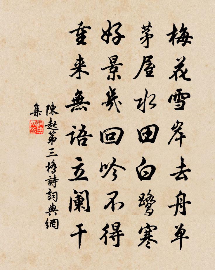 詩詞名句歷史字典書法欣賞書法字典國語詞典說文解字康熙字典古漢語字典標 題 作 者 詩 句 第三橋詩作者:陳起 朝代:宋代第三橋詩原文梅花雪岸去舟單,茅屋水田白鷺寒。好景幾回吟不得,重來無語立闌乾。詩詞問答問:第三橋詩的作者是誰?答:陳起問:第三橋詩寫於哪個朝代?答:宋代陳起第三橋詩書法欣賞第三橋詩書法作品詩詞推薦勝業寺折彥質〔宋代〕故宮余禹跡,勝地屬僧家。古廟松陰合,幽亭竹影斜。嶺雲吟外澹,山鳥定中嘩。譴逐成輕別,空懷客路賒。蔡忠惠家觀墨跡劉克莊〔宋代〕維蔡郡之望,過者必式閭。嚴嚴端明廳,遺像猶肅如。頗聞手澤富,儻許窺珍儲。主人命發笥,棐幾同卷舍。比顏水邊張鎡〔宋代〕翠藤縈樹夕花明,無數圓荷帖亂萍。酒力半銷來照影,晚風輕澹鶴梳翎。別謝師宰王安石〔宋代〕閶闔城西地如水,雞鳴黃塵波浪起。窮年一馬望扶桑,東得省門身輒止。簿書期會老紛紛,邂逅論心喜有君。數日示高台足庵紹印胡寅〔宋代〕萬生紛綸墮迷綱,誰能自拔起情想。隙塵初傍陰色空,燒草又趁春風長。將身出家參佛祖,此病中作膏肓養。足庵為慈上人賦雲溪衛宗武〔宋代〕油然出岫擘晴綿,點綴青空水接天。心跡兩閒無俗累,靜觀飛躍樂魚鳶。次韻明孺見遺之什李處權〔宋代〕世家傳子又傳孫,豈較前身與後身。知足已如倉庾民,忘懷真是葛天民。騎鯨又見詩無敵,射虎何須武絕倫。白屋金雞城范應鈴〔宋代〕夢裹家山竹裹鍾,金雞山下快掀篷。垂楊不隔池樓月,宿酒吹殘楊柳風。再疊仇遠〔宋代〕世態年年改,窮居事事難。予懷雖浩蕩,此地本酸寒。古瀨浮貞女,空齋貯冷官。枯腸與藜莧,歲久頗相安。題秋江待渡圖錢選〔宋代〕山色空濛翠欲流,長江清澈一天秋。茅茨落日寒煙外,久立行人待渡舟。過吳式賢宅方回〔宋代〕君家梅最古,舉世少人知。天地無吾黨,風霜自北枝。一痕新月外,數點小春時。肯為援琴否,浮香更有詩。解纜洪咨夔〔宋代〕春落平蕪外,舟行白雨邊。鳩應山爾汝,櫓畫水之玄。官冷誰能吏,身閒便是仙。康廬真箇去,信有夙生緣。雜詠陸游〔宋代〕少日狂疏觸怒嗔,每緣憂患喪吾真。晚牧咄咄書空手,卻作騰騰任運人。祝英台近·柳煙濃,花王嵎〔宋代〕柳煙濃,花露重,合是醉時候。樓倚花梢,長記小垂手。誰教釵燕輕分,鏡鸞慵舞,是孤負、幾番春晝。自別後。挽南平趙化卿陽枋〔宋代〕昔游曾到萬山峰,趙氏樓台紫翠中。六藝近夸三世學,四賢爭顯一家風。不堪顧影憐孤雁,伺喜摩天有阿鴻。好是頌古五十三首釋文禮〔宋代〕不是風兮不是旙,將軍騎馬出潼關。安南塞北都歸了,時復挑燈把劍看。行路難三首顧況〔唐代〕君不見擔雪塞井空用力,炊砂作飯豈堪食。一生肝膽向人盡,相識不如不相識。冬青樹上掛凌霄,歲晏花凋樹不凋題陳篔谷陳野逸吟藁黃敏求〔宋代〕謝卻梅花吟課少,苦無心事惱陶泓。得君近日詩編讀,增我晴窗眼力明。爽似暑風秋九夏,清逾夜月書三更。後山月夜與兄公度納涼閒行至御橋梅堯臣〔宋代〕夕月吐澄明,陰雲淨如掃。空庭引天翠,爽氣生懷抱。家近御橋頭,因為橋畔游。倚欄波上影,不共水東流。思歸治亂吟五首邵雍〔宋代〕火能勝水,火不勝水,其火遂滅。水能從火,水不從火,其水不熟。夫能制妻,夫不制妻,其妻遂絕。妻能從夫,名句推薦別愁深夜雨,孤影小窗燈。陳克《臨江仙·四海十年兵不解》 棠梨葉落胭脂色,蕎麥花開白雪香。王禹偁《村行·馬穿山徑菊初黃》 忍淚佯低面,含羞半斂眉。韋莊《女冠子·四月十七》 紅樓隔雨相望冷,珠箔飄燈獨自歸。李商隱《春雨》 眉睫才交,夢裡便不能張主;眼光落地,泉下又安得分明。陳繼儒《小窗幽記·集醒篇》 古剎疏鍾度,遙嵐破月懸。李賀《南園十三首》 無聊成獨臥,彈指韶光過。納蘭性德《菩薩蠻·新寒中酒敲窗雨》 思悠悠,恨悠悠,恨到歸時方始休。白居易《長相思·汴水流》 外亂而內整,示飢而實飽,內精而外鈍。姜子牙《六韜·文韜·兵道》 哀蟬無留響,叢雁鳴雲霄。陶淵明《己酉歲九月九日》