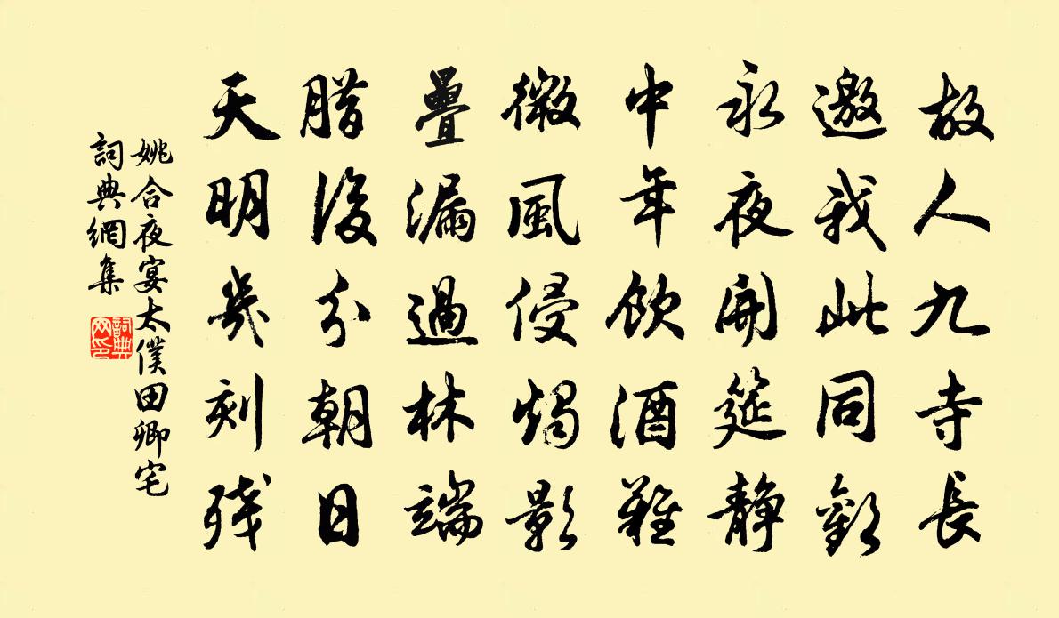 詩詞名句歷史字典書法欣賞書法字典國語詞典說文解字康熙字典古漢語字典標 題 作 者 詩 句 夜宴太僕田卿宅作者:姚合 朝代:唐代夜宴太僕田卿宅原文故人九寺長,邀我此同歡。永夜開筵靜,中年飲酒難。微風侵燭影,疊漏過林端。臘後分朝日,天明幾刻殘。詩詞問答問:夜宴太僕田卿宅的作者是誰?答:姚合問:夜宴太僕田卿宅寫於哪個朝代?答:唐代問:夜宴太僕田卿宅是什麼體裁?答:五律姚合夜宴太僕田卿宅書法欣賞夜宴太僕田卿宅書法作品注釋全唐詩:卷500-29詩詞推薦送僧歸霅寺坐夏釋永頤〔宋代〕道會三旬滿,鄉山九夏安,蝶移金鼓夢,龍護寶蓮書。日落沙洲迥,苹香水殿虛。閉門溪上寺,好好自安居。壽劉丞洪咨夔〔宋代〕秋橫岱嶽氣象豪,仰瞻萬仞青且高。上凌層漢直咫尺,下視列岫真兒曹。此山萬古儲勝跡,年年人慶東平日。誰知正月二十八日避難至海陵從先流寓兄弟之招仍晁說之〔宋代〕百困身猶在,尪羸怯鏡看。干戈朝食拙,風雨夜眠難。天際旄頭遠,淮南春首寒。病夫藥裹外,兄弟為謀安。三姝媚(送聖與還越)周密〔宋代〕淺寒梅未綻。正潮過西陵,短亭逢雁。秉燭相看,嘆俊游零落,滿襟依黯。露草霜花,愁正在、廢宮蕪苑。明月河題黃岡寺次吳履齋韻文天祥〔宋代〕長江幾千里,萬折必歸東。南浦驚新雁,廬山隔晚風。人行荒樹外,秋在斷蕪中。何日洗兵馬,車書四海同。葛秘校和予關字韻詩兩篇再以一篇奉酬王洋〔宋代〕數州形勝共鄉關,江浦淮堧一望間。長恨崎嶇千里隔,那知邂逅兩身閒。稻粱要足幾時足,閭井欲還何日還。猶勝曹路分贈詩次韻一首劉克莊〔宋代〕古來詩律推曹氏,不數河梁與董逃。唐季三家松最勝,建安七子植尤高。短檠尚課兒精選,老筆真堪仆命騷。極欲白廬山歸城賦四首董嗣杲〔宋代〕才去還回似不情,蕭然兩耳亂泉聲。衣巾染得江嵐透,誰道山人骨亦清。叩棺歌吳秉信〔宋代〕信叟歸去來,三界無安不可住,西方淨土有蓮胎,願去來。折楊柳江總〔隋代〕萬里音塵絕。千條楊柳結。不悟倡園花。遙同羌嶺雪。春心自浩蕩。春樹聊攀折。共此依依情。無奈年年別。詩二首趙師秀〔宋代〕滿任添新發,還家帶舊琴。鵲聲先棹去,柳色到都深。即日應冠豸,憑共記得沈。南鄉子 風琴王哲〔元代〕妙手喜新成。十六條弦別有名。掛在宮中雲外路,風迎。便許能招自己聲。不入俗人聆。占得仙音講道經。唯我傍春日舟中對雪寄刁經臣梅堯臣〔宋代〕誰道江南暖,新春見雪飛。鷗來親客艇,花亂上人依。古郡地偏寂,野窗寒入微。戴家人不遠,欲去未能歸。讀秦紀七絕劉克莊〔宋代〕逐客古人先後相,絕它柏翳皆蘭陵。況書舊德優諸子,呂覽今編入六經。寒食後北樓作韋應物〔唐代〕園林過新節,風花亂高閣。遙聞擊鼓聲,蹴鞠軍中樂。睡起三絕岳珂〔宋代〕五更展轉待晨光,到曉瞢騰入睡鄉。卻是金門早朝客,千金不博枕中方。送孫隱之都官通判秀州梅堯臣〔宋代〕柳條枯落盡,不折意徘徊。泛汴趨殘水,到吳看早梅。無耽聽鶴唳,有信寄鴻來。聞說閭亭改,靈光化劫灰。舍北野望陸游〔宋代〕早歲遭逢異,中年促召頻。馳驅猶許國,臥起已須人。藥石三秋病,風波萬里身。籬門殘照里,慘澹易傷神。和傅侍郎至臨漳感舊十詠陳淳〔宋代〕南州佳品勝羅浮,青女飛花任打頭。寒涸更深香更烈,松朋梅友敢凌不。冬至贈潘郎二首張耒〔宋代〕荻籬茅屋柯山下,賣餅歸來也作冬。不見長安競時節,車如流水馬如龍。名句推薦輕寒細雨情何限。不道春難管。秦觀《虞美人·碧桃天上栽和露》 千門開鎖萬燈明,正月中旬動帝京。張祜《正月十五夜燈》 秋風起兮木葉飛,吳江水兮鱸正肥。張翰《思吳江歌》 雁聚河流濁,羊群磧草膻。齊己《送人游塞》 治國者,必以奉法為重。羅貫中《三國演義·第九十六回》 處世讓一步為高,退步即進步的張本洪應明《菜根譚·概論》 桐花半畝,靜鎖一庭愁雨。周邦彥《瑣窗寒·寒食》 憑觴靜憶去年秋,桐落故溪頭。晏幾道《訴衷情·憑觴靜憶去年秋》 春風知別苦,不遣柳條青。李白《勞勞亭》 西園何限相思樹,辛苦梅花候海棠。元好問《鷓鴣天·候館燈昏雨送涼》