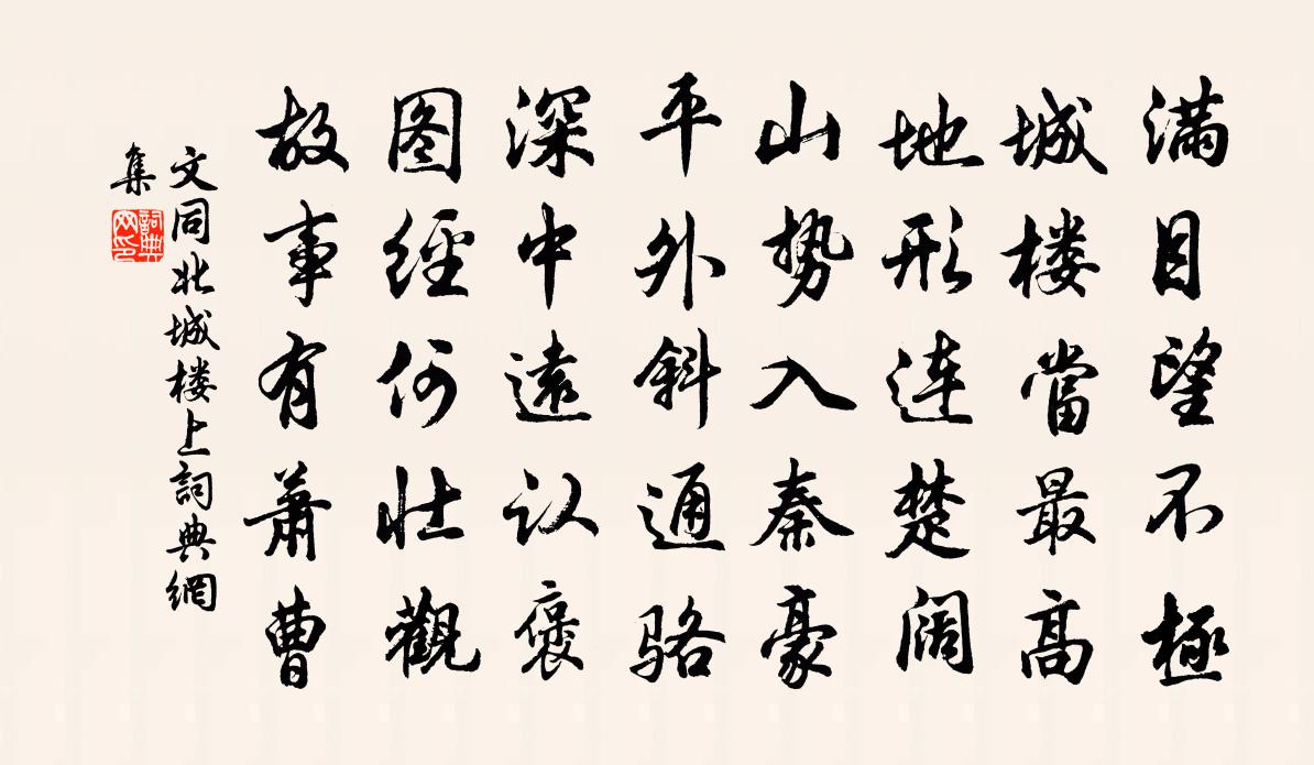 詩詞名句歷史字典書法欣賞書法字典國語詞典說文解字康熙字典古漢語字典標 題 作 者 詩 句 北城樓上作者:文同 朝代:宋代北城樓上原文滿目望不極,城樓當最高。地形連楚闊,山勢入秦豪。平外斜通駱,深中遠認褒。圖經何壯觀,故事有蕭曹。詩詞問答問:北城樓上的作者是誰?答:文同問:北城樓上寫於哪個朝代?答:宋代文同北城樓上書法欣賞北城樓上書法作品詩詞推薦醉落魄/一斛珠石孝友〔宋代〕友鶯夢蝶。尋花問柳深相結。教春去後群芳歇。零落朋游,辜負好時節。眼邊愁緒多於發。迢迢一水通吳越。舊歡臧夫人輓詩二首王洋〔宋代〕奕世流芳遠,傳家慶有餘。簪荊苹薦潔,曳練寶妝疏。載德光門閥,成名振時閭,如何裁半日,一旐向輀車。曉出洪咨夔〔宋代〕一雙杜宇青天月,兩點烏犢白水陂。不為好山勾引出,那知已是插秧時。偈頌八十七首釋慧開〔宋代〕三月清明節禁菸,桃華帶雨倍鮮妍。皆言當日靈雲悟,笑破禪和口半邊。望江南淨圓〔宋代〕西方好,七寶甃成池。四色好華敷菡萏,八功德水泛清漪。除渴又除飢。池岸上,樓殿勢飛翬。碧玉雕欄填瑪瑙,老柏三首陳師道〔宋代〕英姿帶枯槁,勁節闕和柔。物理有興壞,人情成去留。稍看棲鳥集,聊待晚風秋。解道庭前柏,何曾識趙州。蘇文忠歸潁帖贊岳珂〔宋代〕事師這情,期以百世。言雖不多,意則獨至。識以歲月,越王之孫。式時覽觀,用考大倫。與暢當夜泛秋潭盧綸〔唐代〕螢火颺蓮叢,水涼多夜風。離人將落葉,俱在一船中。七夕賈雲華〔宋代〕斜軃香雲倚翠屏,紗衣先覺露會零。誰雲天上無離合,看取牽牛織女星。送程德孺赴江西張耒〔宋代〕程侯治楚我獨知,去時民作嬰兒啼。歸來明光見天子,還把一節來江西。年來屢下寬大詔,赤子未免寒與飢。恩如失題王昌齡〔唐代〕時與醉林壑,因之墮農桑。槐煙漸含夜,樓月深蒼茫。答文與可以六言詩相示因道濟南事作十首蘇轍〔宋代〕終歲常親鞭撲,此生知負詩書。欲尋舊學無處,時有故人起予。出遊遇雨而返陸游〔宋代〕荒山前頭野水邊,東行西行不自憐。天公豈亦哀老子,風雨留教終日眠。七十翁五言十首方回〔宋代〕愁與憂全異,歡于樂尚遙。百年元易度,一日卻難消。玉叵圭中必,桐猶爨下焦。襟懷殊鬱郁,縱目卻飄飄。柳梢青(詠海棠)曾覿〔宋代〕雨過風微。溫泉浴倦,妃子妝遲。翠袖牽雲,朱唇得酒,臉暈胭脂。年年海燕新歸。怎奈向、黃昏恁時。倚遍瓊乾嘲武懿宗張元一〔唐代〕長弓短度箭,蜀馬臨階騙。去賊七百里,隈牆獨自戰。忽然逢著賊,騎豬向南趣。賢者之孝二百四十首廉范林同〔宋代〕親喪徒步負,萬里歷岷峨。何事今人說,惟知襦袴歌。詠陶羅榮祖〔宋代〕解體脫世紛,結志懷往義。織緯足充糧,種秫常供醉。素琴寄長謠,孤衿抗高視。國爵屏如羶,家貧甘若嗜。徑荒舟行遇雪三首趙蕃〔宋代〕沙嘴縈分直更紆,望中不盡渺愁予。晚來一雨便成雪,翠巘修林同一如。予頃得宛陵葛生所茹筆十餘筒其中復得精妙者林逋〔宋代〕江南秋兔老毫疏,數字鐘王尚賈餘。因讀退之毛穎傳,可憐今日不中書。名句推薦疏條交映,有時見日。吳均《與朱元思書》 壯年何事憔悴,華發改朱顏。蘇舜欽《水調歌頭·滄浪亭》 別後不知君遠近。觸目淒涼多少悶。歐陽修《玉樓春·別後不知君遠近》 專勝者未必克,挾疑者未必敗。范曄《後漢書·列傳·烏桓鮮卑列傳》 相思本是無憑語,莫向花箋費淚行。晏幾道《鷓鴣天·醉拍春衫惜舊香》 莫遣只輪歸海窟,仍留一箭射天山。李益《塞下曲》 淺不足與測深,愚不足與謀智,坎井之蛙,不可與語東海之樂。荀子《荀子·正論》 天下之本在國,國之本在家,家之本在身。孟子《孟子·離婁章句上·第五節》 雁聲吹過黃昏雨,籬邊月圓萋緊端木國瑚《齊天樂·菊影(雁聲吹過黃昏雨)》 試問鄉關何處是,水雲浩蕩迷南北。趙鼎《滿江紅·丁未九月南渡泊舟儀真江口作》