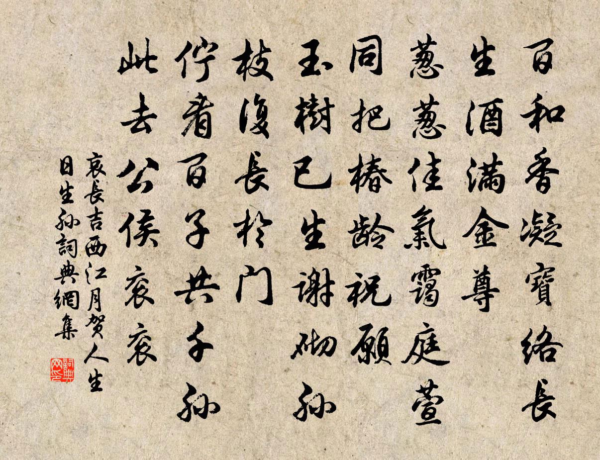 詩詞名句歷史字典書法欣賞書法字典國語詞典說文解字康熙字典古漢語字典標 題 作 者 詩 句 西江月(賀人生日生孫)作者:哀長吉 朝代:宋代西江月(賀人生日生孫)原文百和香凝寶絡,長生酒滿金尊。蔥蔥佳氣靄庭萱。同把椿齡祝願。玉樹已生謝砌,孫枝復長於門。佇看百子共千孫。此去公侯袞袞。詩詞問答問:西江月(賀人生日生孫)的作者是誰?答:哀長吉問:西江月(賀人生日生孫)寫於哪個朝代?答:宋代問:西江月(賀人生日生孫)是什麼體裁?答:詞哀長吉西江月(賀人生日生孫)書法欣賞西江月(賀人生日生孫)書法作品詩詞推薦看壓新醅寄懷襲美陸龜蒙〔唐代〕曉壓糟床漸有聲,旋如荒澗野泉清。身前古態熏應出,世上愁痕滴合平。飲啄斷年同鶴儉,風波終日看人爭。尊中送弟赴和州幕梅堯臣〔宋代〕夾河為郡不如古,江北江南作冗官。須記長傳一經訓,雖貧莫改飲瓢歡。歷陽況與吾廬近,春谷休言問膳難。此日宣城馬御史酒闌一夕而西因以寄之御史嘗留老梅堯臣〔宋代〕三更鐵醉下陵陽鐵峰,平明鐵溪上去無蹤。叉牙鐵鎖謾橫絕,濕櫓不驚潭底龍。斷腸吳姬指如鐵,欲剝玉棐將何從內直以金橘送七兄周必大〔宋代〕晝臥玉堂殿,眼看金彈丸。禹包經歲月,鄭驛助杯盤。黃帶霜前綠,甘移醉後酸。江湖有兄弟,此日憶團欒。贈青城洞翁二首張繼先〔宋代〕神仙抱一養玄微,九載功成白日飛。道在當人須順授,今朝何必秘天機。藥洲四首劉克莊〔宋代〕觀寺臨湖上,亭台出柳間。都忘來五嶺,將謂在孤山。減字木蘭花沈瀛〔宋代〕淵明酒止。莫信渠言心妄喜。達士高風。只說三杯大道通。不如飲酒。人世豈能金石壽。無奈渠何。贏得尊前笑語前日石上松王安石〔宋代〕前日石上松,斸移沙水際。青青折釵股,俯映幽人砌。蟠根今鬯茂,落子還蒼翠。三年一楮葉,世事真期費。燕居晁宗慤〔宋代〕煉礦成金得寶珍,煉情成性合天真。相逢此理交談者,千百人中無一人。題齋壁張耒〔宋代〕松庭日午聽啼鶯,簾外人稀睡老鈴。已嘆近秋添白髮,更因多病讀黃庭。江魚未上烹難致,吳酒空斟醉易醒。好住集義齋張載〔宋代〕小齋新創得新名,大筆標題字勢輕。養勇所期戾孟子,動心那肯詫齊卿。川流有本源源聽,月入容光處處明。此道穎公遺碧霄峰茗梅堯臣〔宋代〕到山春已晚,何更有新茶。峰頂應多雨,天寒始發芽。采時林狖靜,蒸處石泉嘉。持作衣囊秘,分來五柳家。柳夫人輓詞林季仲〔宋代〕風俗日雲薄,典刑終未泯。請看列女傳,今有柳夫人。色養金章貴,褒封鈿軸新。淒涼板輿路,卻見小梅春。溪月陸游〔宋代〕天風吹髮冷颼颼,獨向沙邊上釣舟。愁絕平羌江上月,向人依舊半輪秋。和李文伯暑時五首之蘄蕈黃庭堅〔宋代〕吾家笛竹簟,舊物最所惜。當年楚山秋,林下千金得。寒光不染著,敻與塵泥隔。落日照江波,依稀比顏色。交韻趙文鼎雨中韓元吉〔宋代〕老病幽棲不厭閒,未須訊息夢長安。一春意淡連牆竹,終日清香小檻蘭。紅蕊便驚風裡盡,青林猶愜雨中看。故人頌古十六首釋明辯〔宋代〕畫得真如活,華間試展開。黃鶯偷眼覷,不敢下枝來。次馬季思十韻蘇泂〔宋代〕巷內窗有佳人,窗其志介如窗石。沉酣數千卷,徑草無行跡。秋清入肺胃,籬落牽牛碧。詩成錦繡段,裁剸非刀尺秋至詹初〔宋代〕方趁夏日永,不知秋已清。秋清歲即晚,吾道終何成。為子侄入宗學賦二首誌喜趙必蒸〔宋代〕月露才華錦繡章,麟經家學獨夸長。笑談鏖戰聯三捷,此是男兒立志強。名句推薦見出以知入,觀往以知來列子及其弟子《列子·說符》 張而不弛,文武弗能也;弛而不張,文武弗為也。一張一弛,文武之道也。戴聖《禮記·雜記下》 蕭條清萬里,瀚海寂無波。李白《塞上曲》 疏星淡月鞦韆院,愁雲恨雨芙蓉面。張可久《塞鴻秋·春情》 使人有面前之譽,不若使人無背後之毀陳繼儒《小窗幽記·集醒篇》 木謂之華,草謂之榮。佚名《爾雅·釋草》 是法平等無有高下。鳩摩羅什譯《金剛經·淨心行善》 但使龍城飛將在,不教胡馬度陰山。王昌齡《出塞二首》 壯年何事憔悴,華發改朱顏。蘇舜欽《水調歌頭·滄浪亭》 小人錯其在己者,而慕其在天者。荀子《荀子·天論》