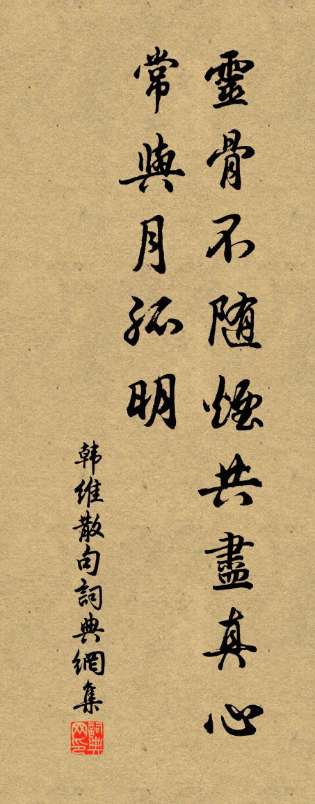 詩詞名句歷史字典書法欣賞書法字典國語詞典說文解字康熙字典古漢語字典標 題 作 者 詩 句 句作者:韓維 朝代:宋代句原文靈骨不隨煙共盡,真心常與月孤明。詩詞問答問:句的作者是誰?答:韓維問:句寫於哪個朝代?答:宋代韓維句書法欣賞句書法作品詩詞推薦簾歐陽修〔宋代〕銀蒜鈎簾宛地垂,桂叢烏起上朝暉。枉將玳瑁雕為押,遮掩春堂礙燕歸。再和古梅蘇泂〔宋代〕和羹之說昔有聞,豈得不如魯泮芹。聞名尚救渴將軍,會稽竹箭胡能群。初花的皪美無度,情事淡泊春空雲。樹猶踏莎行劉志淵〔元代〕動靜忘機,聰明不作。悟來總把塵情削。心燈挑剔不曾昏,慧光遍照彌寥廓。常淨常清,不耽不著。一真境上從盤苦秋暑引李昴英〔宋代〕商金久得柄,老火未退舍。甑中著寰宇,赫酷甚於夏。池湯頗殃魚,田龜應害稼。桃笙亦槳汗,水國無涼榭。扇揮早度分水嶺盧照鄰〔唐代〕丁年游蜀道,班鬢向長安。徒費周王粟,空彈漢吏冠。馬蹄穿欲盡,貂裘敝轉寒。層冰橫九折,積石凌七盤。重溪試製舉人呈同舍諸公二首蘇轍〔宋代〕垣中不減台端峻,池上來從柱下嚴。同直舊曾連月久,暫來還喜二公兼。〈仆頃與孫莘老同在諫垣,與彭器資同在嘉禾百詠周都官墓張堯同〔宋代〕不識君名字,應難問子孫。一丘浮水際,神怪欲誰論。初寒陸游〔宋代〕我窮不自活,萬事付天公。今年寒苦晚,霧雨常蒙蒙。雖逭裘褐憂,坐念疾病攻。清夜喜不寐,萬木號西風。新霜句高似孫〔宋代〕無詩如鄭谷,有發似馮唐。送季平道中四絕鄭剛中〔宋代〕田夫擊喜祀田神,盤案相呼盡欲醺。我願四郊無犬吠,常令此輩樂耕耘。句吳光〔宋代〕笛弄一聲橫釣艇,月明千里上層樓。李正之提點行至郴,用予忙字韻寄,和答范成大〔宋代〕天涯逢我病,秋晚送君忙。感慨交情厚,留連別恨長。賓筵猶雪觀,客路已雲莊。搖落郴江路,應須憶醉鄉。焚書坑羅隱〔唐代〕千載遺蹤一窖塵,路傍耕者亦傷神。祖龍算事渾乖角,將謂詩書活得人。奉寄彭城公李華〔唐代〕公子三千客,人人願報恩。應憐抱關者,貧病老夷門。巢烏行鮑溶〔唐代〕烏生几子林蕭條,雄烏求食雌守巢。夜愁風雨巢傾覆,常見一烏巢下宿。日長雛飢雄未回,雌烏下巢去哀哀。野田【越調】憑欄人喬吉〔元代〕香篆一點雕盤螢度秋,半縷宮奩雲弄愁。情緣不到頭,寸心灰未休。金陵道中瘦馬馱詩天一涯,倦鳥呼愁村數家。一翦梅謝應芳〔元代〕一天和氣盎春暉。桃也芳菲。李也芳菲。若教風打雨淋漓。紅也塵泥。白也塵泥。花前把酒插花枝。歌也相宜。舞題左顧亭張鎡〔宋代〕物我何曾有異同,莫言龜印偶相逢。水中放去爐中得,心法須知一鏡空。離觴不醉,至驛卻寄相送諸公柳宗元〔唐代〕無限居人送獨醒,可憐寂寞到長亭。荊州不遇高陽侶,一夜春寒滿下廳。宮詞四首吳百生〔宋代〕鈞樂雲中動,鑾輿天上行。百花齊醉日,孤月獨明更。不漏頻催酒,金爐細結甍。春秋有常幸,日日調清平。名句推薦親朋無一字,老病有孤舟。杜甫《登岳陽樓》 何方可化身千億,一樹梅花一放翁。陸游《梅花絕句·其一》 人行事施予,以利之為心,則越人易和;以害之為心,則父子離且怨。韓非及後人《韓非子·外儲說左上》 捲地風來忽吹散,望湖樓下水如天。蘇軾《六月二十七日望湖樓醉書》 醉月頻中聖,迷花不事君李白《贈孟浩然》 清水出芙蓉,天然去雕飾。李白《經亂離後天恩流夜郎憶舊遊書懷贈江夏韋太守良宰》 牧人驅犢返,獵馬帶禽歸。王績《野望》 常隨寶鐙陪金勒,絕塞指揮萬馬嘶。俞益謨《中洲株柳》 楊花落盡子規啼,聞道龍標過五溪。李白《聞王昌齡左遷龍標遙有此寄》 如來不應以具足諸相見。鳩摩羅什譯《金剛經·離色離相》