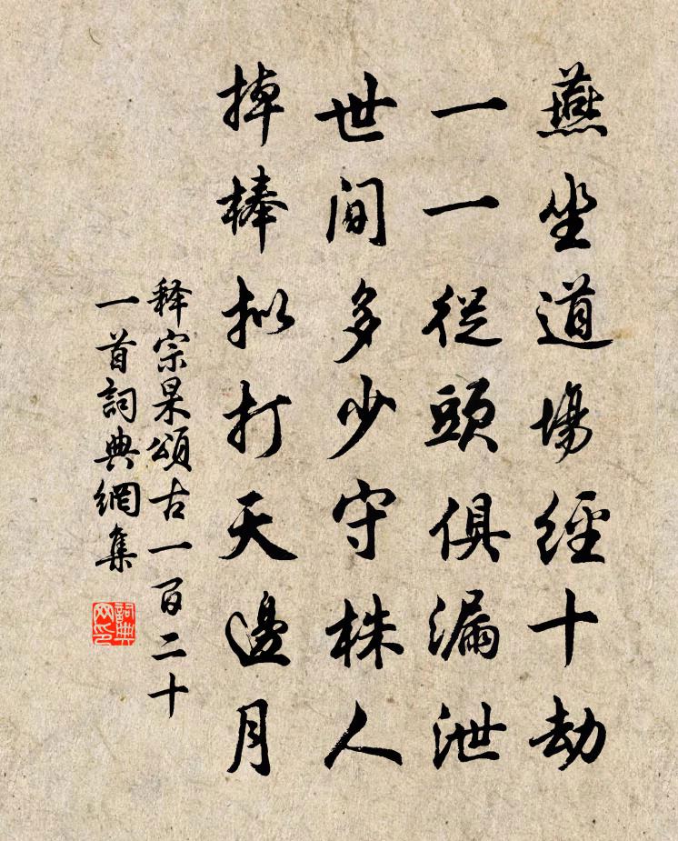 詩詞名句歷史字典書法欣賞書法字典國語詞典說文解字康熙字典古漢語字典標 題 作 者 詩 句 頌古一百二十一首作者:釋宗杲 朝代:宋代頌古一百二十一首原文燕坐道場經十劫,一一從頭俱漏泄。世間多少守株人,掉棒擬打天邊月。詩詞問答問:頌古一百二十一首的作者是誰?答:釋宗杲問:頌古一百二十一首寫於哪個朝代?答:宋代釋宗杲頌古一百二十一首書法欣賞頌古一百二十一首書法作品詩詞推薦挽刑邦用孫應時〔宋代〕十載潛心學有方,韜藏曾不露鋒鋩。前途萬里能脂轄,此志傷君死未忘。題虎丘山西寺朱長文〔唐代〕王氏家山昔在茲,陸機為賦陸雲詩。青蓮香匝東西宇,日月與僧無盡時。頌古釋道顏〔宋代〕風頭稍硬難安立,暖氣才通瞌睡來。卻笑明招閒費力,無端兩處強差排。女冠子李珣〔唐代〕星高月午,丹桂青松深處。醮壇開,金磬敲清露,珠幢立翠苔。步虛聲縹緲,想像思徘徊。曉天歸去路,指蓬萊。梅花七律張道洽〔宋代〕萬雪千霜百歲枯,月中不數桂婆娑。香來野墅深深徑,影落寒池淺淺波。眾木凋零愁凍折,一枝的皪得春多。題詩過鄰家陸游〔宋代〕扶杖過吾鄰,相夸自在身。年豐稱貸少,酒賤往來頻。群散雞歸柵,聲喧雀噪囷。丁寧語兒子;切勿厭沉淪。菖蒲陸游〔宋代〕古澗生菖蒲,根瘦節蹙密;仙人教我服,刀匕蠲百疾。陽狂華陰市,顏朱發如漆。歲久功當成,壽與天地畢。秋思三首鮑溶〔唐代〕胡風吹雁翼,遠別無人鄉。君近雁來處,幾回斷君腸。昔奉千日書,撫心怨星霜。無書又千日,世路重茫茫。燕國八駿圖詩元稹〔唐代〕穆滿志空闊,將行九州野。神馭四來歸,天與八駿馬。龍種無凡性,龍行無暫舍。朝辭扶桑底,暮宿崑崙下。鼻息和彥時兄臘雪六首王之道〔宋代〕瑤林交映出風塵,便覺寒門氣象新。莫訝窗前群噪鵲,須憐江上有歸人。拋磚已喜來荊璞,斲堊無勞運郢斤。坐擁笛 / 中秋聞笛朱淑真〔宋代〕誰家橫笛弄輕清,喚起離人枕上情。自是斷腸聽不得,非乾吹出斷腸聲。上清宮方丈後亭白玉蟾〔宋代〕三四聲猿叫落月,六七竿竹呼起風。夜靜無人知此味,還他方丈拙庵翁。梁鼓吹曲 漢東流沈約〔南北朝〕漢東流。江之汭。逆徒蜂聚。旌旗紛蔽。仰震威靈。乘高騁鋭。至仁解網。窮鳥入懷。因此龍躍。言登泰階。襄陽古樂府三首野鷹來蘇軾〔宋代〕野鷹來,萬山下,荒山無食鷹苦飢,飛來為爾系彩絲。北原有兔老且白,年年養子秋食菽。我欲擊之不可得,年深題烏程簿廳浮玉亭七首袁說友〔宋代〕浮屠高直一溪雲,水面渾如鏡面分。此景正緣高士得,不然何以獨輸君。三月十三日游卞氏園韓維〔宋代〕窄徑下深竹,有堤平若席。開樽蔭密樹,正見溪水碧。游魚出柳根,翕忽無定跡。酒行不須遽,月色林上白。郡中上元燈減舊例三之二而又迎送使客七首楊萬里〔宋代〕村里風回市里聲,月中人看雪中燈。滿城只道歡猶少,不道譙門冷似冰。有售畫於余令作楊柳黃鸝池塘萱草既成可觀用曾豐〔宋代〕一段池塘萱草奇,其形便畫理便詩。到離形處畫之妙,詩妙更無形可離。偈頌一百六十首釋宗杲〔宋代〕即心即佛莫妄求,非心非佛休別討。紅爐焰上雪華飛,一點清涼除熱惱。太皇太后輓詞二首范祖禹〔宋代〕誕保天基命,光開帝永圖。軒星臨斗極,堯日上雲衢。美化形風雅,成功入典謨。群生何以報,損壽濟寰區。名句推薦握手西風淚不乾,年來多在別離間。納蘭性德《於中好·送梁汾南還為題小影》 四百年來成一夢,堪愁。王安石《南鄉子·自古帝王州》 知音少,弦斷有誰聽。岳飛《小重山·昨夜寒蛩不住鳴》 今夫飛蓬遇飄風而行千里,乘風之勢也。商鞅《商君書·禁使》 不知命,無以為君子也;不知禮,無以立也;不知言,無以知人也。孔子弟子《論語·堯曰篇》 恩威同施,才德相較,苟無功,得無天耶?來俊臣《羅織經·治下卷第三》 帳底吹笙香吐麝,更無一點塵隨馬。蘇軾《蝶戀花·密州上元》 今日樓台鼎鼐,明年帶礪山河辛棄疾《西江月·堂上謀臣尊俎》 好人之所惡,惡人之所好,是謂拂人之性,災必逮夫身。曾子《大學·第十一章》 瑤池阿母綺窗開,黃竹歌聲動地哀李商隱《瑤池》