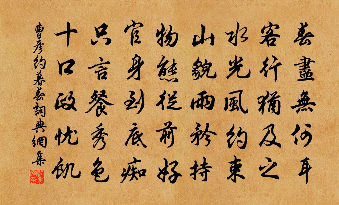 詩詞名句歷史字典書法欣賞書法字典國語詞典說文解字康熙字典古漢語字典標 題 作 者 詩 句 暮春作者:曹彥約 朝代:宋代暮春原文春盡無何耳,客行猶及之。水光風約束,山貌雨矜持。物態從前好,官身到底痴。只言餐秀色,十口政憂飢。詩詞問答問:暮春的作者是誰?答:曹彥約問:暮春寫於哪個朝代?答:宋代曹彥約暮春書法欣賞暮春書法作品詩詞推薦霜夜陸游〔宋代〕土床紙帳臥幽寂,枕上細聽城上更。榾柮燒殘地爐冷,喔咿聲斷天窗明。風霜欲透草茨屋,鹽酪不下薺糝羹。猶恨代簡答張淳秘校邵雍〔宋代〕老年前事怕追思,更見曾悲先德詩。卻有斷章聊 * ,如今冢嗣弱於誰。九日思杭州舊遊寄周判官及諸客白居易〔唐代〕忽憶郡南山頂上,昔時同醉是今辰。笙歌委曲聲延耳,金翠動搖光照身。風景不隨宮相去,歡娛應逐使君新。江山寄柏閣宗涓上人張詠〔宋代〕周衰風雅變,詩匠著禪衣。身世閒雲片,煙霞共鶴歸。引泉涼月動,掃徑落花飛。自信乾時拙,終求對掩扉。寄呂子和南廂陸游〔宋代〕新地多名德,君家不乏公。還看短袍綠,來蹋軟麈紅。小忍便無事,力行方有功。官閒能念我,時寄尺書東!醉中寄魯望一壺並一絕皮日休〔唐代〕門巷寥寥空紫苔,先生應渴解酲杯。醉中不得親相倚,故遣青州從事來。齊天樂(和楚客賦蘆)方岳〔宋代〕孤蓬夜傍低叢宿,蕭蕭雨聲悲切。一岸霜痕,半江煙色,愁到沙頭枯葉。澹雲沒滅。黯西風吹老,滿汀新雪。天豈碩鼠佚名〔先秦〕碩鼠碩鼠,無食我黍!三歲貫女,莫我肯顧。逝將去女,適彼樂土。樂土樂土,爰得我所。碩鼠碩鼠,無食我麥!初春欲為小飲先寄運使唐司勛運判張都官鄭獬〔宋代〕人生長與賞心違,莫遣樽前笑語稀。老去未羞花插帽,醉來不怕酒淋衣。免聽畫鼓催朝去,且駐金鞍待月歸。休道小春六花李花岳珂〔宋代〕一枝眼底物華新,翠袖清霜更可人。靚色不須夸縞夜,韶容聊復返青春。日烘有意姿仍潔,露洗無言態更真。不趁題天壽觀清隱山房仇遠〔宋代〕紫極秋聲竹滿軒,一塵飛不涴琴樽。白雲自逐秋風去,臥看青山嬾出門。至曾田市貽管巡檢謝諤〔宋代〕一年三過曾田市,春去秋來瞬息間。安得此身無俗累,清高長似寨前山。望江南/憶江南朱敦儒〔宋代〕炎晝永, * 月侵床。露臥一叢蓮葉畔,芙蓉香細水風涼。枕上是仙鄉。浮世事,能有幾多長。白日明朝依舊在,船子和尚贊釋慧遠〔宋代〕老手當年靠夾山,全機喪盡結深冤。父南子北家何在,撥轉天關地軸翻。酬王立之二首陳師道〔宋代〕重梅雙杏巧相將,不為遊人只自芳。應怪詩翁非老手,相逢不作舊時香。所苦之中無以遣悶更堤題新竹別獻五章幸賜披李至〔宋代〕不似溪邊本自芳,且須將護少同防。兒童縱未騎為馬,鄰舍潛應引過牆。和富公權宗丞十站王之道〔宋代〕舍北湖山千疊翠,街面溪水一篙深。黃鸝也似快晴日,楊柳陰中訴好音。次韻劉後村所贈延慶主僧圭復翁詩三首陳著〔宋代〕古往今來幾過帆,天高地下一浮庵,與翁相見亦偶爾,一笑無言意自參。滿江紅 自述呈知己時有小言劉敏中〔元代〕鳥飛兔走,嘆勞生、浮世匆匆如此。眼底風塵今古夢,到了誰非誰是。擊短扶長,曲邀橫結,為問都能幾。悠悠長再次韻為謝周麟之〔宋代〕公詩律嚴如用兵,江淮草木先知名。少當千人掃文陣,晚策百勝攻愁城。詩壇老將天下傑,筆倒三江流萬折。時將名句推薦聞道故林相識多,罷官昨日今如何李頎《送陳章甫》 妾身獨自眠,月圓人未圓。王元鼎《憑欄人·閨怨》 結交在相知,骨肉何必親。佚名《箜篌謠》 新知遭薄俗,舊好隔良緣。李商隱《風雨》 君疑臣則臣必死。羅貫中《三國演義·第一百一十九回》 學者不患才之不贍,而患志之不立。徐幹《中論·上卷·治學》 君子安禮樂利,謹慎而無斗怒,是以百舉而不過也。荀子《荀子·臣道》 馬毛縮如蝟,角弓不可張。鮑照《代出自薊北門行》 在天願作比翼鳥,在地願為連理枝。白居易《長恨歌》 三年耕,必有一年之食;九年耕,必有三年之食。戴聖《禮記·王制》