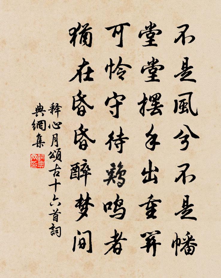 詩詞名句歷史字典書法欣賞書法字典國語詞典說文解字康熙字典古漢語字典標 題 作 者 詩 句 頌古十六首作者:釋心月 朝代:宋代頌古十六首原文不是風兮不是幡,堂堂擺手出重關。可憐守待雞鳴者,猶在昏昏醉夢間。詩詞問答問:頌古十六首的作者是誰?答:釋心月問:頌古十六首寫於哪個朝代?答:宋代釋心月頌古十六首書法欣賞頌古十六首書法作品詩詞推薦夜坐二首楊萬里〔宋代〕繡簾無力護東風,燭影何曾正當紅。獸炭貂裘猶道冷,梅花不易玉霜中。宗教院劉鑄〔宋代〕雨過江山麗,春深筍蕨肥。扶藜蒼蘚破,移榻亂雲飛。立春前一夕雪二首陳造〔宋代〕天仙幾夜集瑤台,剪水篩瓊不受催。直遣瑞花將臘去,盡驅和氣與春回。坐窗客有吟飛絮,對酒人應唱落梅。雪與鄧州西軒書事十首陳與義〔宋代〕小儒避賊南征日,皇帝行天第一春。走到鄧州無腳力,桃花初動雨留人。送許先輩尉宗城司馬光〔宋代〕紅塵久帝城,高價動公卿。竹柏寒方茂,驊騮老更成。冰霜驅馬瘦,書劍束裝輕。丞相虛東閣,遙知倒履迎。滿江紅 送鄭鵬南經歷赴河東廉訪幕劉敏中〔元代〕宿酒初醒,秋已老、故人來別。情味惡、從前萬里,不堪重說。大抵男兒忠孝耳,此身如葉心如鐵。但始終夷險要贈合皂山嬾雲道士詩客張惟深二首楊萬里〔宋代〕合皂峰頭半朵雲,化為道士到吾門。問渠真箇如雲嬾,為許隨風處處村。書薛公肅山齋李流謙〔宋代〕愛山仍以山名齋,問山何許檐周回。午窗睡足一笑起,風吹市聲不到耳。插貂鳴玉主人事,山不撩君君自戲。細思以人生五馬貴莫受侵為韻送胡獻叔守邵陽方岳〔宋代〕迢迢煙水寒,獵獵霜風侵。此行何當還,民瘼簡帝心。寄僧珦潛山顧逢〔宋代〕講道未凋零,猶堪續祖燈。誰知青嶂里,自有白頭僧。老貌松根石,閒心月下冰。往來車馬者。應笑倚枯藤。【雙調】祆神急佚名〔元代〕珠簾閒玉鉤,寶篆冷金獸。銀箏錦瑟,生疏了弦上手。恩情如紙葉薄,人比花枝瘦。雕鞍去,眉黛愁。數歸期三月感興復用鍾字韻戲呈同舍鄧忠臣〔宋代〕五年湘水聽霜楓,長樂初聞此夜鍾。遼鶴亦知華表在,仙棋猶許爛柯逢。蓬山道藏聊為戲,石室真游久欲從。便擬飛來峰林景熙〔宋代〕何年移竺國,秀色發稜層。清極不知夏,虛中欲悟僧。樹幽嵐氣重,泉落乳花凝。猶憶烹茶處,間來話葛藤。望江南歐陽修〔宋代〕江南柳,花柳兩個柔。花片落時黏酒盞,柳條低處拂人頭。各自是風流。江南月,如鏡復如鉤。似鏡不侵紅粉面,日暮自大匯村歸陸游〔宋代〕筍輿伊軋暮山昏,水敗陂塘路僅存。出谷鐘聲知過寺,隔林人語喜逢村。廟壖荒寂新犁地,堤草淒迷舊燒痕。兒子偈頌五十一首釋大觀〔宋代〕十二月十五,石人相耳語。梅開寒谷春,雪滴晴檐雨。太分明,何所睹,南泉不打鹽官鼓。訪趙東野戴復古〔宋代〕朅來問訊病維摩,花滿溪堂竹滿坡。發禿齒危俱老矣,人高詩苦柰窮何。四山便是清涼國,一室可為安樂窩。猶有途中春杜荀鶴〔唐代〕馬上覽春色,丈夫慚淚垂。一生看卻老,五字未逢知。酒力不能久,愁根無可醫。明年到今日,公道與誰期。杜司勛李商隱〔唐代〕高樓風雨感斯文,短翼差池不及群。刻意傷春復傷別,人間惟有杜司勛。贛石余靖〔宋代〕萬堆頑碧聳嶢嶕,壅遏江流氣勢驕。鐵馬陣橫秋戰苦,水犀軍亂夜聲囂。呂梁謾記莊篇險,灩澦休夸蜀道遙。怒激名句推薦松樹千年終是朽,槿花一日自為榮。白居易《放言五首·其五》 玉在山而草木潤,淵生珠而崖不枯。荀子《荀子·勸學》 春雲吹散湘簾雨,絮黏蝴蝶飛還住。納蘭性德《菩薩蠻·春雲吹散湘簾雨》 相見易得好,久住難為人。佚名《增廣賢文·上集》 枕前何事最傷情?梧桐葉上,點點露珠零。尹鶚《臨江仙·深秋寒夜銀河靜》 不信妾斷腸,歸來看取明鏡前。李白《長相思·其二》 人有賢愚,任人勿求過己。來俊臣《羅織經·固榮卷第六》 楚江湄,湘娥乍見,無言灑清淚周密《繡鸞鳳花犯·賦水仙》 玉帛朝回望帝鄉,烏孫歸去不稱王常建《塞下曲四首·其一》 已覺逝川傷別念,復看津樹隱離舟。王勃《秋江送別二首》