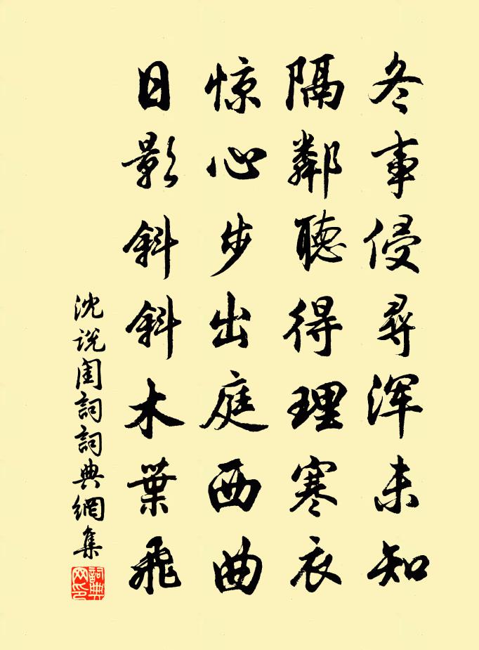 詩詞名句歷史字典書法欣賞書法字典國語詞典說文解字康熙字典古漢語字典標 題 作 者 詩 句 閨詞作者:沈說 朝代:宋代閨詞原文冬事侵尋渾未知,隔鄰聽得理寒衣。驚心步出庭西曲,日影斜斜木葉飛。詩詞問答問:閨詞的作者是誰?答:沈說問:閨詞寫於哪個朝代?答:宋代沈說閨詞書法欣賞閨詞書法作品詩詞推薦星名詩權德輿〔唐代〕虛懷何所欲,歲晏聊懶逸。雲翼謝翩翻,松心保貞實。風秋景氣爽,葉落井徑出。陶然美酒酣,所謂幽人吉。自當浣溪沙元好問〔金代〕芍藥初開百步香,小闌幽拚隔長廊。好花都屬富家郎。此樂莫教兒輩覺,老夫聊發少年狂。高燒銀燭照紅妝。鹿鳴小集奉餞赴省諸公曹彥約〔宋代〕便從場屋了經綸,看取朝家詔選掄。天賦忠良須努力,人生溫飽豈榮身。鼎來時事方憂國,到底儒冠不誤人。青紫李廷老席上送韓持國歸許昌梅堯臣〔宋代〕馬蹄踐霜華,游國歸何早。重裘不畏寒,況復非遠道。誰言未顧期,登第鬢如葆。解裝喜可知,月下金壺倒。樵童自入園來獻海棠因賦二章舒岳祥〔宋代〕只道嬌春日,誰知戰朔風。輕霜去人遠,愛景入枝花。依舊風情在,難將艷冶同。年年搖落後,來惱白頭翁。題涪陵楊彥廣薰風亭馮時行〔宋代〕身世如浮雲,百年一飄忽。古人事業在,已腐藁里骨。惜哉薰風亭,勁翰儼突兀。想當揮灑際,浩氣漲溟渤。迄茲景陽鍾二首劉子翬〔宋代〕景陽鍾動曉寒清,度柳穿花隱隱聲。三十六宮梳洗罷。卻吹殘燭待天明。道中得雨郭印〔宋代〕暖律潛開四序先,土牛何處不施鞭。道逢宿雨連新雨,人說今年勝舊年。和氣薰蒸還率土,堪恩汪濊仰高天。甲兵寄福州從事殷堯藩鮑溶〔唐代〕越嶺寒輕物象殊,海城台閣似蓬壺。幾回入市鮫綃女,終歲啼花山鷓鴣。雷令劍龍知去未,虎夷雲鶴亦來無。就中歸雁游酢〔宋代〕天末驚風急,江湖野思長。悲鳴愁絕塞,接翼冒風霜。澤岸多矰弋,雲間乏稻粱。茫然棲息地,飲啄欲何鄉。清明游張園桃李盛開獨梅花一株尚未零落釋善珍〔宋代〕傲寒開晚背時香,尋伴天荒地亦荒。不覺春風紅紫鬧,老翁偷入少年場。和集賢相公西溪侍宴觀競渡吳融〔唐代〕片水聳層橋,祥煙靄慶霄。晝花鋪廣宴,晴電閃飛橈。浪疊搖仙仗,風微定彩標。都人同盛觀,不覺在行朝。聞父訃二首釋了惠〔宋代〕眉毛蓋眼赤鬚鬍,女嫁男婚不識渠。唯是我儂偏孝順,十年不作問安書。迓客至大浪灘上陸游〔宋代〕小壟瓜蔓綠,短籬梅子黃。曉風掠水來,吹我醉面涼。平生蕭散意,未覺將迎忙。溪山供一笑,客主可相忘。寧當虞美人張孝祥〔宋代〕羅衣怯雨輕寒透。陡做傷春瘦。個人無奈語佳期。徙倚黃昏池閣、等多時。當初不似休來好。來後空煩惱。倩人傳贈陸元象文學強至〔宋代〕漢世最優文學掾,因君官稱復榮今。青春事業收名路,白首光華照士林。風月每邀花底醉,乾坤共老水邊吟。安車阮郎歸朱敦儒〔宋代〕柳花陌上拈明璫。嬌紅新樣妝。匆匆曾貯一襟香。月痕金縷涼。分淚扇,掩離觴。春殘人斷腸。錦書難寄雁飛忙。淨相蘭若僧師雅持塑佛疏緣化贈山偈二首張鎡〔宋代〕一語雅師聽取,插草已自完成。況是三間殿了,如何卻欠全身。雜曲歌辭。車遙遙張祜〔唐代〕東方曨曨車軋軋,地色不分新去轍。閨門半掩窗半空,斑斑枕花殘淚紅。君心若車千萬轉,妾身如轍遺漸遠。碧川和梁王眾傳張光祿是王子晉後身崔融〔唐代〕聞有沖天客,披雲下帝畿。三年上賓去,千載忽來歸。昔偶浮丘伯,今同丁令威。中郎才貌是,柱史姓名非。祗召名句推薦老農家貧在山住,耕種山田三四畝。張籍《野老歌 / 山農詞》 斷送落花三月雨,摧殘楊柳九秋霜。施耐庵《水滸傳·第十六回》 寒更承夜永,涼夕向秋澄。駱賓王《送別》 篳路藍縷,以啟山林。左丘明《左傳·宣公·宣公十二年》 姑蘇台上烏棲時,吳王宮裡醉西施。李白《烏棲曲》 千里江山昨夢非,轉眼秋光如許。文徵明《念奴嬌·中秋對月》 望天王降詔,早招安,心方足。宋江《滿江紅·喜遇重陽》 漸秋闌、雪清玉瘦,向人無限依依。李清照《多麗·詠白菊》 春衫著破誰針線,點點行行淚痕滿。黃公紹《青玉案·年年社日停針線》 人傷則離散,農傷則國貧。李大師、李延壽《南史·列傳·卷三十九》