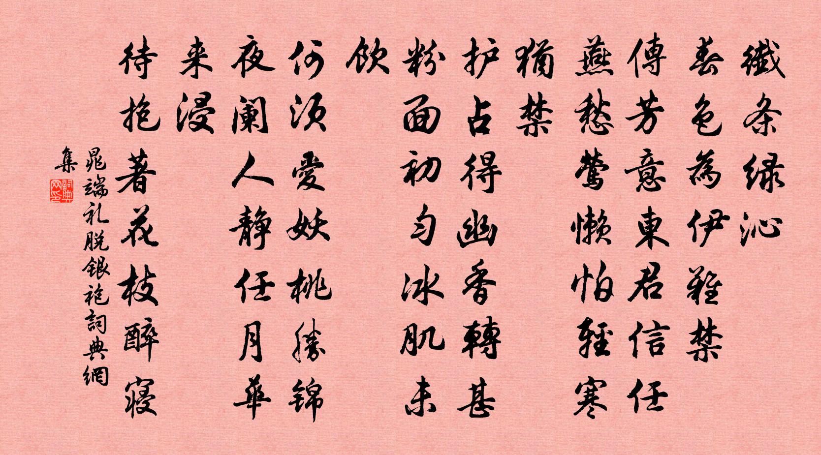詩詞名句歷史字典書法欣賞書法字典國語詞典說文解字康熙字典古漢語字典標 題 作 者 詩 句 脫銀袍作者:晁端禮 朝代:宋代脫銀袍原文纖條綠沁。春色為伊難禁。傳芳意、東君信任。燕愁鶯懶,怕輕寒猶禁。護占得、幽香轉甚。粉面初勻,冰肌未飲。何須愛、妖桃勝錦。夜闌人靜,任月華來浸。待抱著、花枝醉寢。詩詞問答問:脫銀袍的作者是誰?答:晁端禮問:脫銀袍寫於哪個朝代?答:宋代問:脫銀袍是什麼體裁?答:詞晁端禮脫銀袍書法欣賞脫銀袍書法作品詩詞推薦沁園春(壽許宰二月初一)程節齋〔宋代〕三百篇詩,三十六篇,以祈壽言。惟上天所佑,錫之君子,中心豈弟,蓋有仁存。允矣我公,韋平世胄,學問於茲碩人趙氏輓詩二首李彌遜〔宋代〕命服從夫貴,遺經易子成。苹蘩無失職,琴瑟自和鳴。已嘆歸同穴,猶悲夢兩楹。旁觀灑清淚,雙旐出寒城。臨江仙晏幾道〔宋代〕夢後樓台高鎖,酒醒簾幕低垂。去年春恨卻來時。落花人獨立,微雨燕雙飛。記得小苹初見,兩重心字羅衣。琵琶玉泉寺與潤上人望秋山懷張少尹武元衡〔唐代〕山寒天降霜,煙月共蒼蒼。況此綠岩晚,尚餘丹桂芳。禪心殊眾樂,人世滿秋光。莫怪頻回首,孤雲思帝鄉。貽柳惔詩蕭衍〔南北朝〕爾寔冠羣後。惟余實念功。偈頌一百二十三首釋普度〔宋代〕一佛出世,祥光布地。一念萬年,壽山增翠。曉來風起滿庭香,吹綻蟠桃三五蕊。【雙調】水仙子 春暮李致遠〔元代〕荼蘼香散一簾風,杜宇聲乾滿樹紅。南軒一枕梨雲夢。離魂千里同,日斜花影重重。萱草發無情秀,榴花開有恨清平樂趙汝茪〔宋代〕錦屏香褪。寒隱輕衫嫩。燕子護泥飛不穩。庭掩百花難認。雙雙繡帶微風。海棠此夜簾櫳。愁損一番寒食,小窗淡答侯少府高適〔唐代〕常日好讀書,晚年學垂綸。漆園多喬木,睢水清粼粼。詔書下柴門,天命敢逡巡。赫赫三伏時,十日到鹹秦。褐衣沁園春丘處機〔元代〕列鼎雄豪,兔走烏飛,轉頭悄然。似電光開夜,雲中乍閃,晨霜迎日,草上難堅。立馬文章,題橋名譽,恍惚皆如示禪人釋慧遠〔宋代〕懸崖捉拍舞三台,死虎驚忙眼豁開。聖地不生凡草木,果然親見瞎堂來。和陸郎中放翁韻姜特立〔宋代〕遙知三徑長荒苔,解組東歸亦快哉。津岸紛紛群吏去,船頭袞袞好山來。平時佳客應相過,勝日清尊想屢開。若許木蘭花慢 秦淮,次湯碧山教授韻許有壬〔元代〕問東來何處,控吳越,壯江淮。愛十里縈紆,水雲圖畫,鼓吹風雷。回頭下臨無地,盡朱樓迢隔倚天開。酒旆高懸巫山一段雲馬鈺〔元代〕玉線穿三穴,金針透九關。自然得見內容顏。雲神憑朱欄。正看瓊花爛熳。驀地青衣叫喚。紫微詔下赴蓬萊。仙籍水龍吟 次韻答馬觀復左司九日劉敏中〔元代〕二毫侍側何知,舉頭一幕青天大。歸盤樂矣,丁寧更說,閒居粉黛。我見沙鷗,蓋嘗有問,無言意對。道試看自古三山次鄭德予韻朱槔〔宋代〕日腳微明雨腳疏,誰將雲夢賦相如。西南山好君知不,一見全勝讀異書。鹿伯可郎中園池雜詠見一堂樓鑰〔宋代〕靈澈清詩千載傳,始聞林下有斯賢。傍人只道休官早,見一名堂已十年。扇子詩李石〔宋代〕子美來投蜀錦坊,蜀人滿口說文章。卿雲已後成機杼,不是無才賦海棠。十詩謝寥計使陳造〔宋代〕偓佺地上仙,笙鶴不我遐。楚騷俗命仆,古詩無名家。晉當澤帝范,小卻侈國華。本末計中外,倚須拜亨嘉。人月圓 三衢道中有懷會稽 北曲聊樂府前集今張可久〔元代〕松風十里雲門路,破帽醉騎驢。小橋流水,殘梅剩雪,清似西湖。而今杖履,青霞洞府,白髮樵夫。不如歸去,香名句推薦倩何人喚取,紅巾翠袖,搵英雄淚!辛棄疾《水龍吟·登建康賞心亭》 撥雲尋古道,倚石聽流泉。李白《尋雍尊師隱居》 我閉南樓看道書,幽簾清寂在仙居。李白《早秋單父南樓酬竇公衡》 甘露時雨,不私一物;萬民之主,不阿一人。呂不韋《呂氏春秋·紀·孟春紀》 離恨恰如春草,更行更遠還生。李煜《清平樂·別來春半》 急來抱佛腳,閒時不燒香。施耐庵《水滸傳·第十七回》 舞低楊柳樓心月,歌盡桃花扇底風。晏幾道《鷓鴣天·彩袖殷勤捧玉鍾》 春未綠,鬢先絲。人間別久不成悲。姜夔《鷓鴣天·元夕有所夢》 桃花落,閒池閣。山盟雖在,錦書難托。陸游《釵頭鳳·紅酥手》 名豈文章著,官應老病休。杜甫《旅夜書懷》