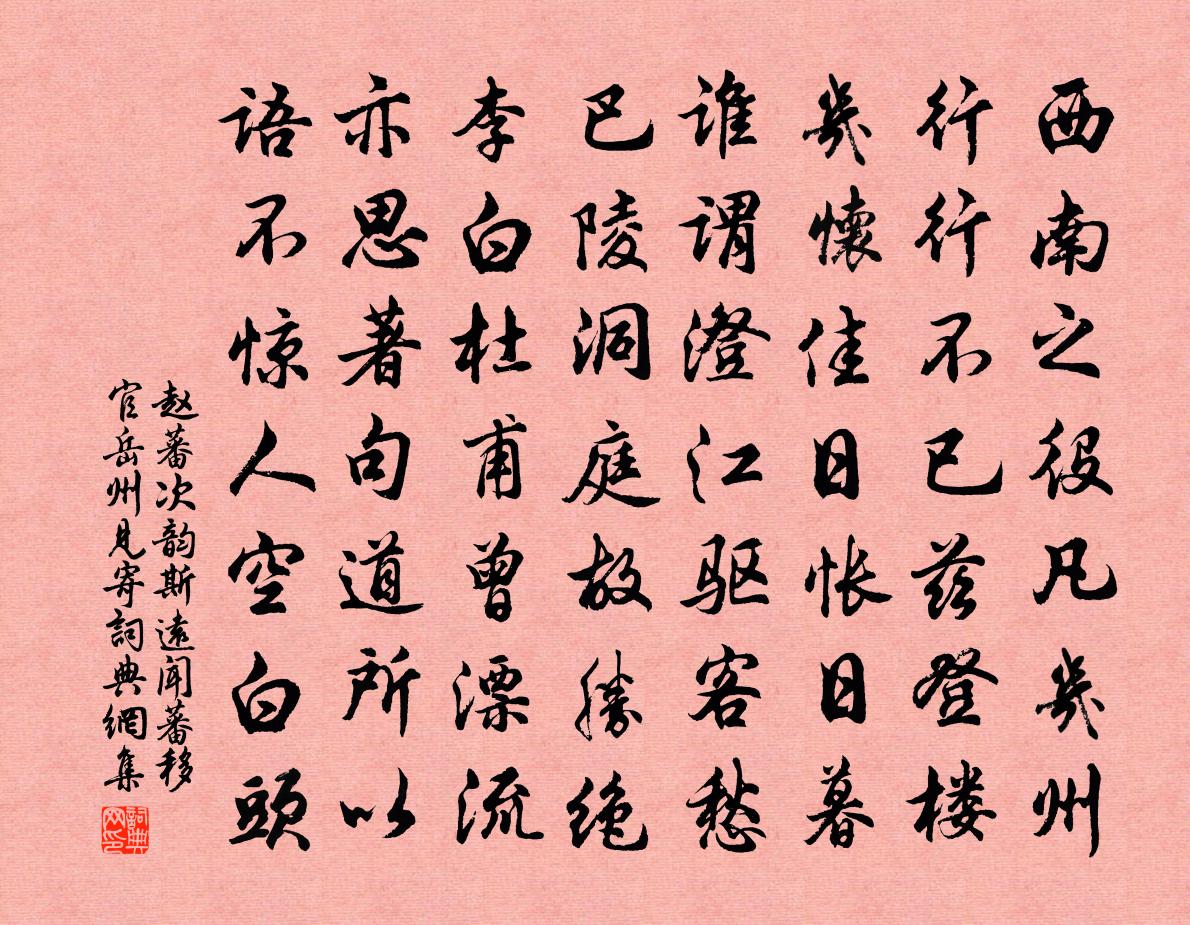 詩詞名句歷史字典書法欣賞書法字典國語詞典說文解字康熙字典古漢語字典標 題 作 者 詩 句 次韻斯遠聞蕃移官岳州見寄作者:趙蕃 朝代:宋代次韻斯遠聞蕃移官岳州見寄原文西南之役凡幾州,行行不已茲登樓。幾懷佳日悵日暮,誰謂澄江驅客愁。巴陵洞庭故勝絕,李白杜甫曾漂流。亦思著句道所以,語不驚人空白頭。詩詞問答問:次韻斯遠聞蕃移官岳州見寄的作者是誰?答:趙蕃問:次韻斯遠聞蕃移官岳州見寄寫於哪個朝代?答:宋代趙蕃次韻斯遠聞蕃移官岳州見寄書法欣賞次韻斯遠聞蕃移官岳州見寄書法作品詩詞推薦偈頌一百零九首釋可湘〔宋代〕平明始立秋,冷已到山頭。談風說露兮蜩蟬嘒急,詠砌吟牆兮蟋蟀聲浮。不作佛法商量,不作時景話會。觀世音菩句陳堯佐〔宋代〕風樵若耶路,霜橘洞庭秋。出山相贊釋如淨〔宋代〕摩耶落賺屙出來,撞入草窠打一回。誰知有屈叫不得,殃害兒孫作罪魁。溫泉宮鮑溶〔唐代〕憶昔開元天地平,武皇十月幸華清。山蒸陰火雲三素,日落溫泉雞一鳴。彩羽鳥仙歌不死,翠霓童妾舞長生。仍聞有所思韋應物〔唐代〕借問堤上柳,青青為誰春。空游昨日地,不見昨日人。繚繞萬家井,往來車馬塵。莫道無相識,要非心所親。句吳覺〔宋代〕燕頷英姿宜食肉,羊腸險韻宜剪茶。大雲岩張栻〔宋代〕平地直突兀,頹然若負龜。初疑斤斧鑿,安得此巧奇。乃知化工巧,精意運神機。岩深翠長滴,沖沖閱四時。游山陸游〔宋代〕蕭散湖山路,天教脫馽羈。蟬聲入古寺,馬影度荒陂。樵唱時傾耳,僧談亦解頤。偏門燈火鬧,不敢恨歸遲。夜書所見葉紹翁〔宋代〕蕭蕭梧葉送寒聲,江上秋風動客情。知有兒童挑促織,夜深籬落一燈明。次青溪後二章為別衛宗武〔宋代〕季世思良士,如拘渴與飢。峨峨章甫冠,瑞氣浮芝眉。粹然君子儒,赴我同襟期。凡林非鸞棲,丹穴仍歸飛。恨無打鰣魚吳嘉紀〔清代〕打鰣魚,供上用。船頭密網猶未下,官長已鞴驛馬送。櫻桃入市筍味好,今歲鰣魚偏不早。觀者倏忽顏色歡,玉鱗詠宣律和尚袈裟張希復〔唐代〕共覆三衣中夜寒,披時不鎮尼師壇。無因蓋得龍宮地,畦里塵飛葉相殘。聞王景彝雪中禖祀還梅堯臣〔宋代〕二月漫漫雪,齋宮夜寂寥。壇場祠乙鳥,桑柘響陰梟。履帶春泥重,駒回廣野驕。還批五色詔,池上踏瓊瑤。蜃蟠嶺陳岩〔宋代〕迤邐岡巒迅下馳,縈迴蟠結幾蛟螭。終然鼓勇歸滄海,只待風雷借便時。薔薇鄭剛中〔宋代〕一架薔薇四面垂,花工不苦費胭脂。淡紅點染輕隨粉,浥偏幽香清露知。蒙恩監南嶽廟劉克莊〔宋代〕久問嫖姚乞退閒,今朝準敕放生還。人欺解罷青油幕,帝遣監臨紫蓋山。營卒展辭回玉帳,林僧講賀到柴關。丈夫夏夜露坐白玉蟾〔宋代〕披襟岸幘藕花橋,一片哀鴻度碧霄。新月出來真解事,嫩蟬吟得自無聊。少年行三首·其三李白〔唐代〕君不見淮南少年遊俠客,白日球獵夜擁擲。呼盧百萬終不惜,報仇千里如咫尺。少年遊俠好經過,渾身裝束皆綺羅出山相贊釋普濟〔宋代〕龍章鳳質出王宮,肘露衣穿下雪峰。智原必空諸有界,不知諸有幾時空。過沔池驛李復〔宋代〕崤陵皋墓幾摧輪,秋暮重過白髮新。小雨廉纖能滑徑,亂山回互欲迷人。客心苦厭孤程晚,驛舍頻來舊吏親。明日名句推薦待到秋來九月八,我花開後百花殺。黃巢《不第後賦菊》 秋風吹到江村,正黃昏,寂寞梧桐夜雨不開門。顧彩《相見歡·秋風吹到江村》 大雪北風催,家家貧白屋。環山樵《薛寶釵·雪竹》 重五山村好,榴花忽已繁。陸游《乙卯重五詩》 又是羊車過也,月明花落黃昏黃升《清平樂·宮怨》 何期小會幽歡,變作離情別緒。柳永《晝夜樂·洞房記得初相遇》 天地無全功,聖人無全能,萬物無全用。列子及其弟子《列子·天瑞》 堪怨王孫,不記歸期早。梅堯臣《蘇幕遮·草》 圓荷浮小葉,細麥落輕花。杜甫《為農》 曉窗移枕,酒困香殘,春陰簾卷。吳文英《燭影搖紅·元夕雨》