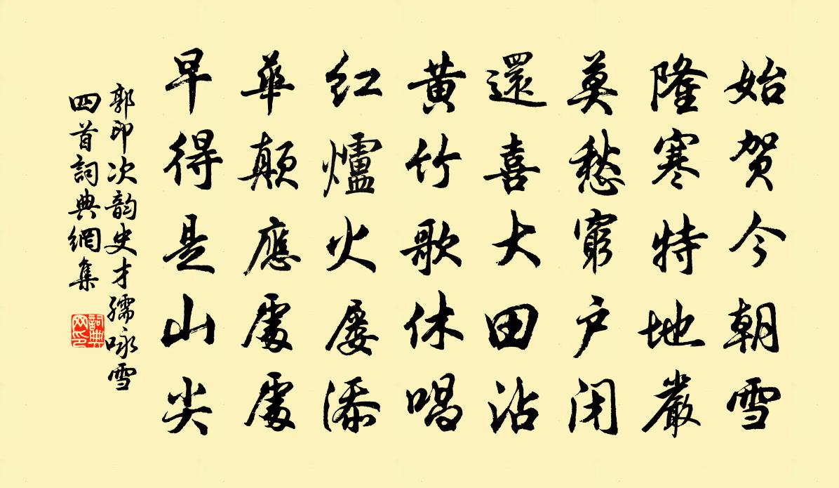 詩詞名句歷史字典書法欣賞書法字典國語詞典說文解字康熙字典古漢語字典標 題 作 者 詩 句 次韻史才孺詠雪四首作者:郭印 朝代:宋代次韻史才孺詠雪四首原文始賀今朝雪,隆寒特地嚴。莫愁窮戶閉,還喜大田沾。黃竹歌休唱,紅爐火屢添。華顛應處處,早得是山尖。詩詞問答問:次韻史才孺詠雪四首的作者是誰?答:郭印問:次韻史才孺詠雪四首寫於哪個朝代?答:宋代郭印次韻史才孺詠雪四首書法欣賞次韻史才孺詠雪四首書法作品詩詞推薦熱郭印〔宋代〕落日暑猶劇,虛亭風不來。半身流汗雨,兩耳聒蚊雷。扇手何曾歇,漿甌未放回。疇能呼屏翳,一霎盪炎埃。襄州道間驟寒李曾伯〔宋代〕涉盡江湖道,嗟嗟寸步難。風敲蘆葉響,雨作菊花寒。市酒無嫌薄,征衣正怯單。家山在何許,回首路漫漫。天意吟邵雍〔宋代〕天意無佗只自然,自然之外更無天。不欺誰怕居暗室,絕利須求在一源。未吃力時猶有說,到收功處更何言。聖人竹枝劉禹錫〔唐代〕山桃紅花滿山頭,蜀江春水拍山流。花紅易衰似郎意,水流無限似儂情。金雀花宋祁〔宋代〕疊葉倚風綻,翩翾凌霧排。齊名仙母使,寫樣漢宮釵。青門路劉駕〔唐代〕青門有歸路,坦坦高槐下。貧賤自恥歸,此地誰留我。門開送客去,落日懶回馬。旅食帝城中,不如遠遊者。舟成金陵雪中劉過〔宋代〕風幻寒威夜撲人,曉看雲腳四垂陰。牧羝塞上功名淚,騎馬藍關竄逐心。冷麵不春愁菀結,凍須如鐵恐蕭森。書爐晦日宴遊杜審言〔唐代〕日晦隨蓂莢,春情著杏花。解紳宜就水,張幕會連沙。歌管風輕度,池台日半斜。更看金谷騎,爭向石崇家。番陽湖范成大〔宋代〕淒悲鴻雁來,泱漭魚龍蟄。雷霆一鼓罷,星斗萬里濕。波翻漁火碎,月落村舂急。折葦已紛披,衰楊尚僵立。長年送歐陽主簿赴官韋城四首蘇軾〔宋代〕出處年來恨不齊,一樽臨水記分攜。江湖咫尺吾將老,汝穎東流子卻西。和范孫閒行溪西得梅數花韻杜知仁〔宋代〕寒梅我故人,歲必以文會。涴墨尚可覆,未知凡幾醉。晚乃得此詩,山靈以為最。置身風月上,出語色香外。駕言為丘桂岩司門題和靖雪後看梅圖釋紹曇〔宋代〕破曉湖山入畫時,短蓬搖雪傍疏籬。一心只在梅花上,凍損吟身也不知。寄題孫氏碧鮮亭范仲淹〔宋代〕天地何風流,復生王子猷。黃金買碧鮮,綠玉排清秋。非木亦非草,東君歲寒實。耿耿金石性,雪霜不能老。清風至後入城道中雜興十首楊萬里〔宋代〕春時宿處雨浪浪,至後重投張氏莊。際晚烏銀何許買,夕陽特地戀寒窗。雪峰寺樂雷發〔宋代〕擬尋岣嶁看蟠螭,且解青鞋濯禹溪。弔古猶疑九枝柏,談禪且問一莖虀。虎抓崖樹供僧爨,猿摸廊碑認客題。應接永夜感懷寄鄭谷郎中齊己〔唐代〕展轉復展轉,所思安可論。夜涼難就枕,月好重開門。霜殺百草盡,蛩歸四壁根。生來苦章句,早遇至公言。觀物吟邵雍〔宋代〕淳厚之人少秀慧,秀慧之人少審諦。安得淳厚又秀慧,與之共話人間事。感皇恩姬翼〔元代〕著腳軟紅塵,心君懊惱。占得時光有多少。窮通利害,得失存亡翻攪。使機關見解、何時了。爭似去來,岩阿靜悄癸丑七月二十七夜夢遊華岳廟陸游〔宋代〕驛樹秋風急,關城暮角悲。平生忠憤意,來拜華山祠。秋夜對月王之道〔宋代〕青廓經新雨,扶疏桂影秋。夜涼山色靜,風細水光浮。坐久因忘寐,詩成得散愁。願言乘此興,同賦庾公樓。名句推薦疊嶂西馳,萬馬迴旋,眾山欲東。辛棄疾《沁園春·靈山齋庵賦時築偃湖未成》 慈母倚門情,遊子行路苦。王冕《墨萱圖·其一》 不說自己井繩短,反說他人箍井深。佚名《增廣賢文·下集》 淥水明秋月,南湖采白蘋。李白《淥水曲》 已向丹霞生淺暈,故將清露作芳塵。睦石《玉蘭》 絲長魚誤恐,枝弱禽驚踐。崔護《五月水邊柳》 秋霜切玉劍,落日明珠袍李白《白馬篇》 舉觴酹先酒,為我驅憂煩。柳宗元《飲酒》 公生明,偏生暗荀子《荀子·不苟》 古人不見今時月,今月曾經照古人。佚名《增廣賢文·上集》