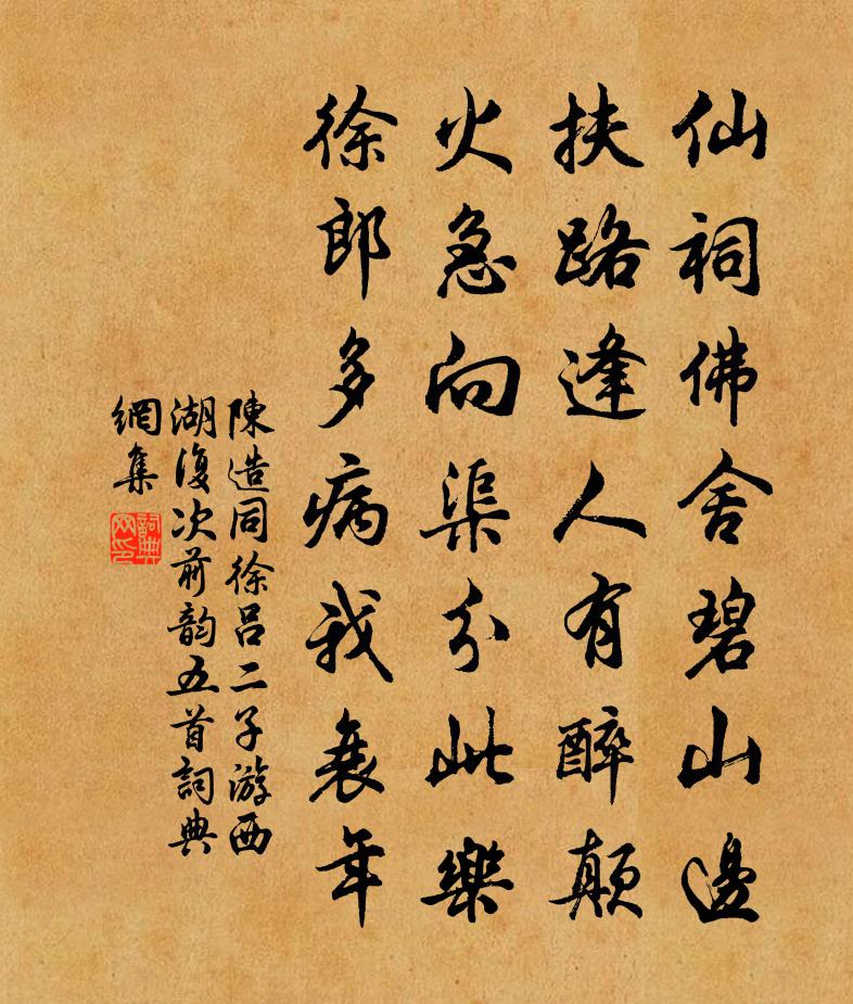 詩詞名句歷史字典書法欣賞書法字典國語詞典說文解字康熙字典古漢語字典標 題 作 者 詩 句 同徐呂二子游西湖複次前韻五首作者:陳造 朝代:宋代原文仙祠佛舍碧山邊,扶路逢人有醉顛。火急向渠分此樂,徐郎多病我衰年。詩詞問答問:《同徐呂二子游西湖複次前韻五首》的作者是誰?答:陳造問:該詩寫於哪個朝代?答:宋代書法欣賞同徐呂二子游西湖複次前韻五首書法作品詩詞推薦閒居雜詠三十二首仁陳淳〔宋代〕仁人之安宅,在心本全德。要常處於中,不可違終食。題王起宗大橫披水墨作遠淡勢方回〔宋代〕臥龍峰下草廬幽,門外橋橫水自流。瀟灑王郎只數筆,淡雲疏樹一天秋。齊雩祭歌 青帝 一謝朓〔南北朝〕營翼日。鳥殷宵。凝冰泮。玄蟄昭。八關齋詩沈約〔南北朝〕因戒倦輪飄。習障從塵染。四衢道難辟。八正扉猶掩。得理未易期。失路方知險。迷塗既已復。豁悟非無漸。思婦吟蘇拯〔唐代〕秋風雁又歸,邊信一何早。攬衣出門望,落葉滿長道。一從秉箕帚,十載孤懷抱。可堪日日醉寵榮,不說思君令人和魯漕春雨有感三首吳芾〔宋代〕我心雖老尚如童,春到惟思笑語同。正欲對花歌且舞,那知通夕雨兼風。千疇固喜俱沾足,百卉還愁一掃空。安得樂園假寐李新〔宋代〕藍天聲去復回,蟲絲長復短。江村石枕冷,一睫春夢斷。明朝騎馬且重來,日遲更為楊花暖。送崇教大師回天台阮思道〔宋代〕碧雲高價徹天涯,珪璧清無一點瑕。雙闕再承新雨露,三吳重賞舊煙霞。水軒散味朝賢句,松院分嘗御府茶。聞說自述陸游〔宋代〕古井無由浪,浮雲一掃空。詩書修孔業,場圃嗣豳風。懼在饑寒外,憂形寤寐中。吾年雖日逝,猶冀有新功。句杜去輕〔宋代〕緣曾分明種,故發入雲香。秋晚雜書三十首方回〔宋代〕屈子悼芙蓉,胡於木末采。誰歟變秋樹,水花儼高塏。本非蓮藕類,稍稍具姿彩。厥植亦匪貞,朝澤暮已痗。叔世詠史詩七里灘胡曾〔唐代〕七里青灘映碧層,九天星象感嚴陵。 * 上無絲竹,不是高人誰解登?重葉梅辛棄疾〔宋代〕百花頭上開,冰雪寒中見。霜月定相知,先識春風面。贈任肅李鹹用〔唐代〕玄發難姑息,青雲有路岐。莫言多事日,虛擲少年時。松色雪中出,人情難後知。聖朝公道在,中鵠勿差池。七十八詠六言十首劉克莊〔宋代〕心炎寵辱交戰,骨朽是非乃公。物議糞土伯始,史筆芳馨兩龔。昌國秩滿次陳糾祖行韻一首王阮〔宋代〕昔之督郵逐彭澤,今之督郵眷昌國。不令自賦歸去來,更以新詩祖行色。開緘墨濕雨濛濛,細讀字字含清風。塵埃賀聖朝 靜夜丘處機〔元代〕夕陽沉後,隴收殘照,柏鎖寒煙。向南溪獨坐,順風長聽,一派鳴泉。迢迢永夜,事忘閒性,琴弄無弦。待雲中、光穆皇后輓歌三首徐鉉〔唐代〕永樂留虛位,長陵啟夕扉。返虞嚴吉仗,復土掩空衣。功業投三母,光靈極四妃。唯應彤史在,不與露花晞。上知府石太尉二首魏野〔宋代〕陝城天險枕河湄,茆土真風勝暫知。雲霧雖頻沾虎節,雪霜全未染虬髭。白霓放作軍中練,紅袖行為帳下旗。公暇山居詩釋延壽〔宋代〕幽棲豈可事徒然,盡諷蓮經夜坐禪。吟裹有聲皆實相,定中無境不虛玄。直教似月臨千界,還遣如空度萬緣。從此名句推薦好言難得,惡語易施。佚名《增廣賢文·上集》 白骨露於野,千里無雞鳴。曹操《蒿里行》 母欺子,子而不信其母,非以成教也。韓非及後人《韓非子·外儲說左上》 夜雨剪春韭,新炊間黃粱。杜甫《贈衛八處士》 福壽康寧,固人之所同欲;死亡疾病,亦人所不能無。程登吉《幼學瓊林·卷三·疾病死喪》 致君堯舜上,再使風俗淳。杜甫《奉贈韋左丞丈二十二韻》 歲寒,然後知松柏之後凋也。孔子弟子《論語·子罕篇》 積雪覆平皋,飢鷹捉寒兔。孟浩然《南歸阻雪》 白髮漁樵江渚上,慣看秋月春風。楊慎《臨江仙·滾滾長江東逝水》 潭潭大度如臥虎,邊頭耕桑長兒女黃庭堅《送范德孺知慶州》