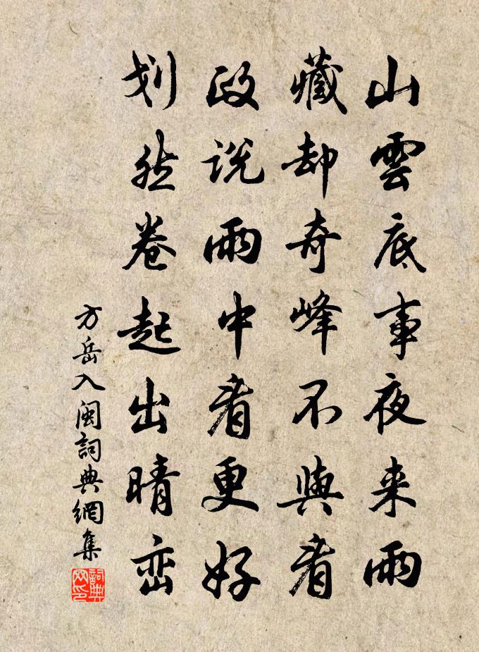 詩詞名句歷史字典書法欣賞書法字典國語詞典說文解字康熙字典古漢語字典標 題 作 者 詩 句 入閩作者:方岳 朝代:宋代入閩原文山雲底事夜來雨,藏卻奇峰不與看。政說雨中看更好,劃然捲起出晴巒。詩詞問答問:入閩的作者是誰?答:方岳問:入閩寫於哪個朝代?答:宋代方岳入閩書法欣賞入閩書法作品詩詞推薦下江董嗣杲〔宋代〕下江值雲簇,水色透沙清。掛席風勢烈,兩岸無人行。野市門多關,久絕雞犬聲。時勢驅之然,茫昧嗟予生。興懷送鄭十二還廬山別業劉長卿〔唐代〕潯陽數畝宅,歸臥掩柴關。谷口何人待,門前秋草閒。忘機賣藥罷,無語杖藜還。舊筍成寒竹,空齋向暮山。水流謝王道濟惠古詩古石器司馬光〔宋代〕緱氏古城裡,好道王道濟。作詩有古風,讀書知古意。朝來遺僕夫,遺我古石器。結從天地初,生自一拳際。工倕李白書堂陳岩〔宋代〕蘭芷春風滿地香,謫仙曾臥白雲鄉。山間精爽今猶在,落月時時見屋樑。殘句:便令脫帽管城公黃庭堅〔宋代〕便令脫帽管城公,小試玉堂揮翰手。早秋出塞寄東台詳正學士駱賓王〔唐代〕促駕逾三水,長驅望五原。天階分斗極,地理接樓煩。溪月明關隴,戎雲聚塞垣。山川殊物候,風壤異涼暄。戍古憶菊曹雪芹〔明代〕悵望西風抱悶思,蓼紅葦白斷腸時。空籬舊圃秋無跡,瘦月清霜夢有知。念念心隨歸雁遠,寥寥坐聽晚砧痴。誰憐句跨犢者〔宋代〕有酒便嘗烹筍蕨,無花聊自賞桑麻。謝王大夫奏表方乾〔唐代〕非唯言下變榮衰,大海可傾山可移。如剖夜光歸暗室,似驅春氣入寒枝。死灰到底翻騰焰,朽骨隨頭卻長肥。便殺固窮劉克莊〔宋代〕狎邪早不由三閣,崛強今難事五樓。寧伴伯夷山下餓,豈隨徐福海中求。漾陂晚望司馬扎〔唐代〕遠客家水國,此來如到鄉。何人垂白髮,一葉釣殘陽。柳暗鳥乍起,渚深蘭自芳。因知帝城下,有路向滄浪。飯溪石葛紹體〔宋代〕一石類古鐘,范模昔誰制。開闢幾歲月,蘿蔓疑篆隸。老木上婆娑,清泉下溶{左氵右裔}。左右亂石列,拱若朝同徐呂二子游西湖複次前韻五首陳造〔宋代〕老去胡宜誓酒卮,興來破戒為君持。自今排日花羊醉,報答春光已後時。觀三王吟邵雍〔宋代〕一片中原萬里餘,殆非孱德所宜居。夏商正朔猶能布,湯武干戈未便驅。澤火有名方受革,水天無應不成需。詳知游虞山陳蒙〔宋代〕野店杏花紅滿枝,江南天氣早春時。青山笑我何何晚,白髮催人老不知。雲竇雪消龍澗滿,星壇樹偃鶻巢危。明朝餘杭界早發鄭起〔宋代〕早發促程期,籃輿帶月低。山中如白書,斗下渡清溪。群動霜初薄,四鄰雞未啼。惟聞兵遞舖,星急過淮西。郊行王同祖〔宋代〕牧牛童子坐田頭,摘草簪花兩兩謳。路繞青山山繞澗,殘蟬夕照澹於秋。次韻宋履中題李侯檀欒亭秦觀〔宋代〕陰陰數畝籜龍稠,亭外危通一徑幽。頗似竹林當日集,酒狂莫笑阮陳留。呈陳平仲華岳〔宋代〕達人安分樂平生,不與陰陽造化爭。漢節有人恭且止,楚盤無客遂當行。薦公地栗三杯酒,分我天香一味羹。大抵戲贈吳知伯洪邁〔宋代〕條侯得劇孟,吳楚坐可馘。我知無能為,失此一敵國。偉哉奇男子,俠氣橫八極。書生復何者,骯髒老筆墨。刺口名句推薦曾苦傷春不忍聽,鳳城何處有花枝李商隱《流鶯》 人法地,地法天,天法道,道法自然。老子《老子·道經·第二十五章》 待何年歸去,談笑各爭雄。顧太清《高山流水·次夫子清風閣落成韻》 銀鞍照白馬,颯沓如流星。李白《俠客行》 還作一段相思,冷波葉舞愁紅,送人雙槳。吳文英《解蹀躞·醉雲又兼醒雨》 雲盡月如練,水涼風似秋。歐陽詹《荊南夏夜水樓懷昭丘直上人云夢李莘》 香幃風動花入樓,高調鳴箏緩夜愁。王昌齡《青樓怨》 名聲若日月,功績如天地荀子《荀子·王霸》 何日請纓提銳旅,一鞭直渡清河洛。岳飛《滿江紅·登黃鶴樓有感》 圖未就之功,不如保已成之業洪應明《菜根譚·概論》