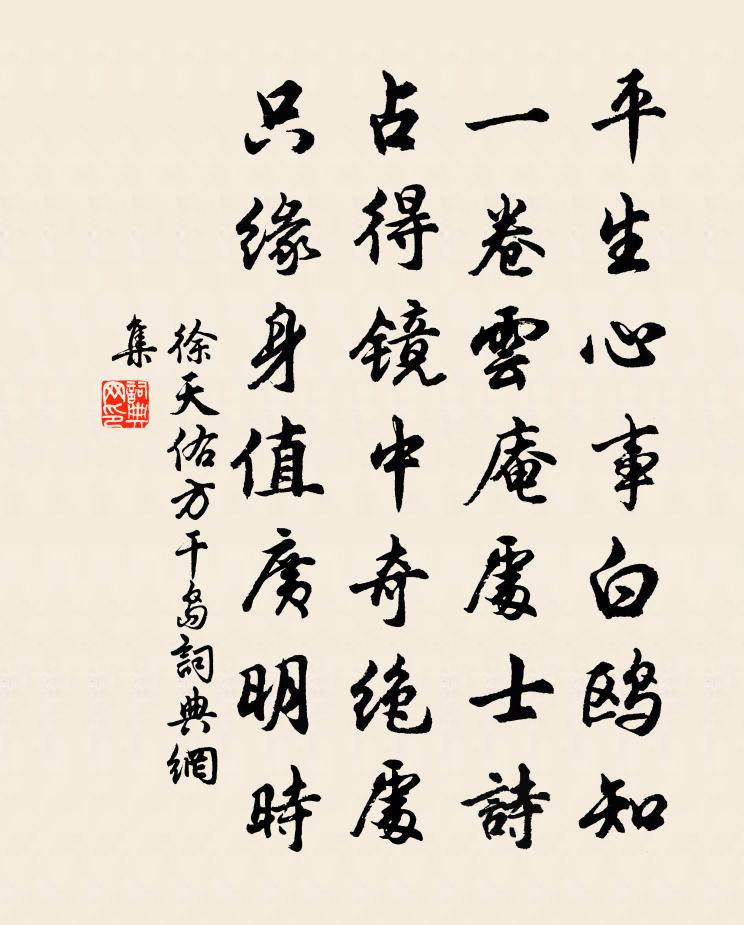 詩詞名句歷史字典書法欣賞書法字典國語詞典說文解字康熙字典古漢語字典標 題 作 者 詩 句 方乾島作者:徐天佑 朝代:宋代方乾島原文平生心事白鷗知,一捲雲庵處士詩。占得鏡中奇絕處,只緣身值廣明時。詩詞問答問:方乾島的作者是誰?答:徐天佑問:方乾島寫於哪個朝代?答:宋代徐天佑方乾島書法欣賞方乾島書法作品詩詞推薦好事近(鄭倅·生朝)韓淲〔宋代〕臘雪映江梅,冰玉更分風月。袞袞紫樞家世,慶誕彌時節。烘堂贏得戲萊衣,春酒寶杯凸。籍籍鄭莊人物,要漢廷偶書胡宏〔宋代〕一丘自足更何營,萬里福州長在眼。莫愁風景異山河,晴天雲蔭清峰晚。題石山人白居易〔唐代〕騰騰兀兀在人間,貴賤賢愚盡往還。膻膩筵中唯飲酒,歌鐘會處獨思山。存神不許三屍住,混俗無妨兩鬢斑。除卻過銀樹董嗣杲〔宋代〕買輿過銀樹,水落見潦跡。殘雪閃斜照,籬落掩魚澤。鳥飛山意冥,雁度水光碧。乘興覓酒壚,荒市絕餚核。入暮寄程可久丈趙蕃〔宋代〕聞道書少隨老,書遂為安國書居。逢人書難問似,近況復何如。此士猶松徑,何人在石渠。儒林有韓孟,待詔自嚴修身吟金朋說〔宋代〕克己工夫熟,磋磨日日新。形端儀表正,湯聖自盤銘。西江月(七夕後一日縣齋袓)郭應祥〔宋代〕巧節已成昨夢,今宵重倒芳尊。主賓和氣敵春溫。雄辯高談袞袞。剩把燭花高照,頻教舞袖輕翻。笛聲幽咽鼓聲喧送人隨姊夫任雲安令劉言史〔唐代〕閒逐維私向武城,北風青雀片時行。孤帆瞥過荊州岸,認得瞿塘急浪聲。偈頌七十六首釋師範〔宋代〕九日重陽節,東籬賞菊花。歌歡公子事,淡薄野僧家。與仲彌性同次唐人二詩韻李衡〔宋代〕盡日困登陟,跏趺聊對床。岩空眩層碧,草細函幽香。弔古謾秋思,開尊延月光。隨身不竿木,作戲且逢場。天面次韻諸公絕句陳造〔宋代〕琳宇無塵夜色鮮,露明叢菊月臨淵。世間人境雙清處,誦與西風更此編。湘中送人余靖〔宋代〕離謳方揭耳,別緒已悽然。草蔚湘纍浦,花殘蜀魄天。嶷山晴拂漢,啼竹冷澄煙。後夜思君意,空歌皓月篇。雜劇·楚昭王疏者下佚名〔元代〕第一折(沖末扮吳王領卒子上,詩云)太伯當年曾遜避,至今子姓居吳地。延陵何事慕高風,幾使孤家不承繼。某剡溪竹紙三首曾幾〔宋代〕會稽竹箭東南美,化作經黃紙疊層。舊日土毛無用處,剡中老卻一溪藤。如夢令石孝友〔宋代〕風獵亂香如掃。又是粉梅開了。庭戶鎖殘寒,夢斷池塘春草。情悄。情悄。簾外數聲啼鳥。相和歌辭。從軍行戎昱〔唐代〕昔從李都尉,雙鞬照馬蹄。擒生黑山北,殺敵黃雲西。太白沉虜地,邊草復萋萋。歸來邯鄲市,百尺青樓梯。感激客邸晝寢起而追程釋紹嵩〔宋代〕客裹無聊久合併,夢回南北昧平生。苦吟風月唯添病,獨冒煙嵐促去程。城外諸峰迎落照,花邊白犬吠流鶯。阮途山房春事二首岑參〔唐代〕風恬日暖盪春光,戲蝶游蜂亂入房。數枝門柳低衣桁,一片山花落筆床。梁園日暮亂飛鴉,極目蕭條三兩家。庭樹游虎丘蔣孝言〔宋代〕秀色迴環眼倍明,醒余灑面竹風清。快哉氣且吞雲夢,便欲飄然上玉京。和趙子輿龍州吏隱堂司馬光〔宋代〕四望逶迤萬疊山,微通雲棧落塵寰。誰知吏道自可隱,未必仙家有此閒。酒熟何人能共醉,詩成無事復相關。浮生名句推薦秋木萋萋,其葉萎黃,有鳥處山,集於苞桑。王昭君《怨詞》 攜來百侶曾游,憶往昔崢嶸歲月稠。 * 《沁園春·長沙》 乃翁知國如知兵,塞垣草木識威名。黃庭堅《送范德孺知慶州》 莫等閒,白了少年頭,空悲切!岳飛《滿江紅·寫懷》 舉目山河異,偏傷周顗情。李白《金陵新亭》 萬里煙塵。回首中原淚滿巾。朱敦儒《採桑子·彭浪磯》 峰巒如聚,波濤如怒,山河表里潼關路。張養浩《山坡羊·潼關懷古》 何當一夕金風起,為我掃除天下熱。施耐庵《水滸傳·第十六回》 富貴必從勤苦得,男兒須讀五車書。杜甫《柏學士茅屋》 香非在蕊,香非在萼,骨中香徹。晁補之《鹽角兒·亳社觀梅》